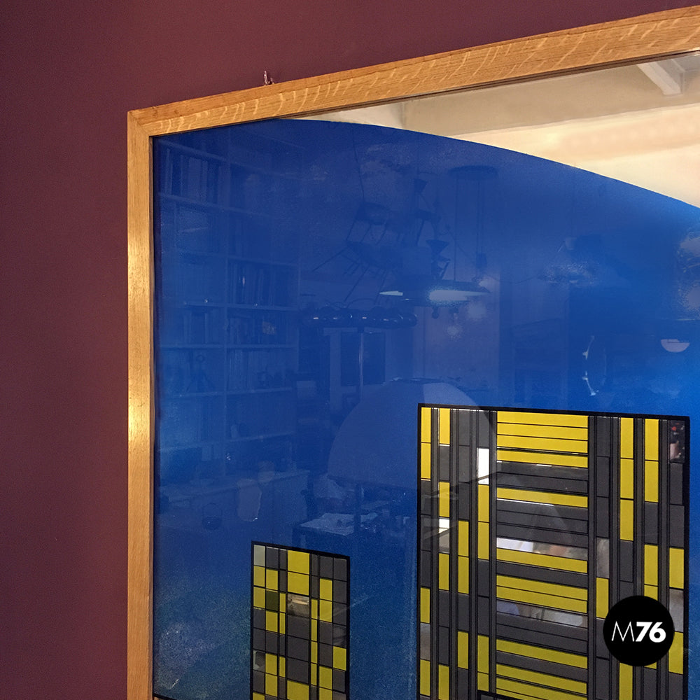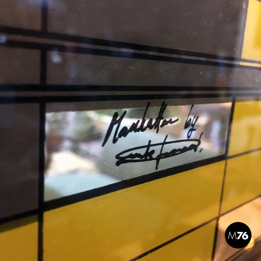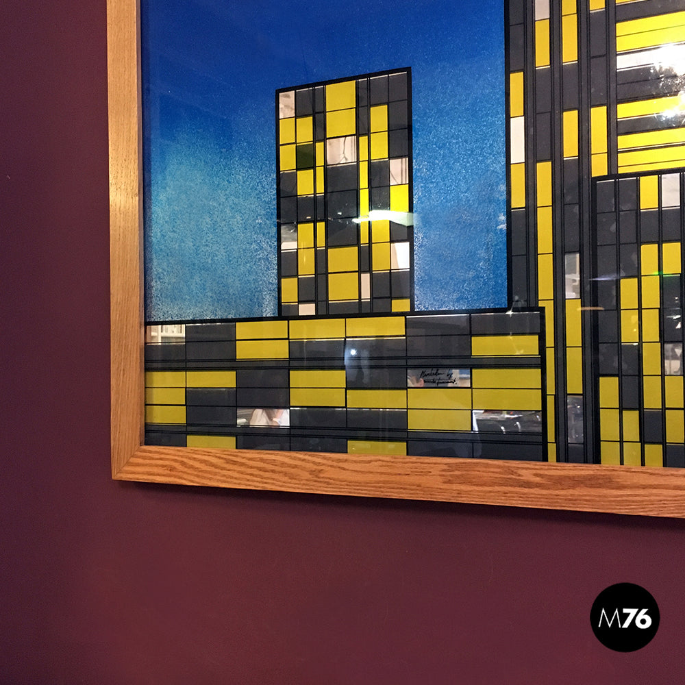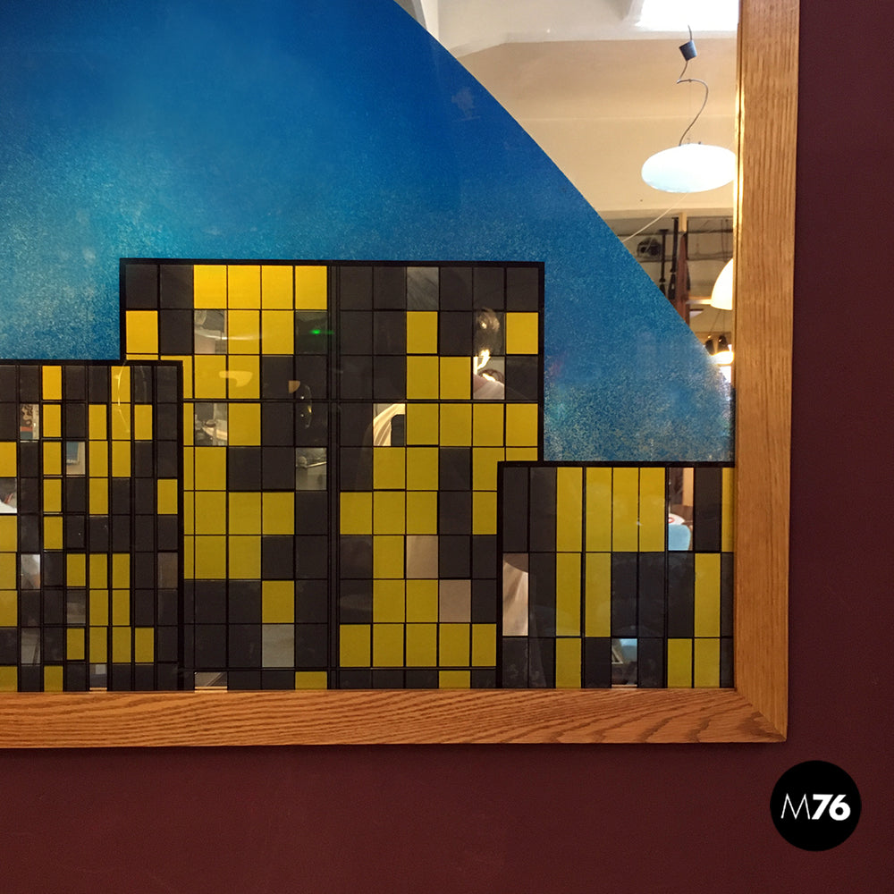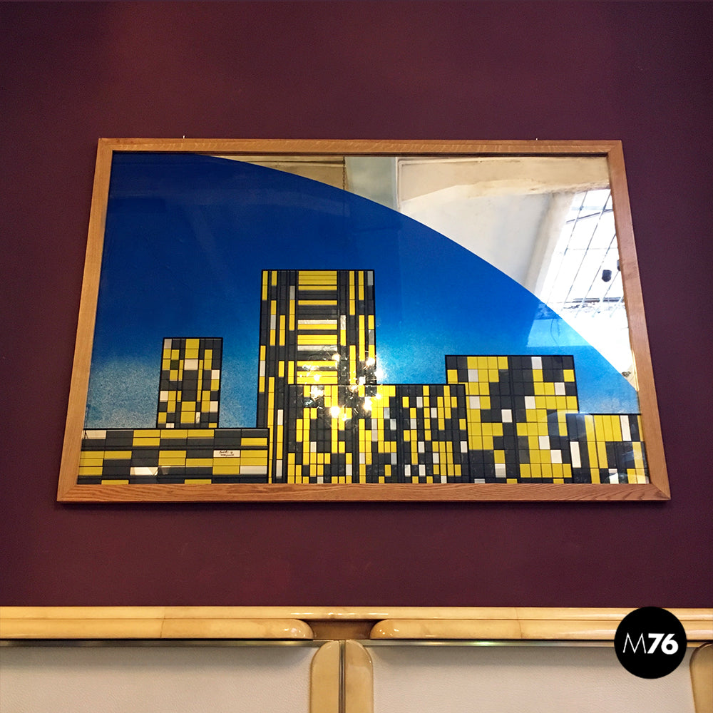 Specchio da parete decorativo con cornice in legno e vetro colorato raffigurante Manhattan come evidenziato dalla firma. Vetro colorato in blu nero e giallo.