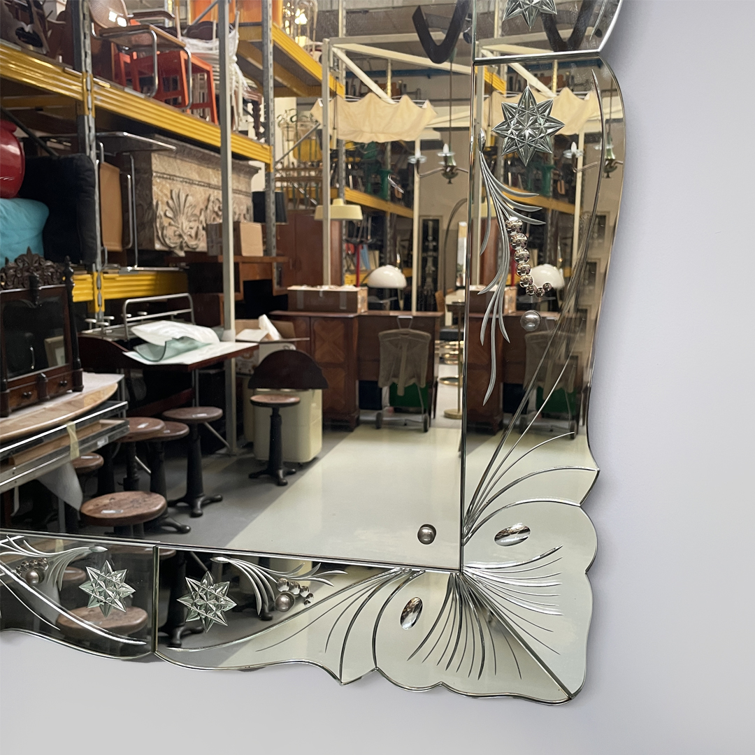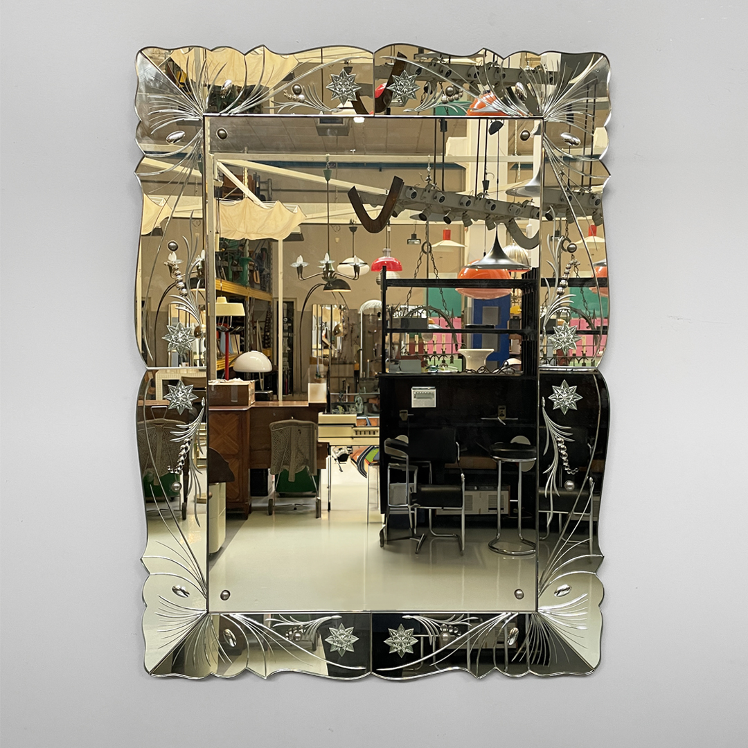 Specchio da parete rettangolare con acidature a forma di stelle e foglie. Struttura in legno con cornice in vetro specchiato.