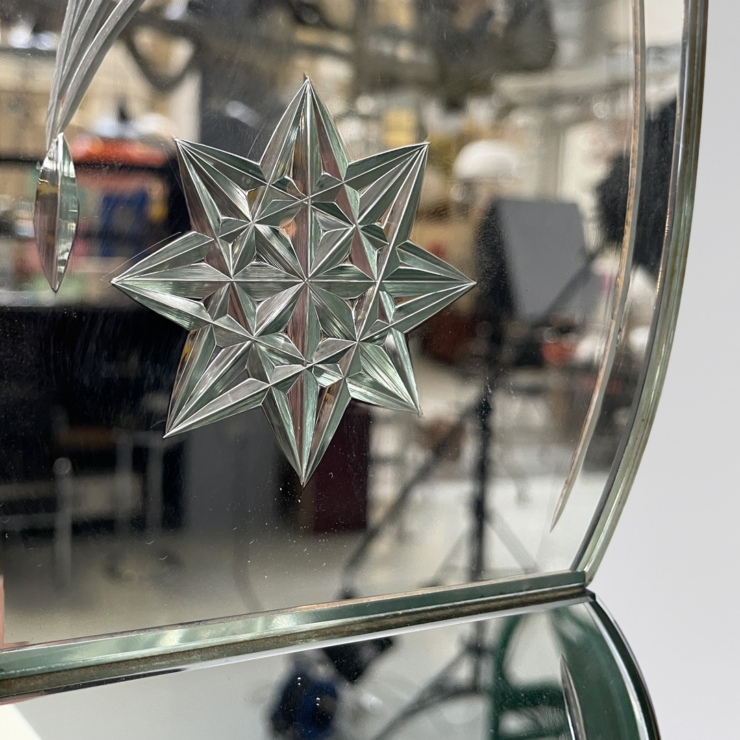 Sul profilo ondulato, composto da otto parti unite, ci sono decori a forma di foglia e stella a otto punte in specchio.