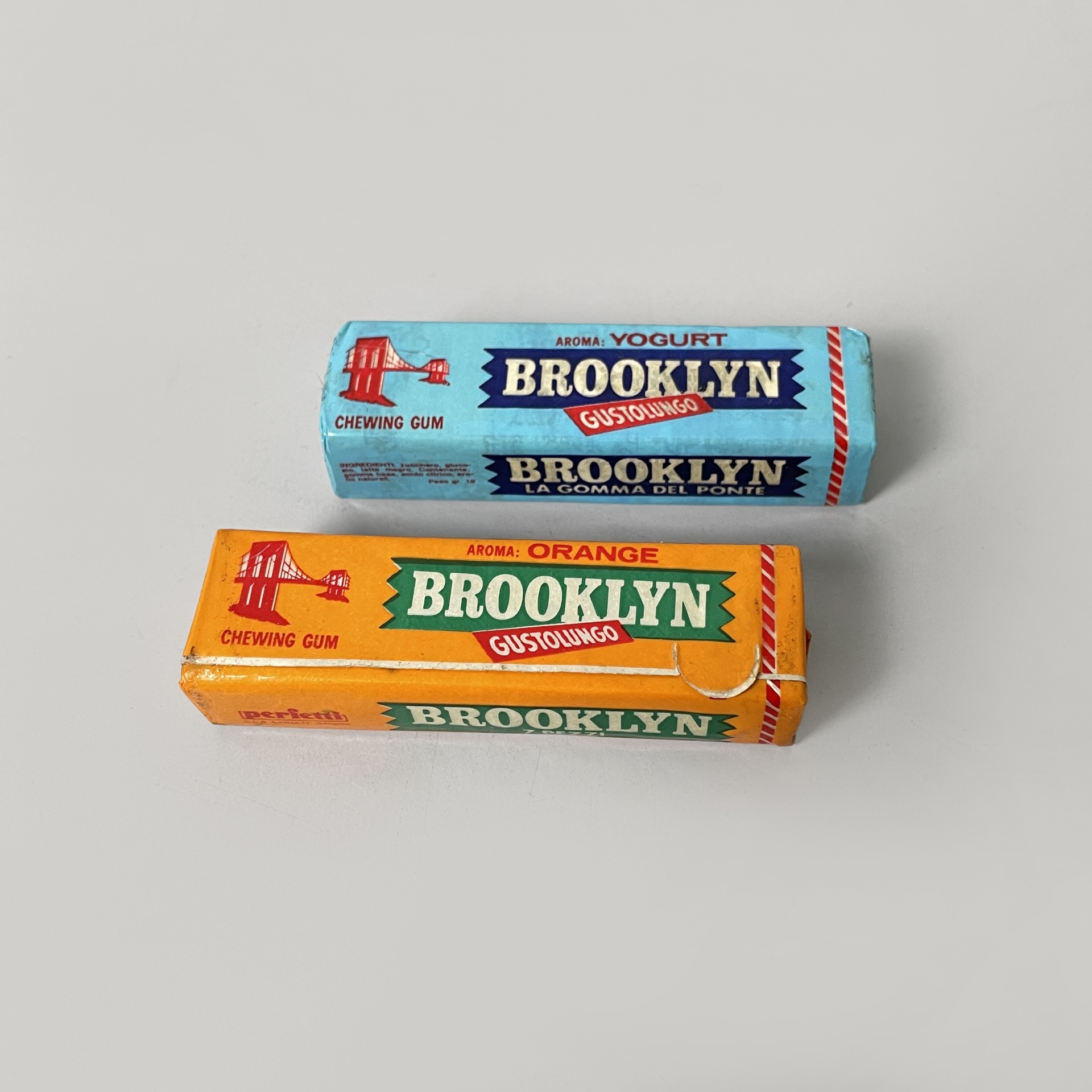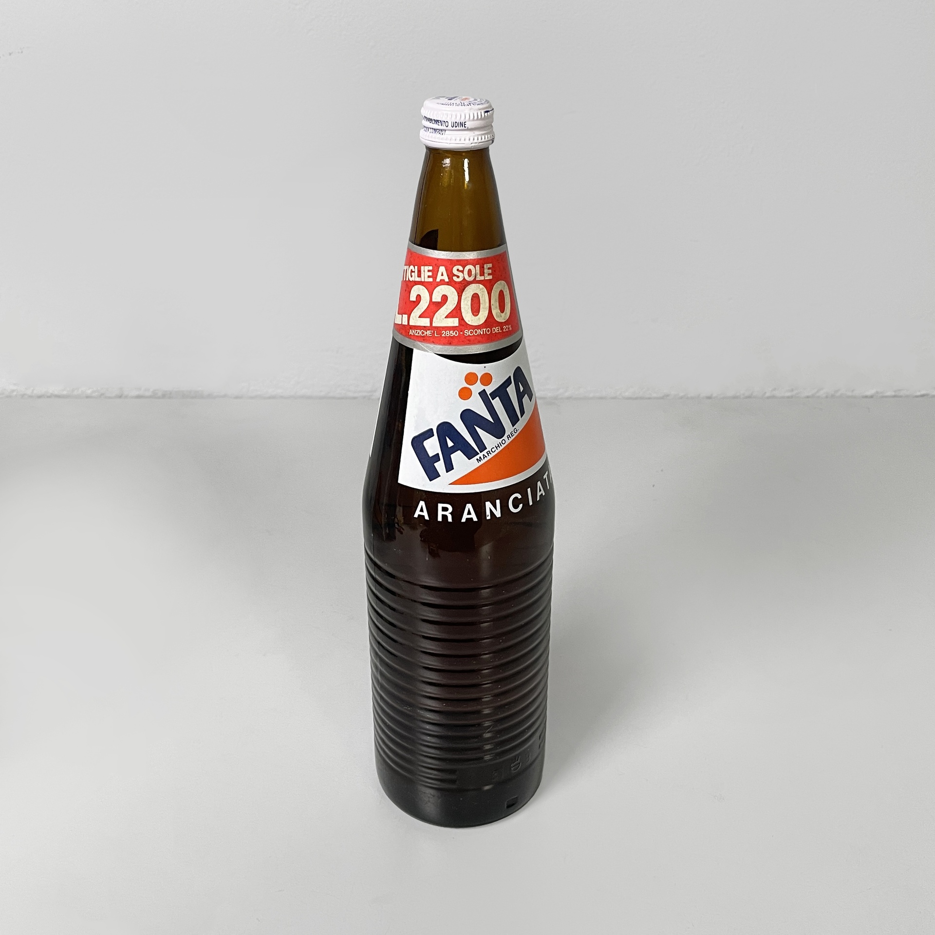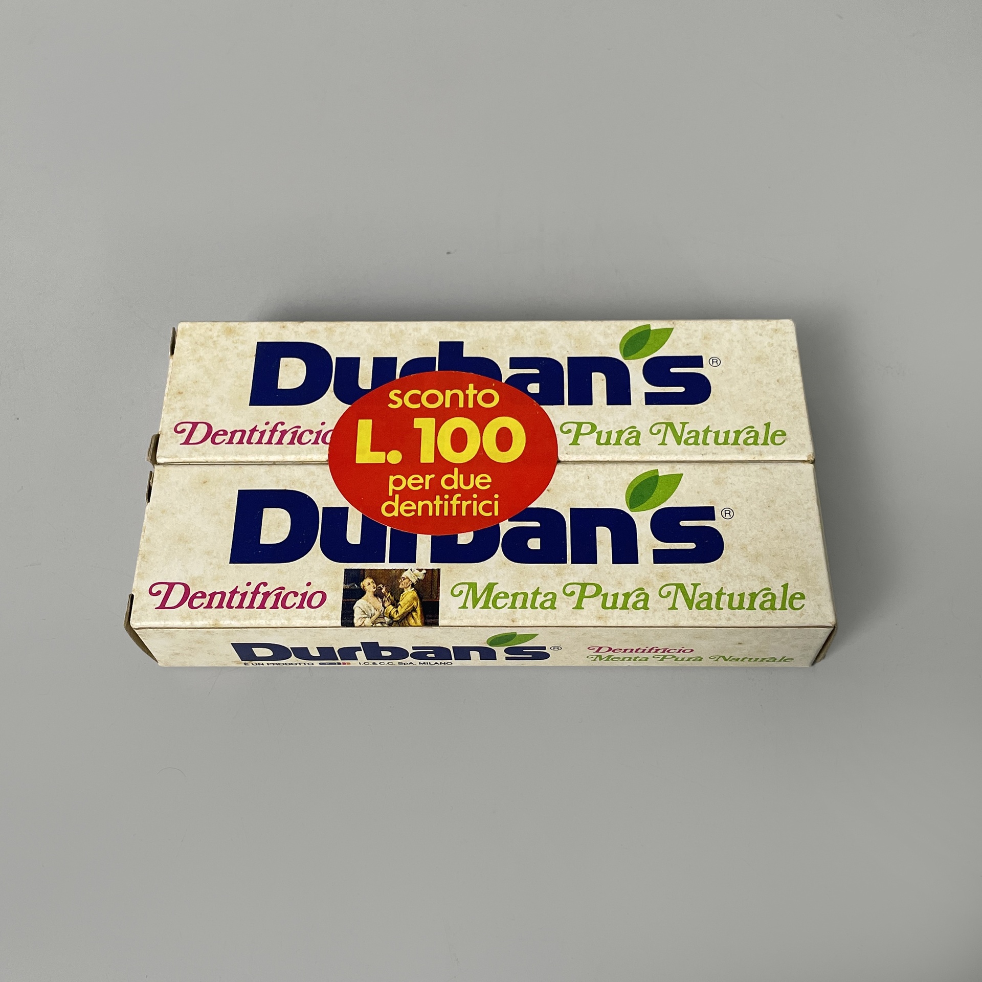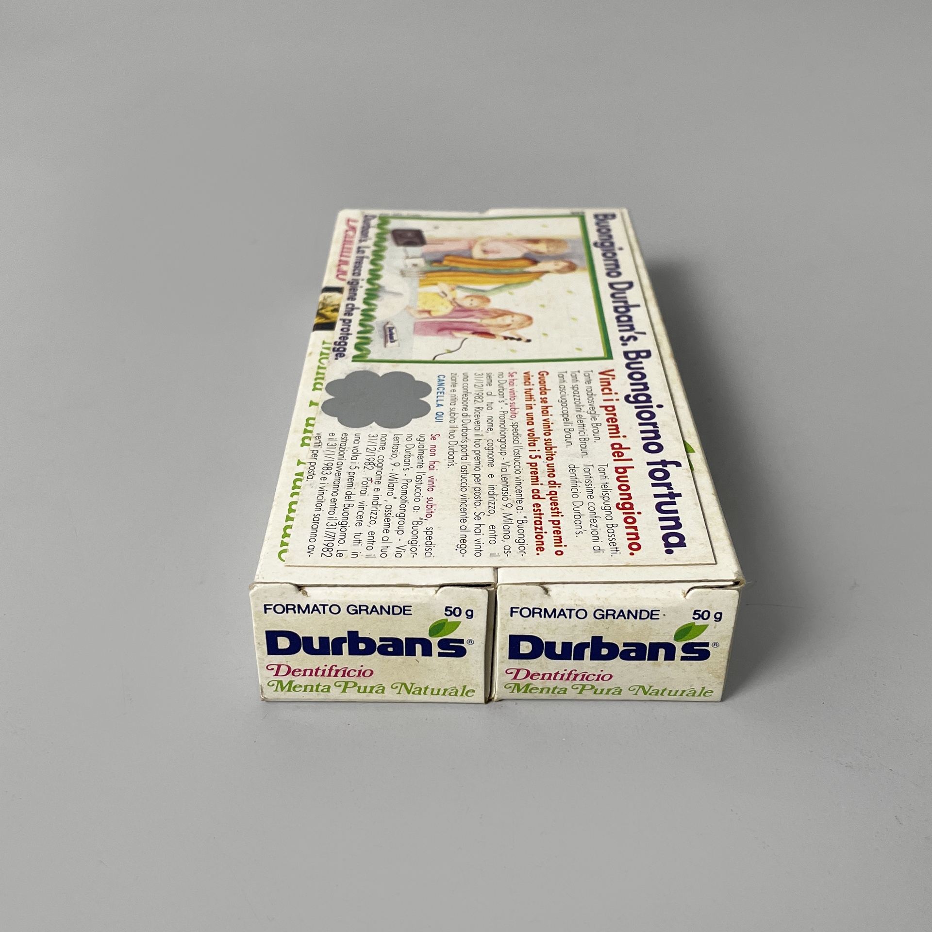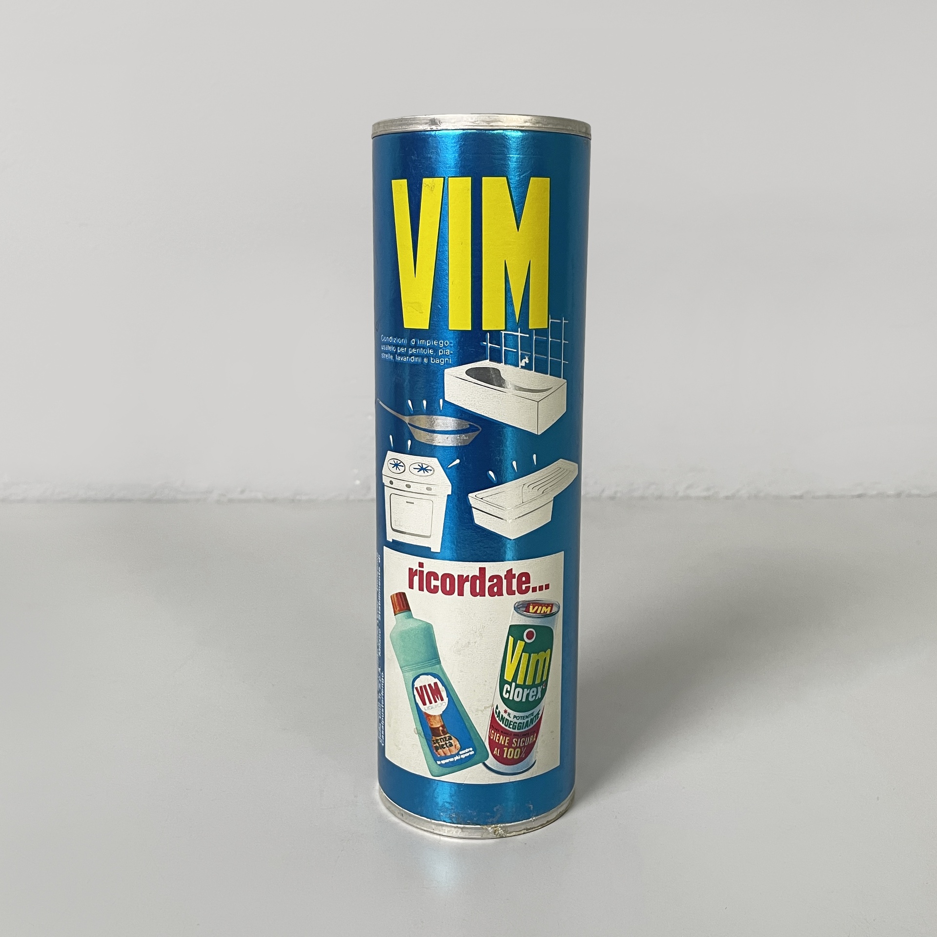 Set composto da diversi alimenti, cosmetici e detersivi di una spesa vintage. Il set è composto da: una bottiglia in vetro della Fanta, confezione Vim sgrassatore in metallo, due confezioni di gomme da masticare Brooklyn, cerotti di Paperino di Salvelox, scatola di preservativi 7bello, due confezioni di dentifricio Durbans in carta, una busta di lievito Bertolini, un barattolo in vetro di pesto alla genovese di Grand’Italia, sapone per vestiti Elan, un confezione in carta di camomilla Pompadour, un set di tre lattine di carne Simmental, shampoo Soffio, una confezione di caffè Lavazza, un barattolo di marmellata Santa Rosa, una confezione di biscotti Misura e una confezione di farina di frumento di Cammeo. Tutte le confezioni sono ancora sigillate.
