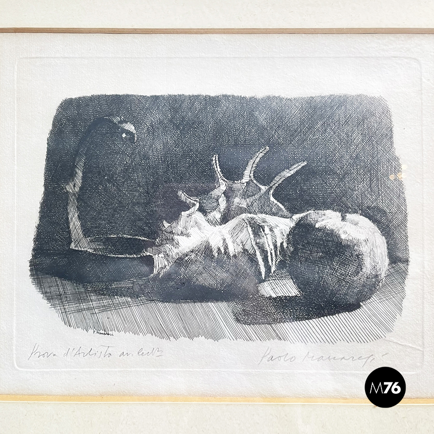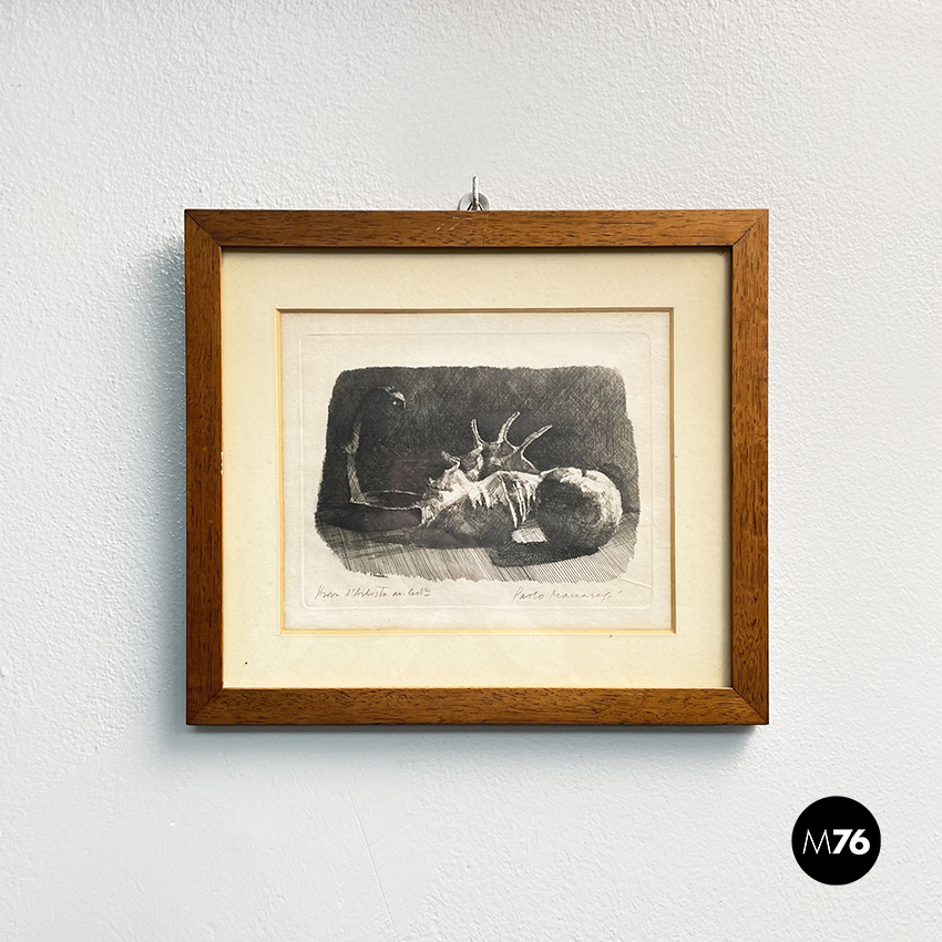Stampa realizzata con la tecnica litografica su carta rappresentante una natura morta con conchiglia e mela. Prova di stampa. In passepartout beige e cornice in legno.