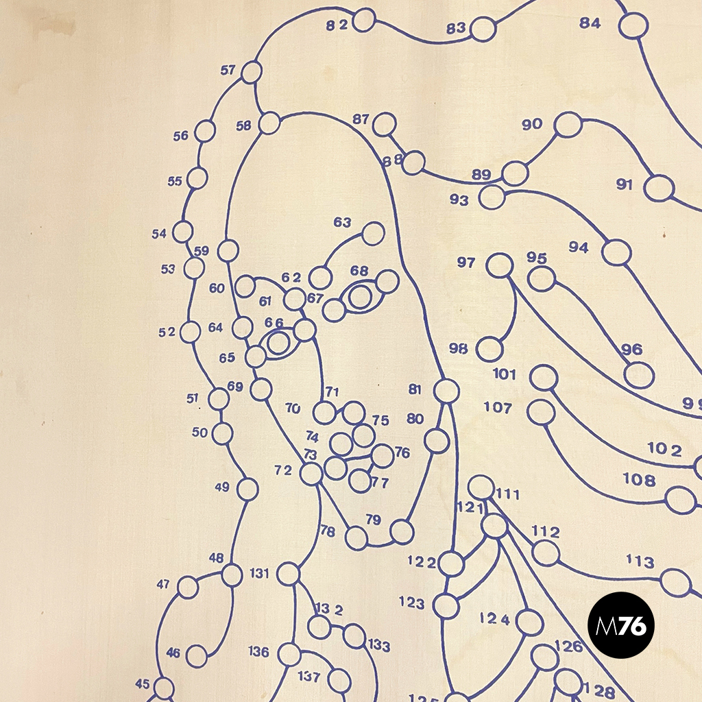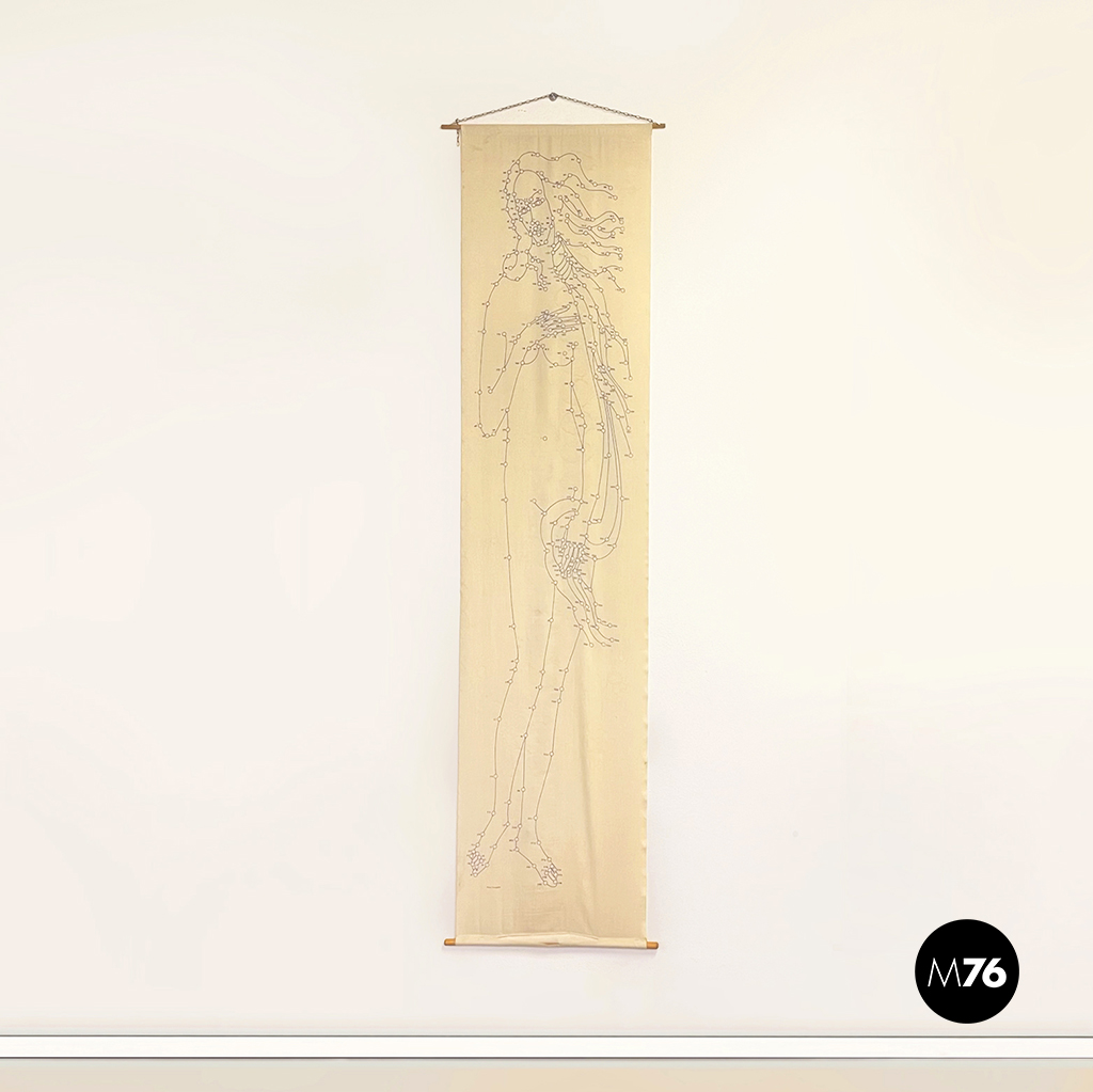 Stampa su tessuto da parete sostenuta da due bacchette di legno a sezione tonda sulla cima e sul fondo. La stampa presenta un’illustrazione outline con puntini numerati della Venere di Botticelli.