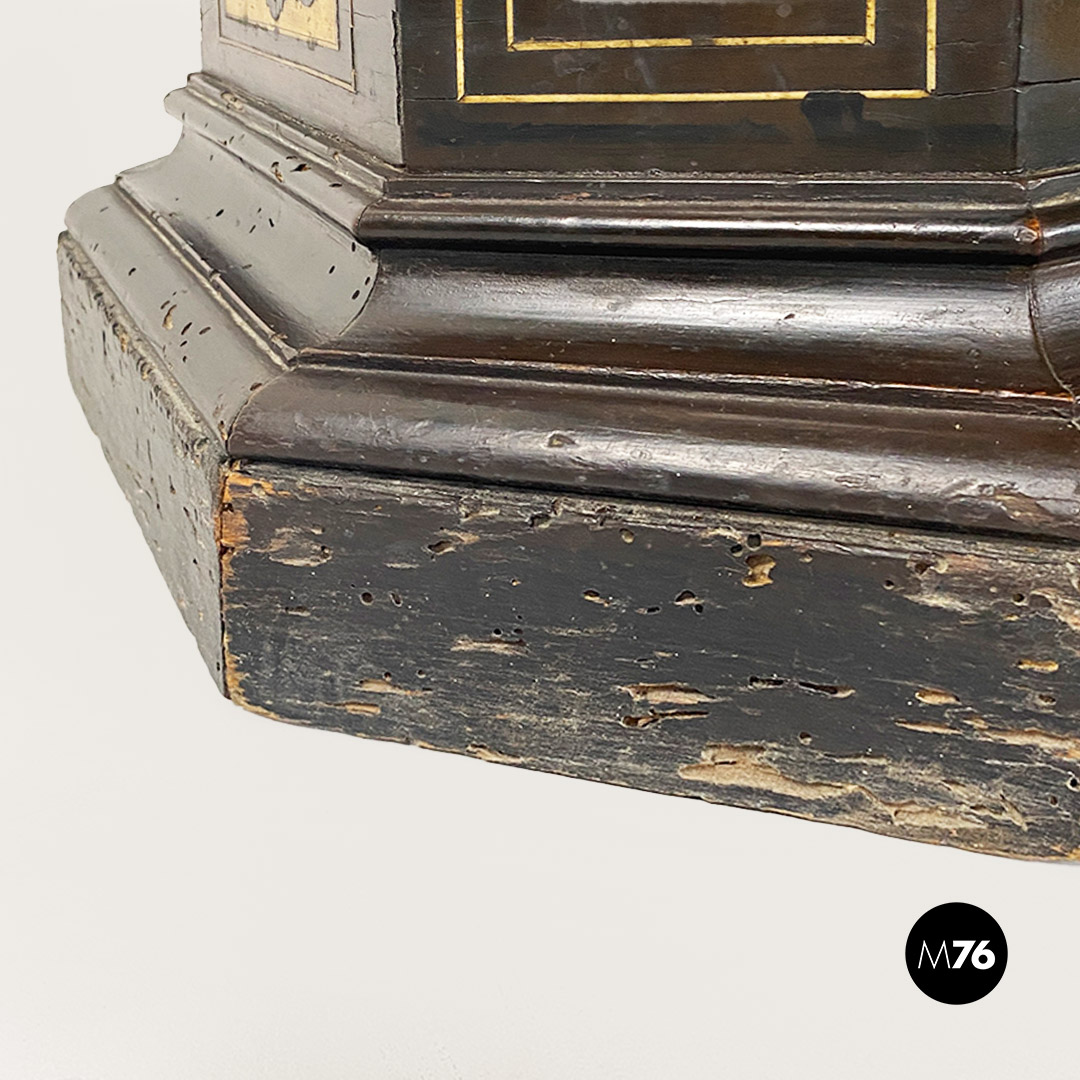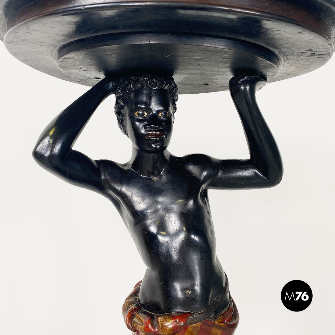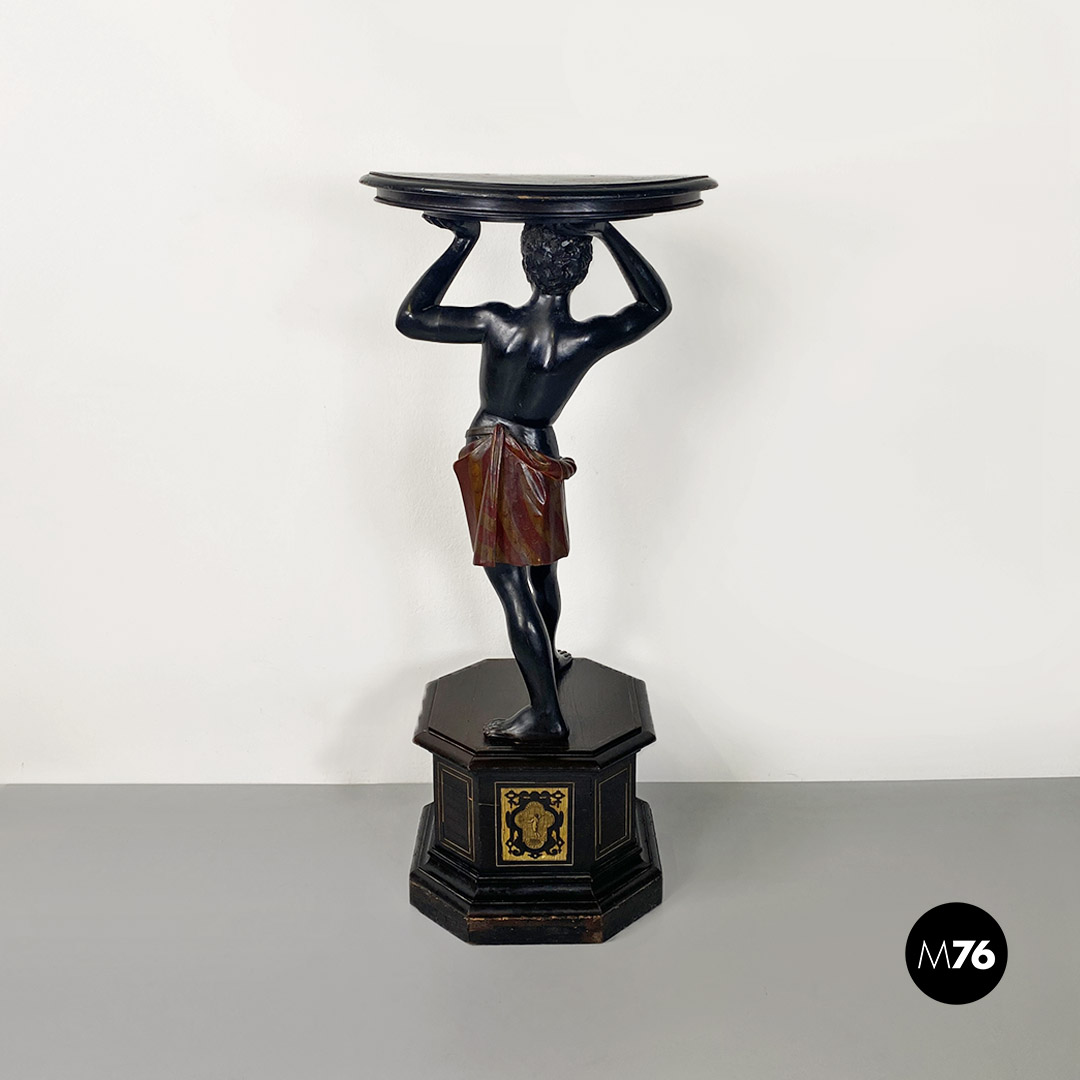 Statua del Moro utilizzabile come colonna o piedistallo grazie al suo vassoio. Interamente realizzata in legno ebanizzato di colore naturale con gonnellino a righe sui toni del giallo e del rosso e decoro sulla base di forma ottagonale.
