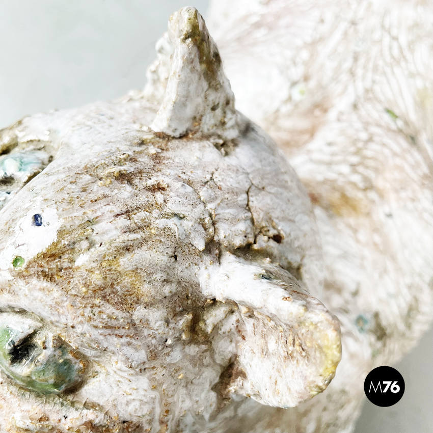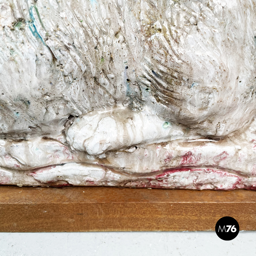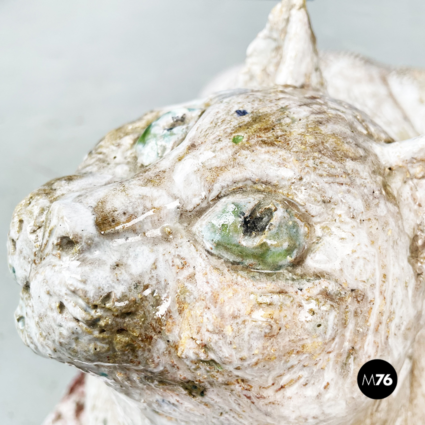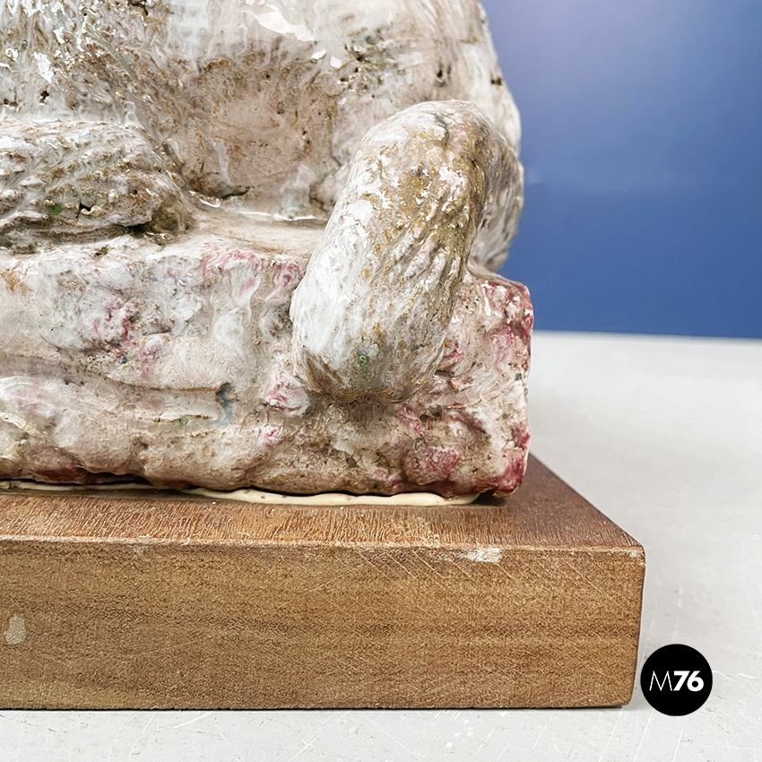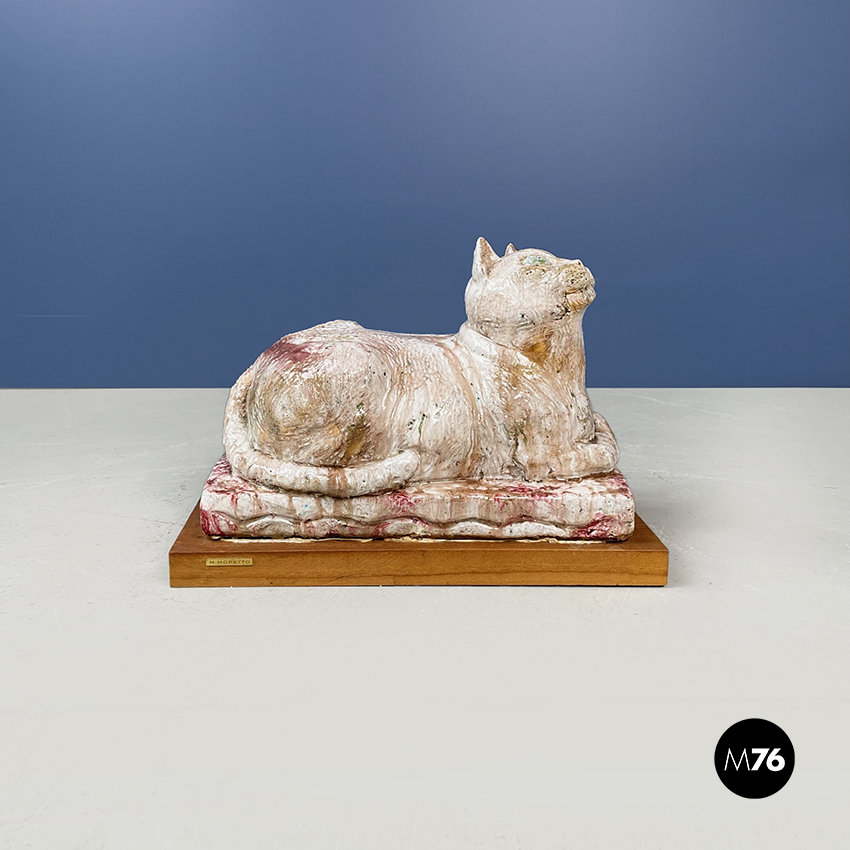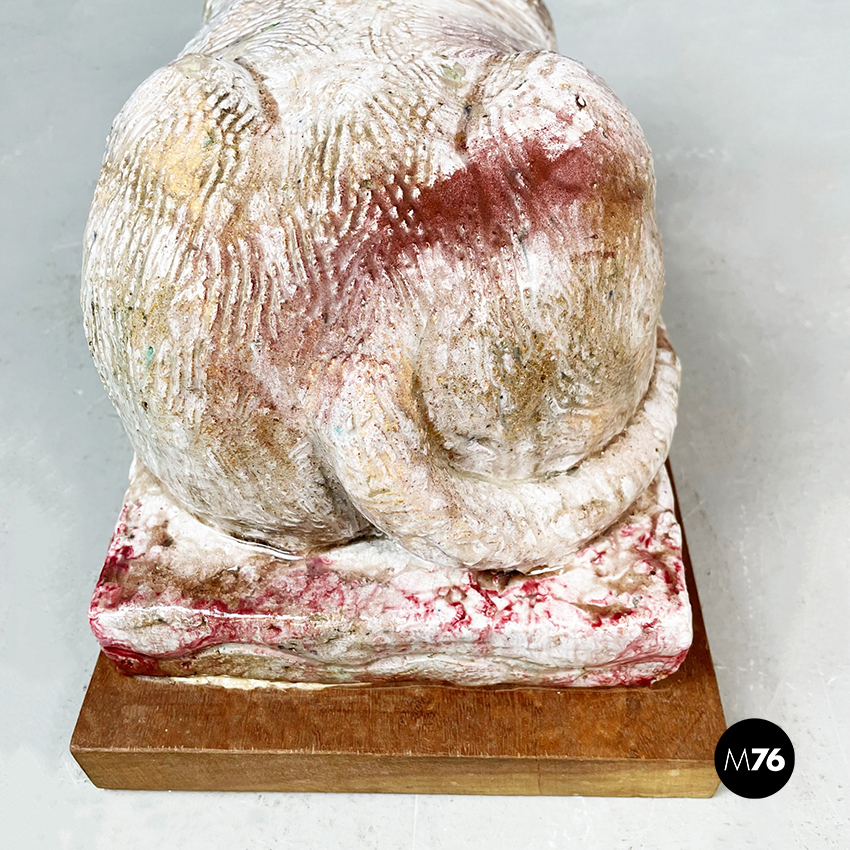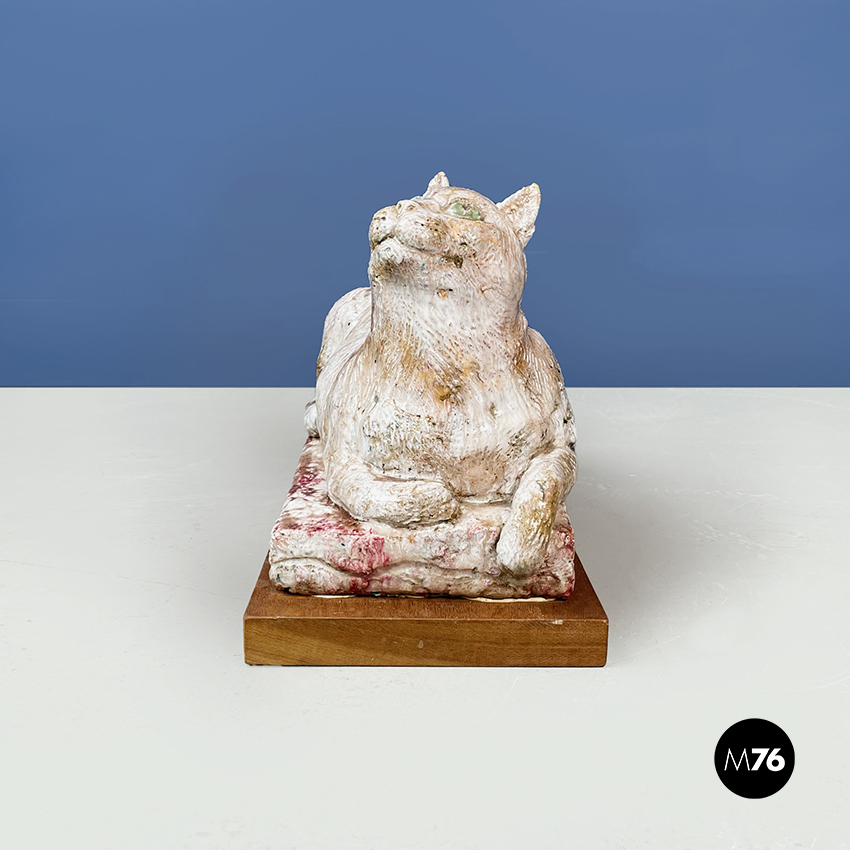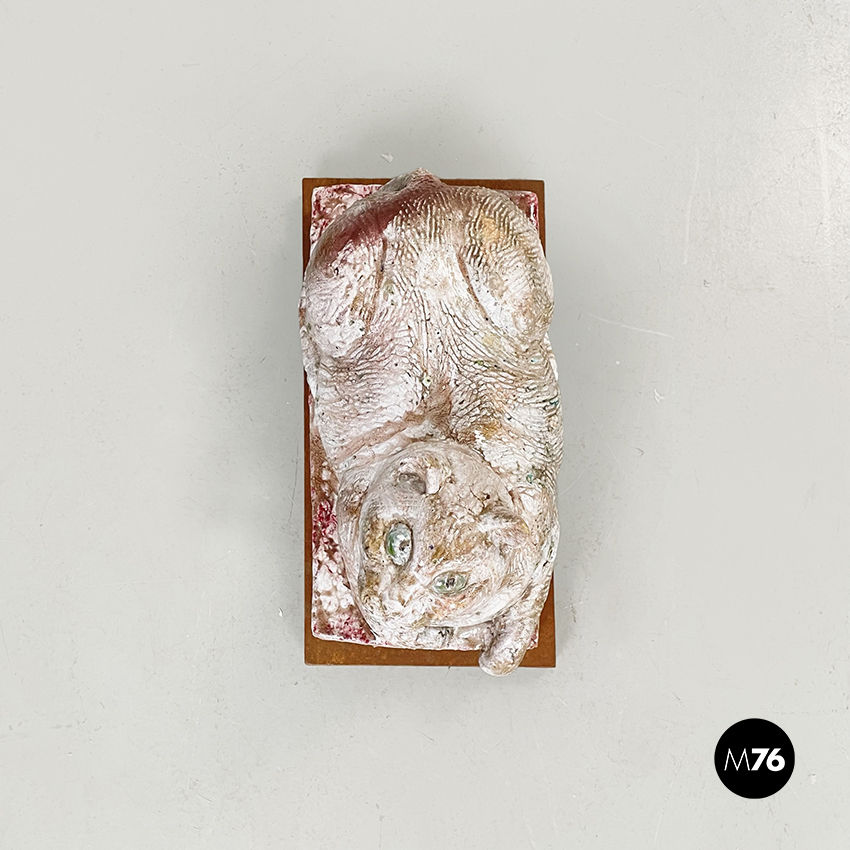 Statua di gatto sdraiato con sguardo verso l’alto in terracotta verniciata rosa/rosso e bianco. Gli occhi del gatto sono verdi. Finemente lavorata con base in legno.