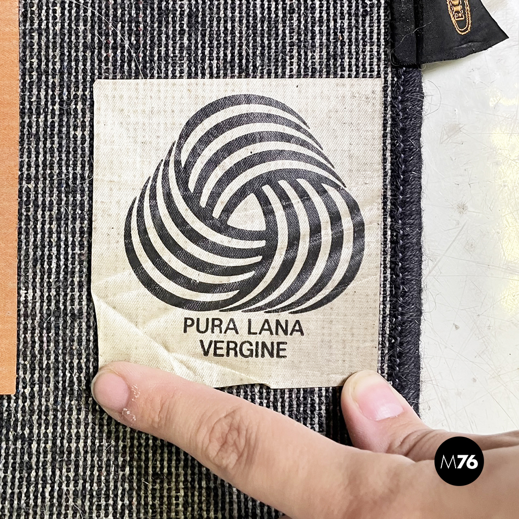 Tappeto rettangolare in tessuto di pura lana vergine. I profili del tappeto sono in nero. Gli interni sono caratterizzati da una serie di quadrati composti da righe di grosso spessore e da rombi composti da righe sottili di diversi colori: giallo rosa nero blu e verde.