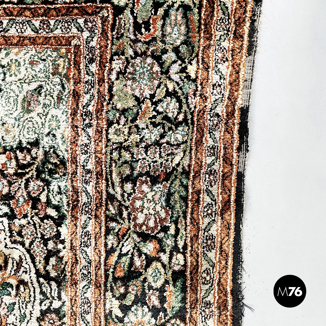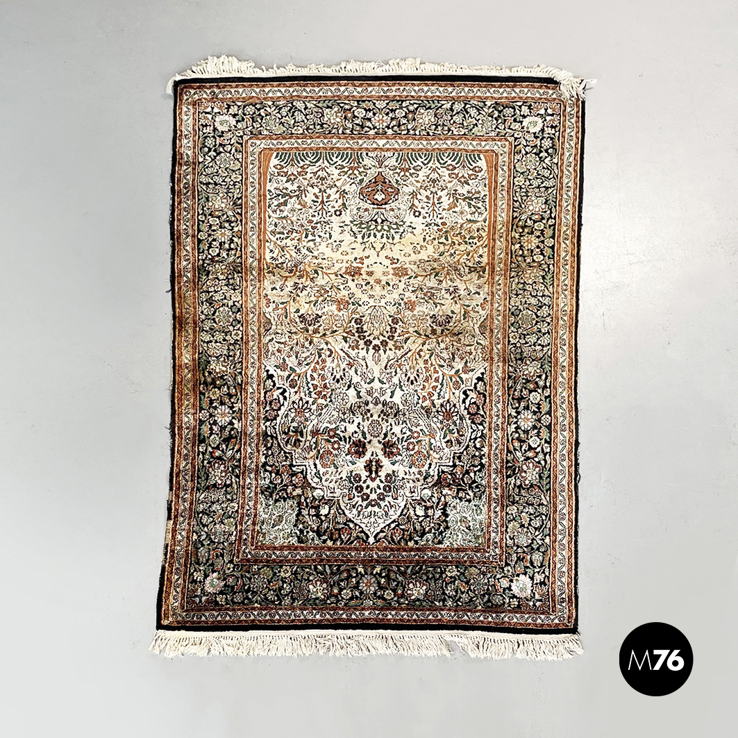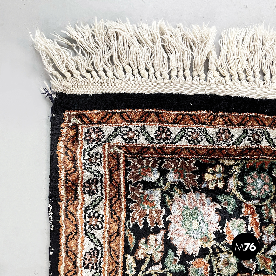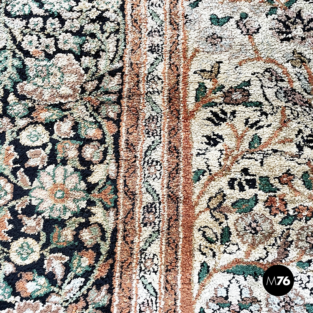 Tappeto persiano rettangolare in tessuto dai colori chiari con motivi floreali tipici di questi tappeti. Profilo esterno nero e interni sul rosso e beige. Ai due estremi presenta frange bianche.