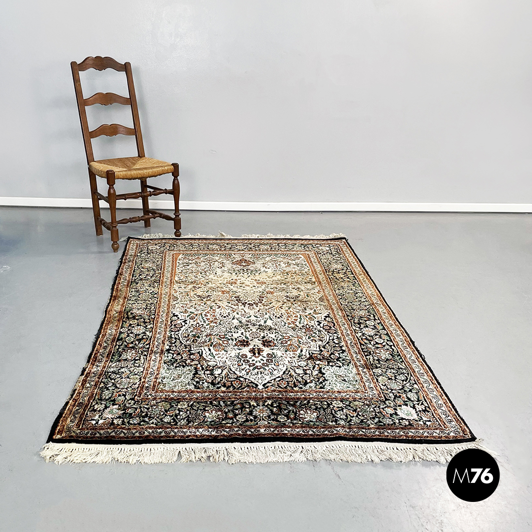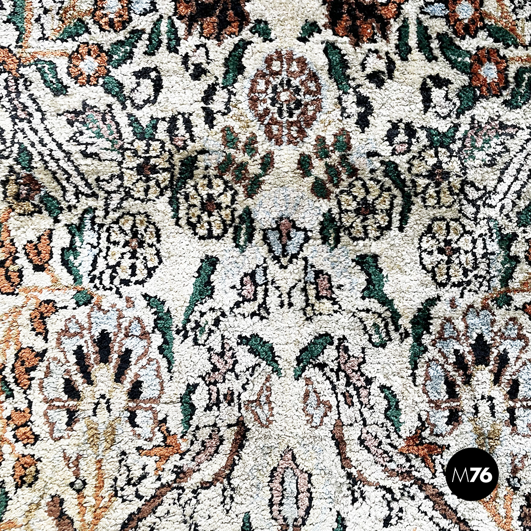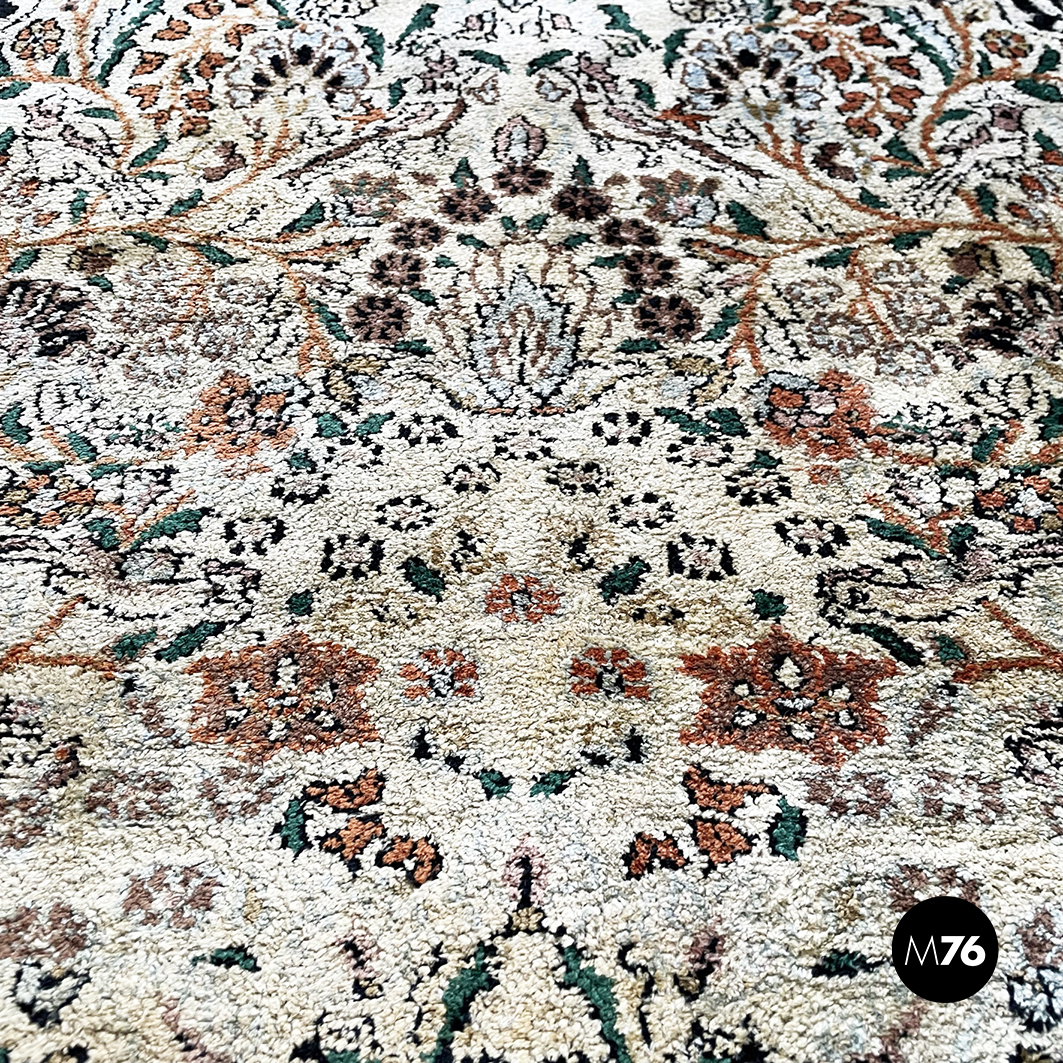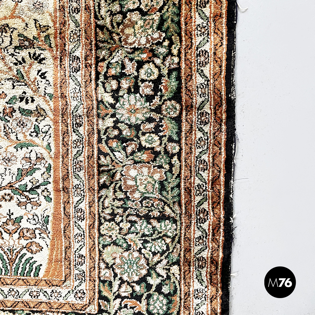 Tappeto persiano rettangolare in tessuto dai colori chiari con motivi floreali tipici di questi tappeti. Profilo esterno nero e interni sul rosso e beige. Ai due estremi presenta frange bianche.
