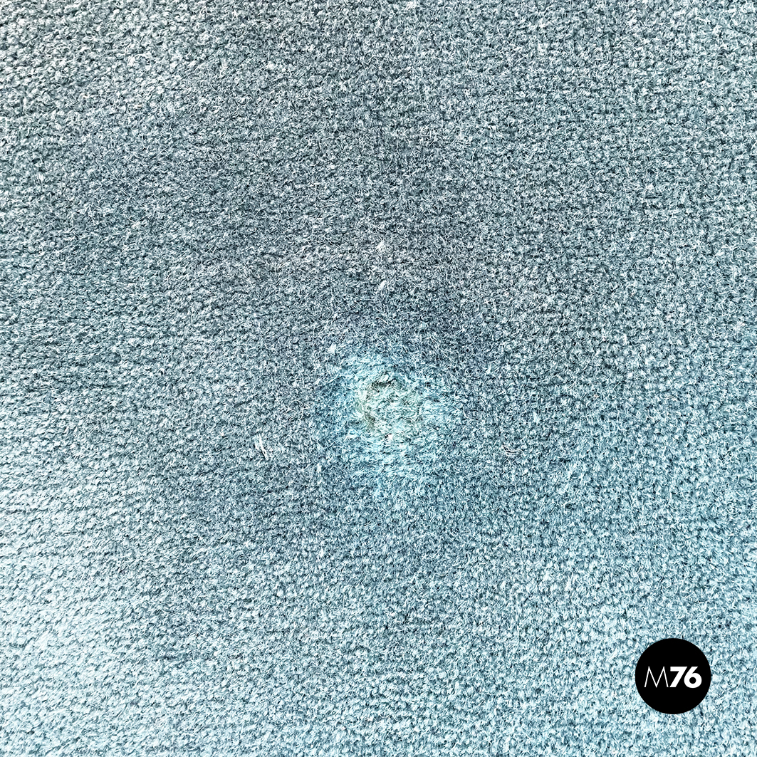 Tappeto tondo di grandi dimensioni a pelo corto. Il tappeto presenta al suo interno i colori azzurro chiaro e verde scuro con alcuni accenni di giallo e rosso. I disegni riprendono forme geometriche: è presente un rombo centrale diversi piccoli triangoli e delle linee che seguono la forma circolare del tappeto e la forma del rombo.