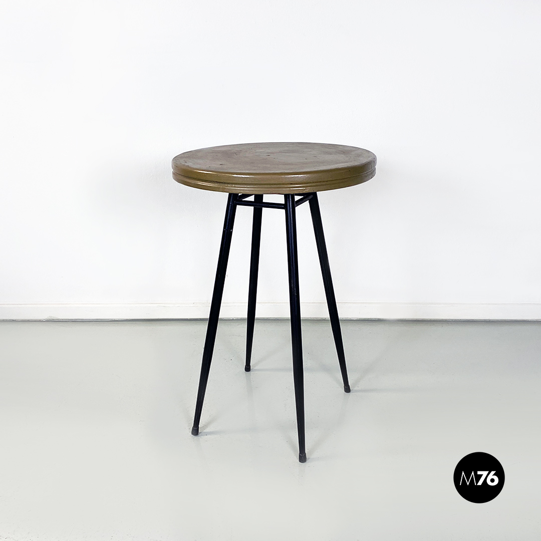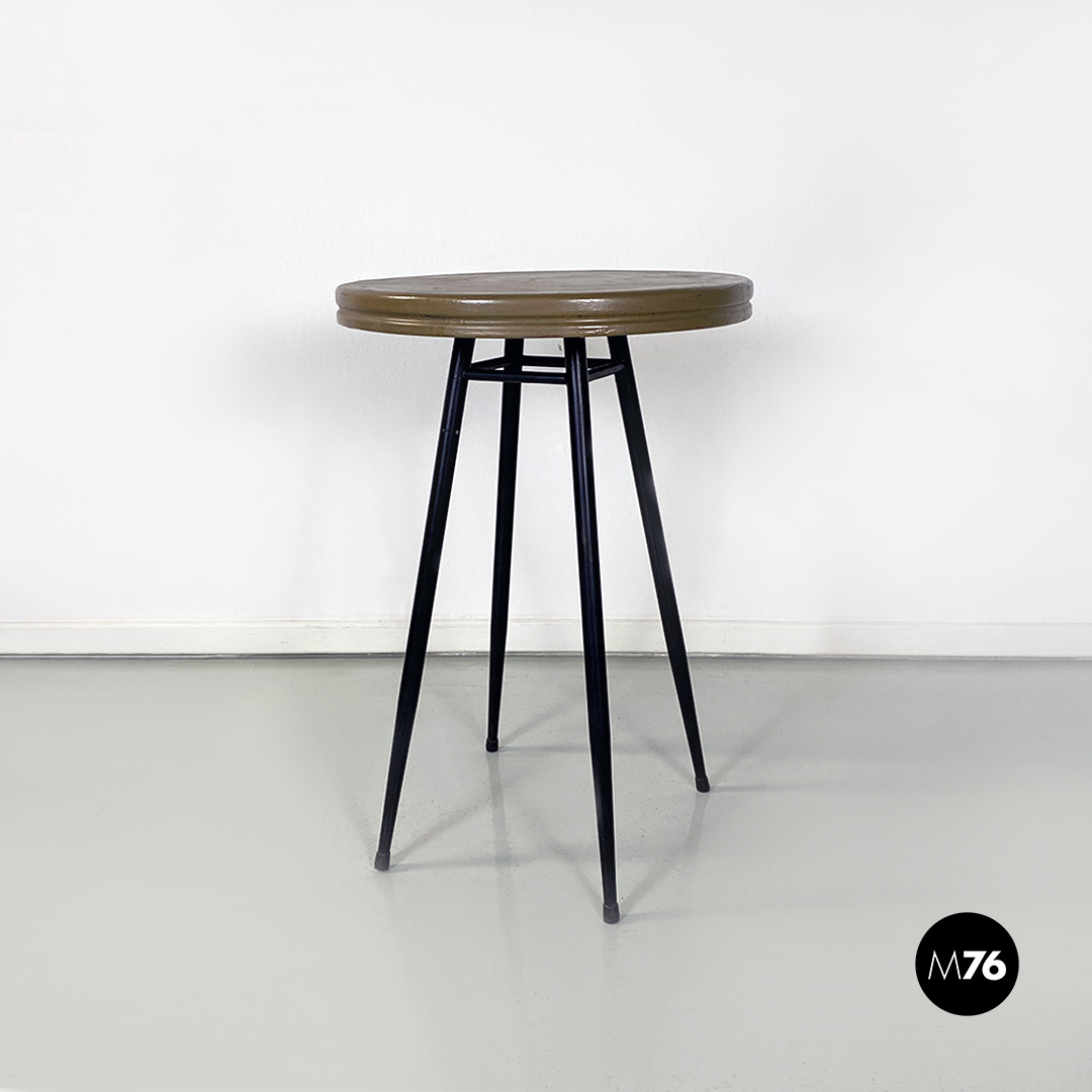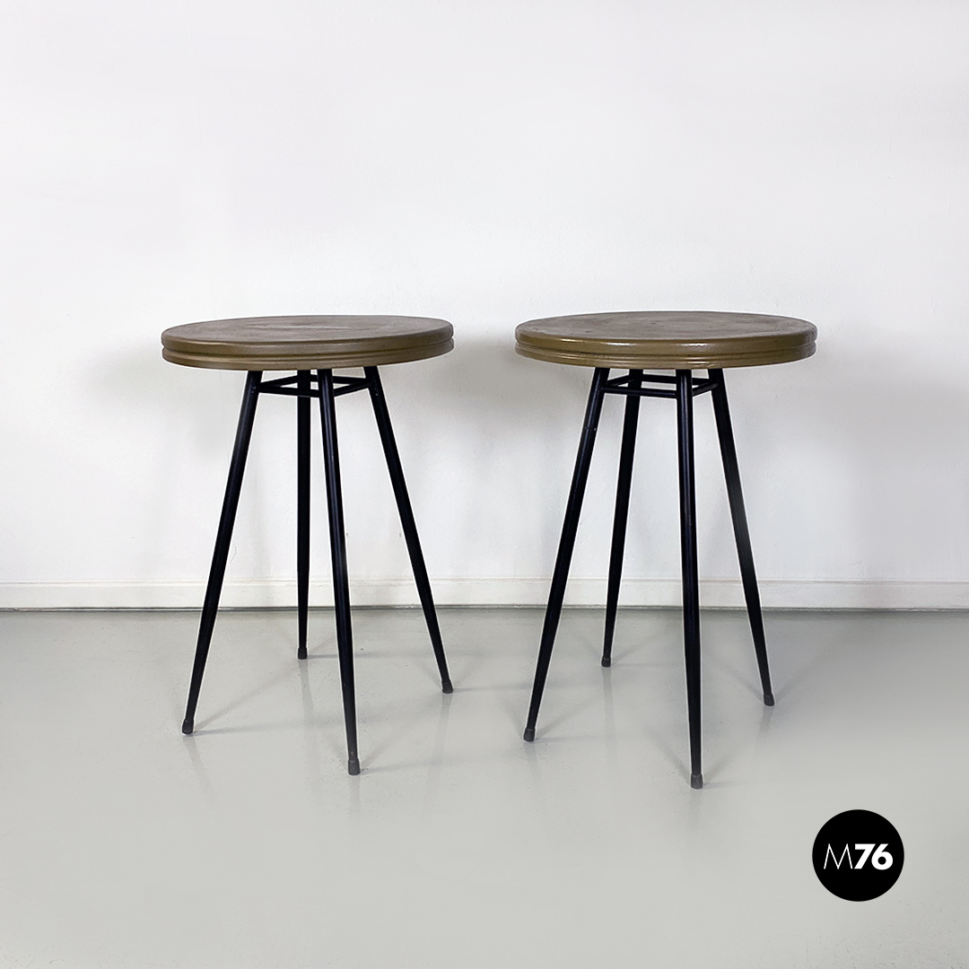 Coppia di tavoli da bar con piano in metallo verniciato sui toni del marrone-verde oliva di forma tonda e zampe in metallo nero.