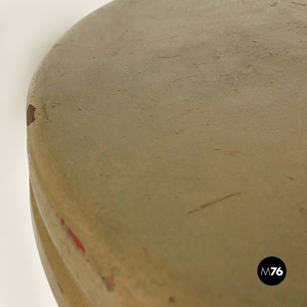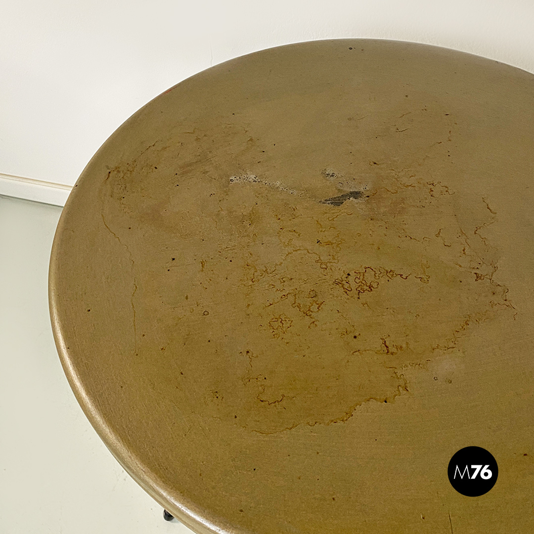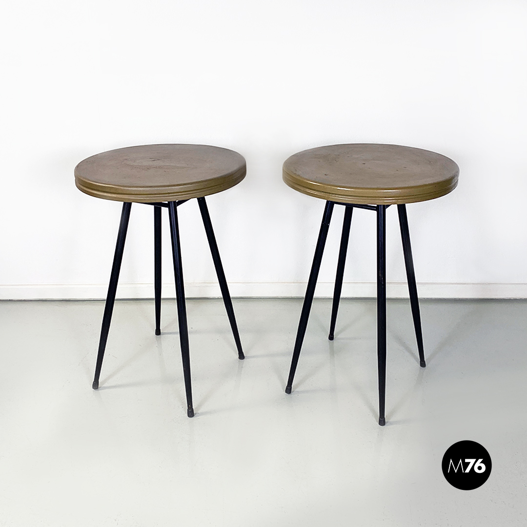 Coppia di tavoli da bar con piano in metallo verniciato sui toni del marrone-verde oliva di forma tonda e zampe in metallo nero.