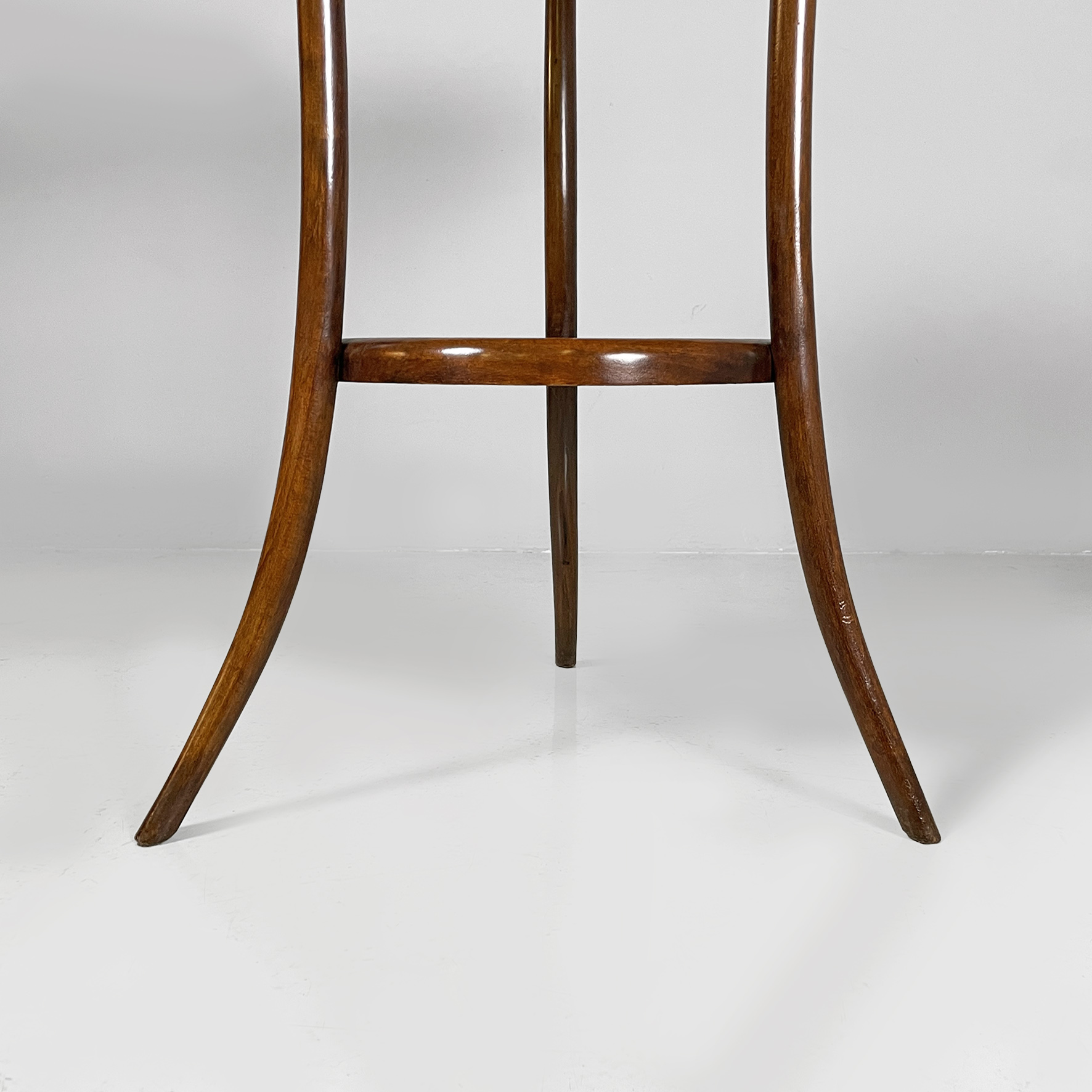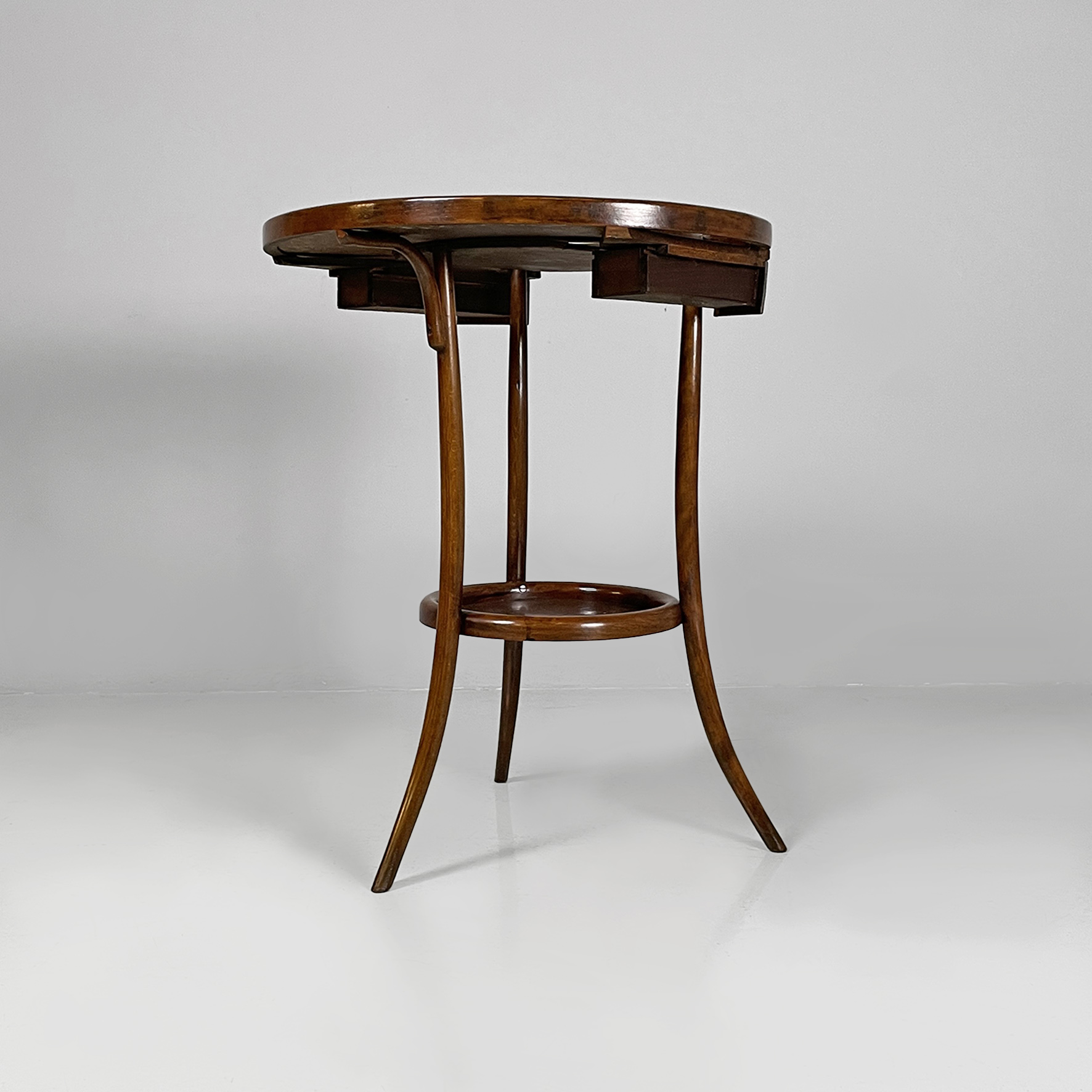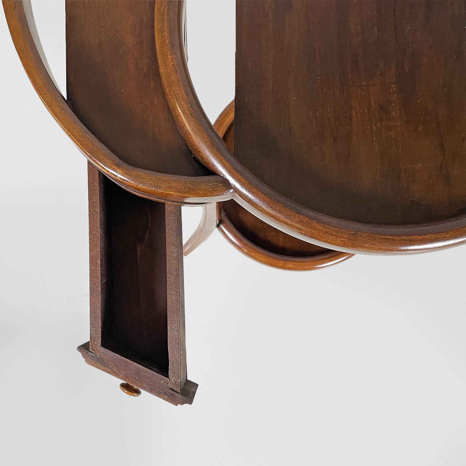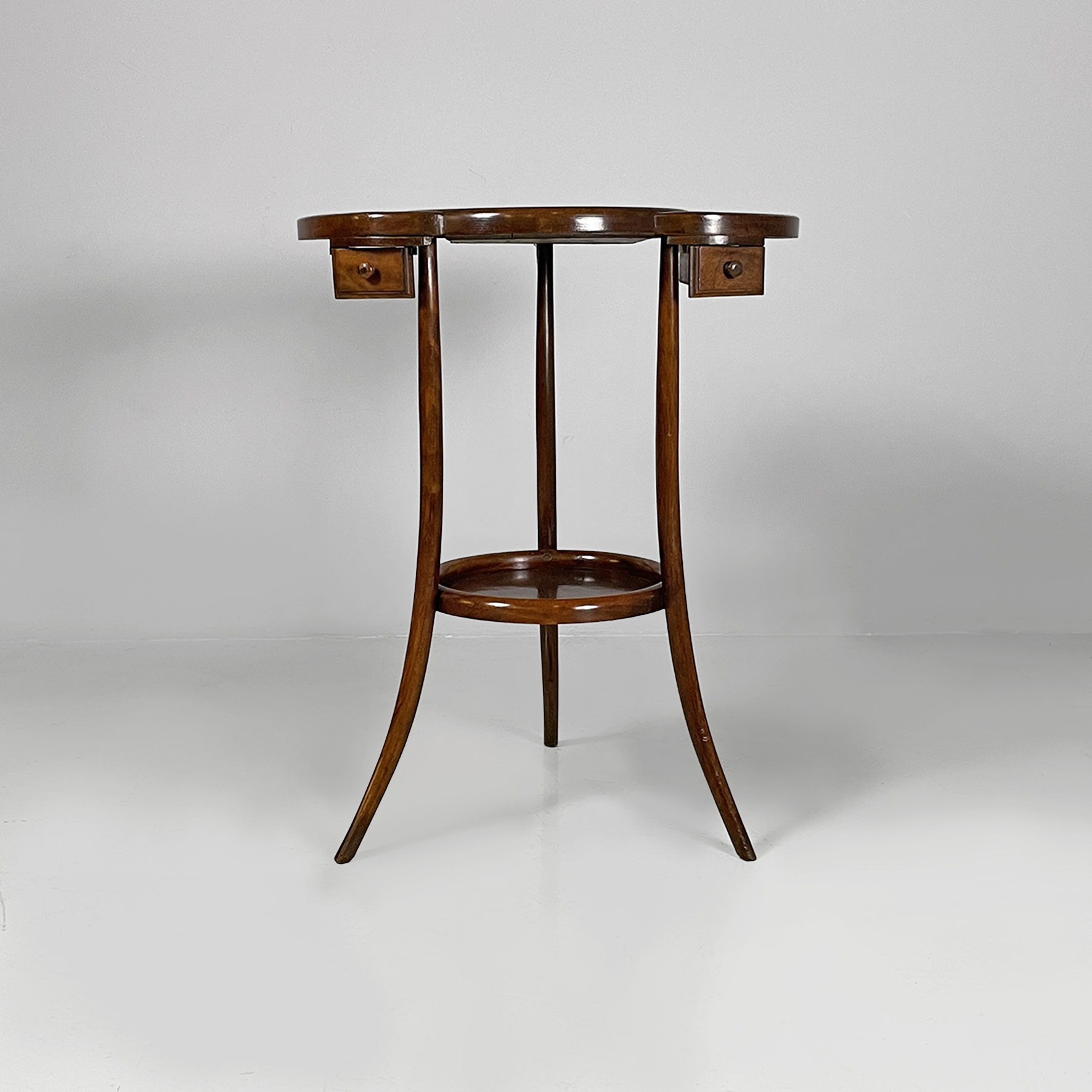 Pair of service tables or coffee tables entirely made of wood. The rounded top has rounded profiles that delimit an internal circular space and an edge on the sides there are two holes. Under the top there are two drawers with round handles. The three legs have a round section and widen slightly towards the ground support with a round shelf in the lower part of the structure.