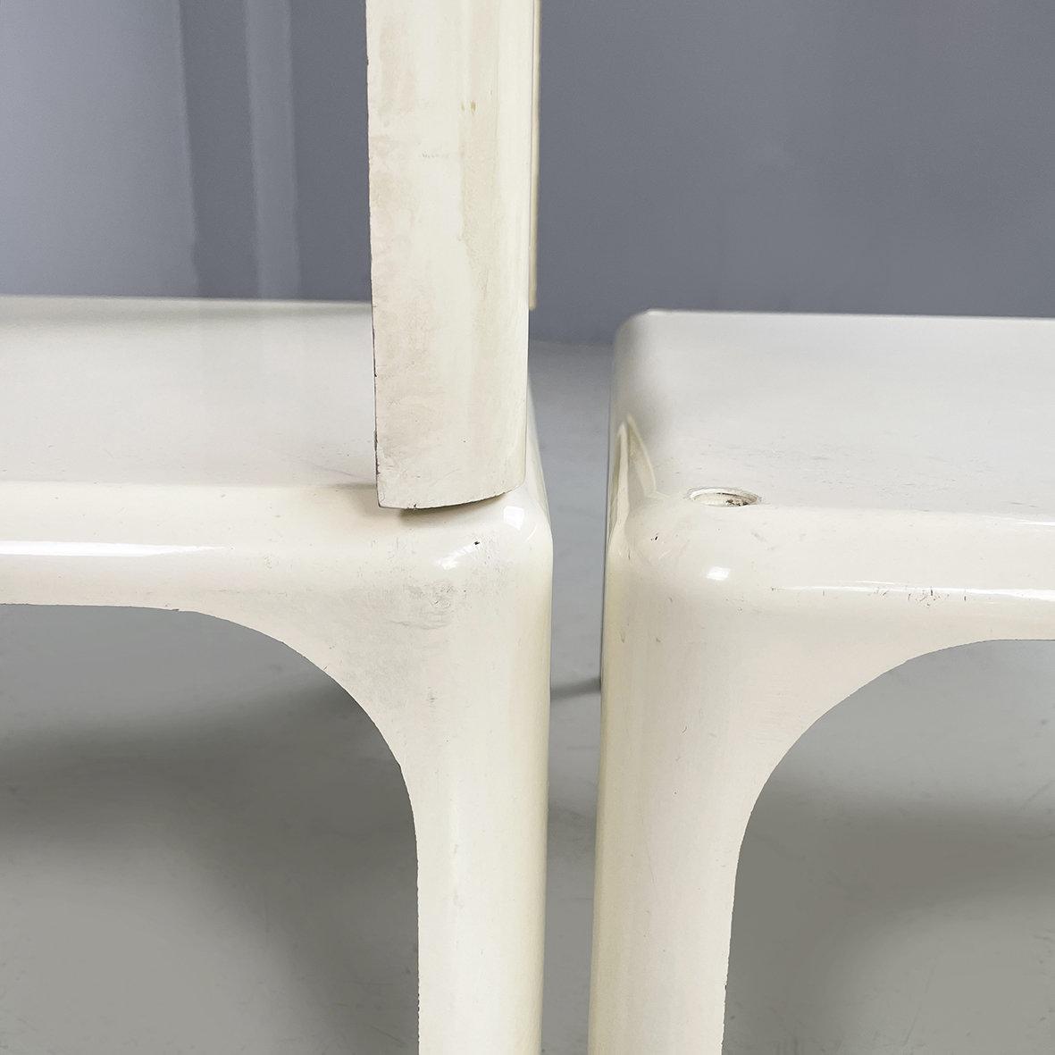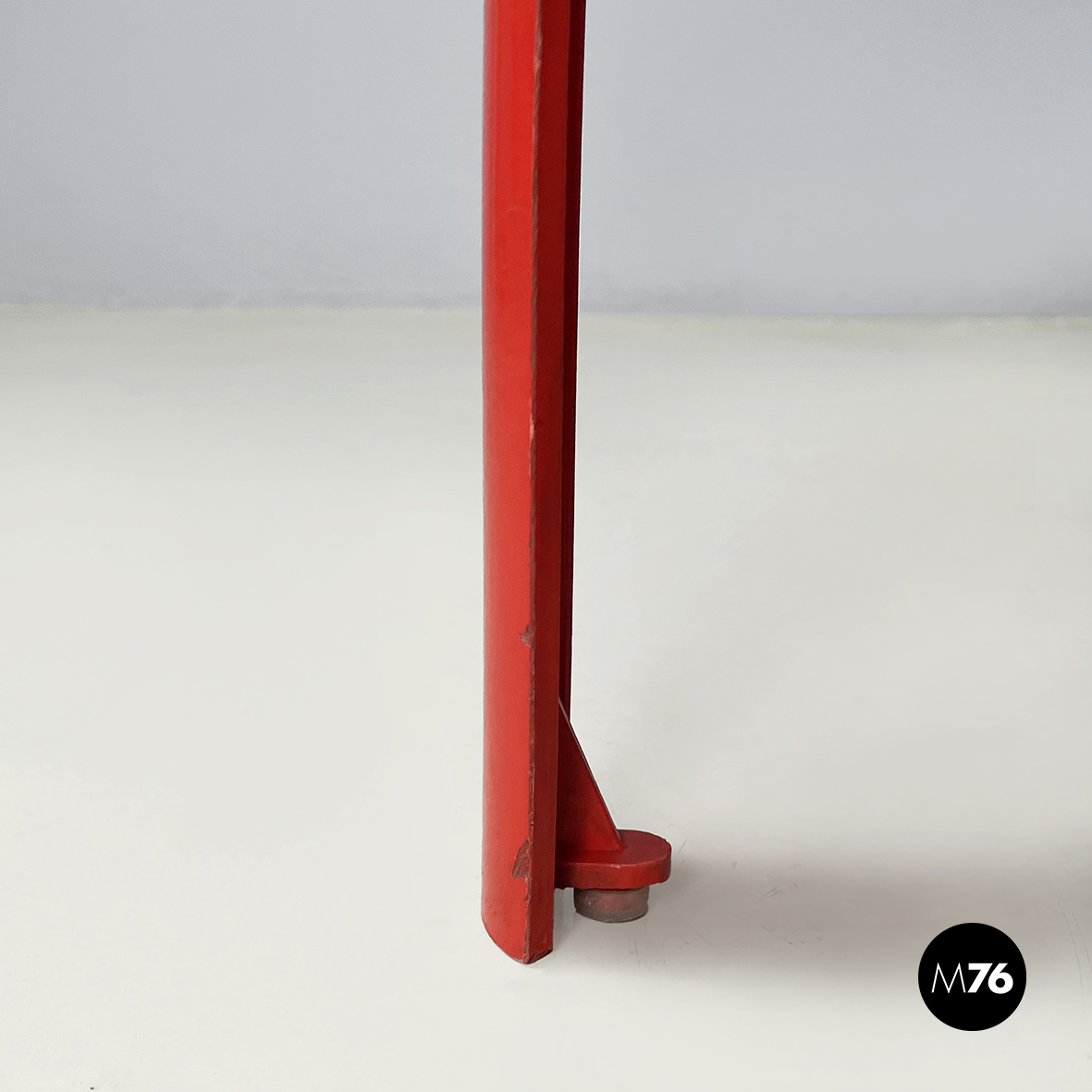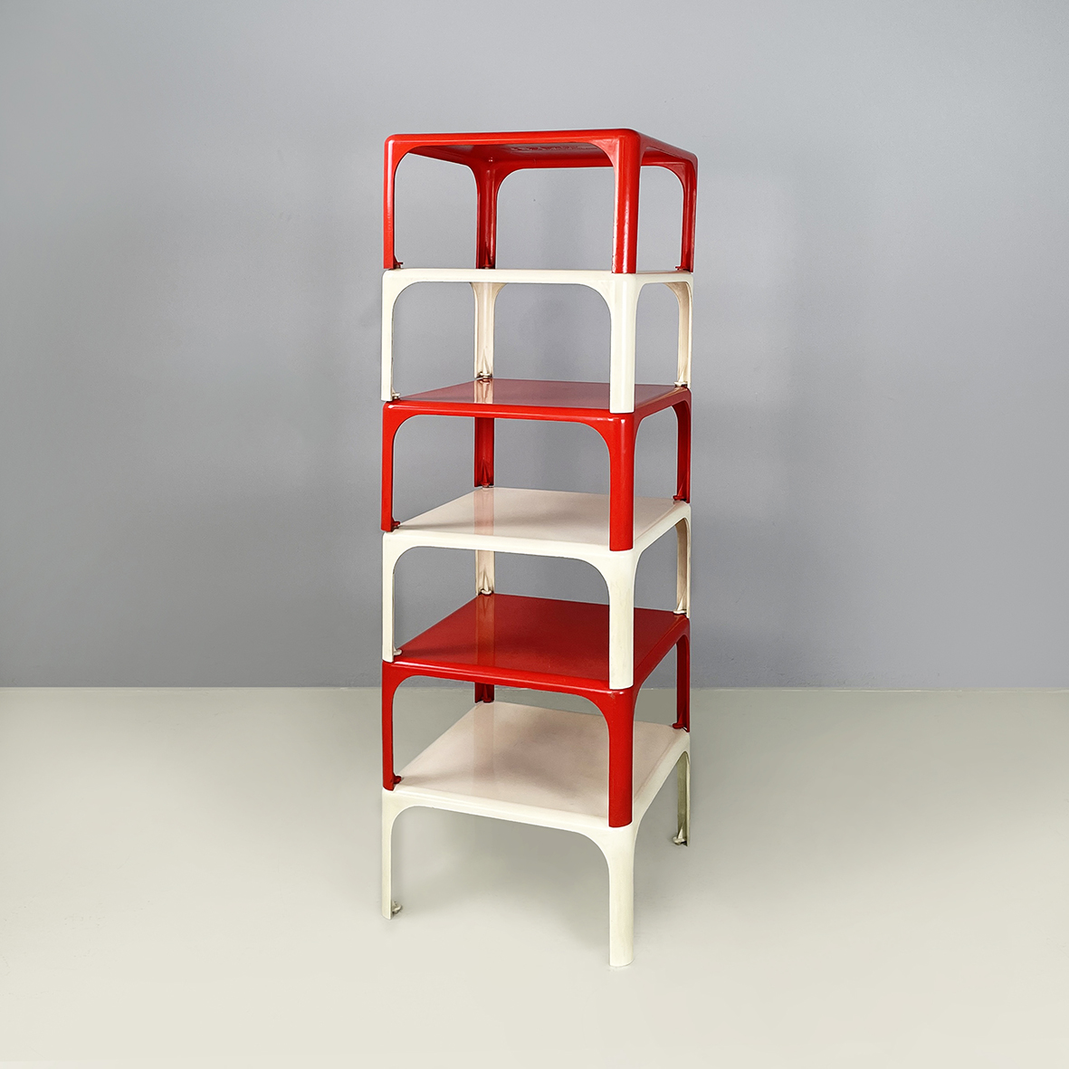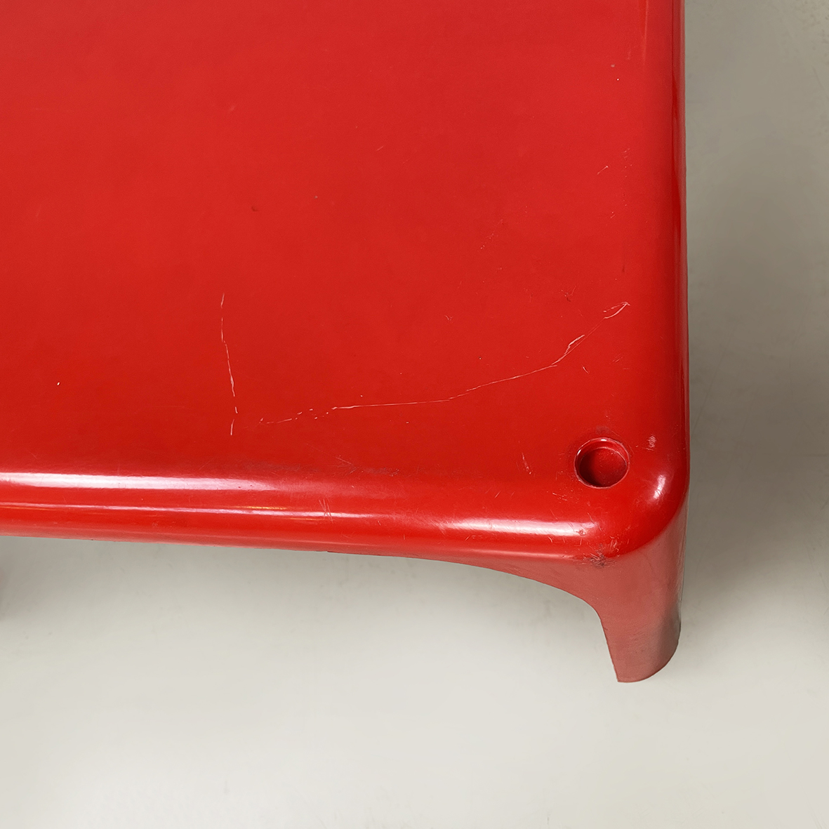 Set di sei tavoli da caffè modello Demetrio 45 in plastica ABS tre in bianco e tre in rosso. Il piano è quadrato con angoli arrotondati. Sui quattro angoli del piano sono presenti delle rientranze tonde che permettono di impilare i tavolini. Adatto ad uso esterno come in giardino.