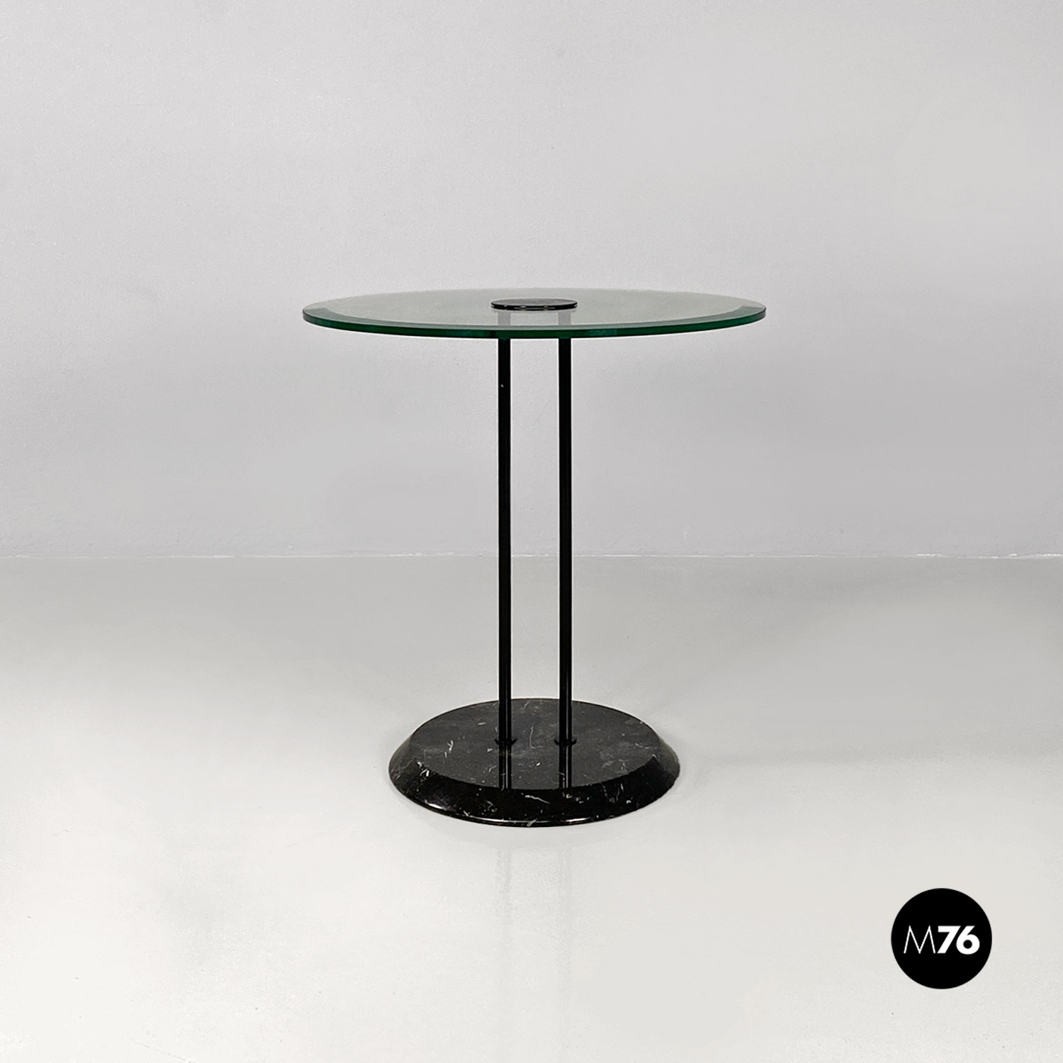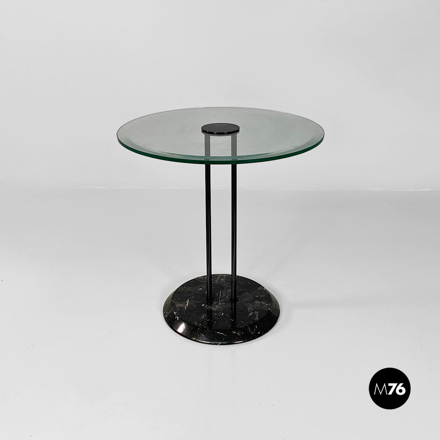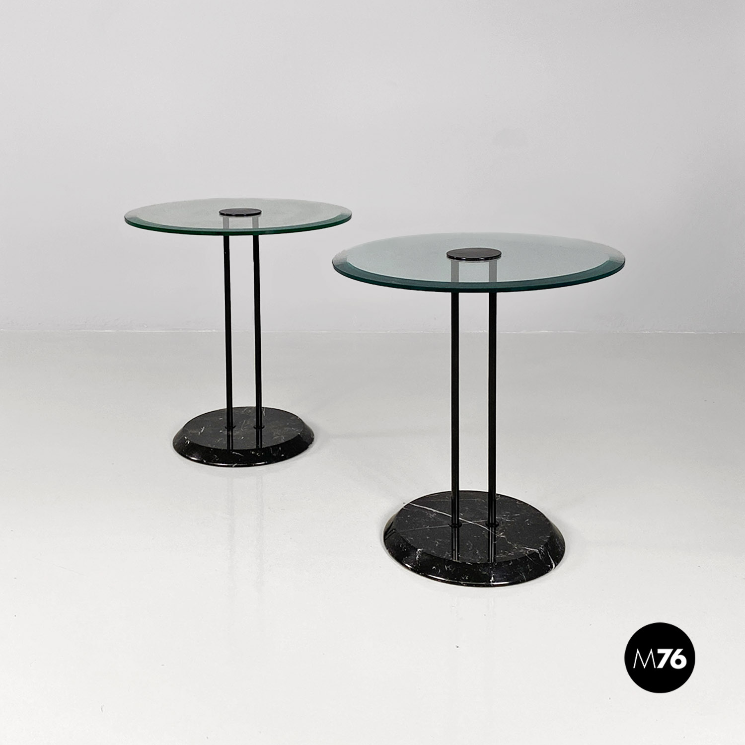 Coppia di tavoli da caffè con base tonda in marmo nero di marquinia con venature bianche piano tondo in vetro trasparente al cui centro si trova un elemento tondo da dove partono due tubolari che costituiscono lo stelo centrale del tavolo il tutto in metallo verniciato nero.