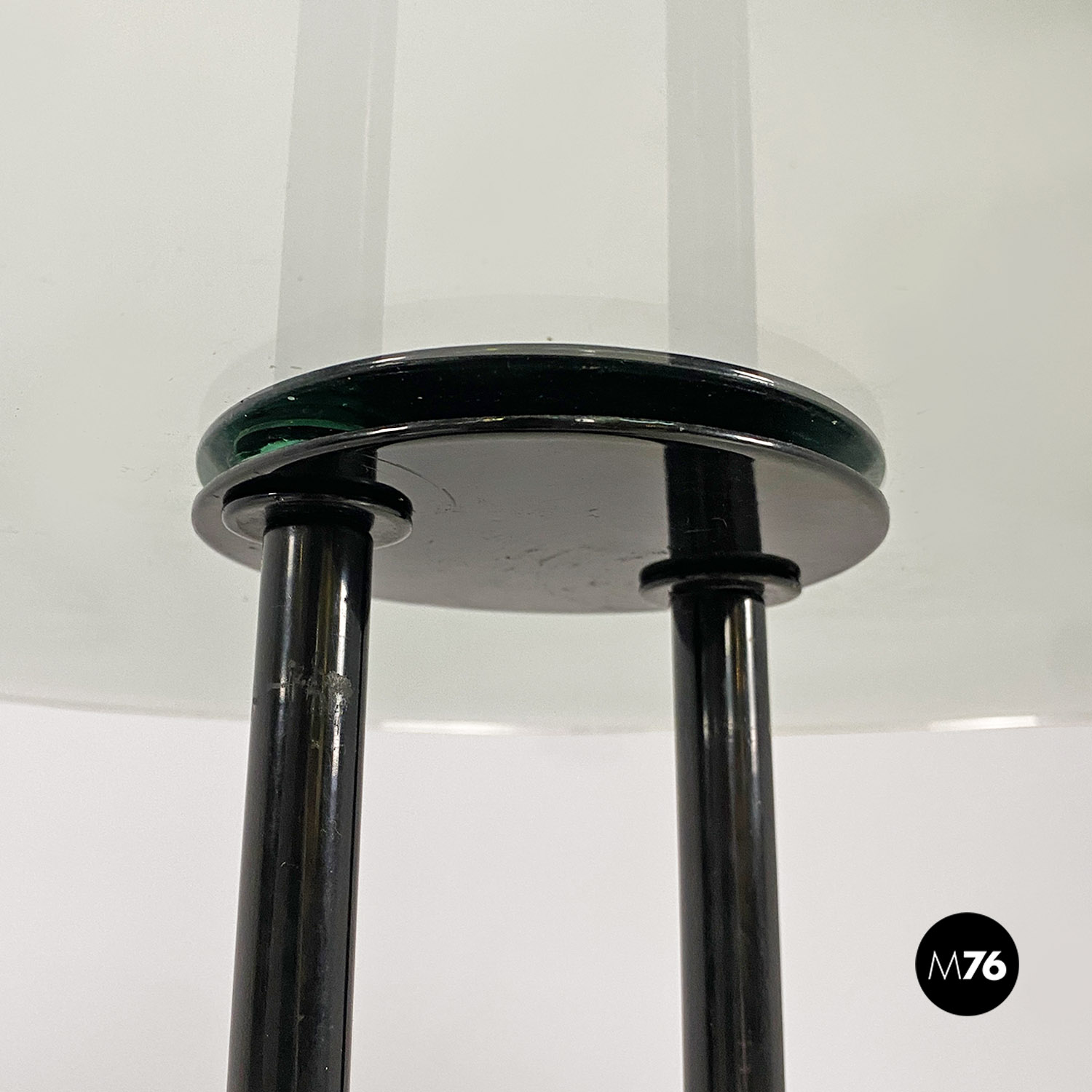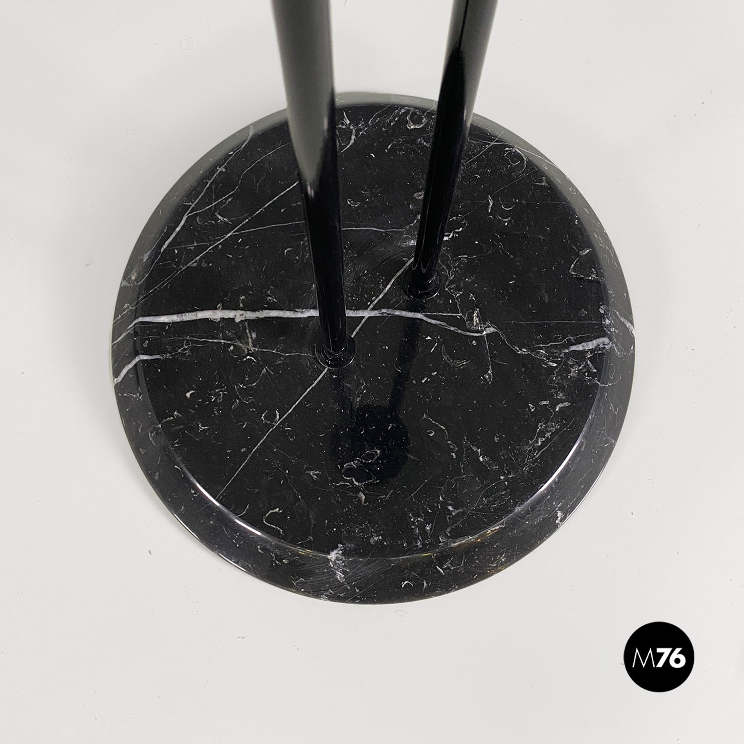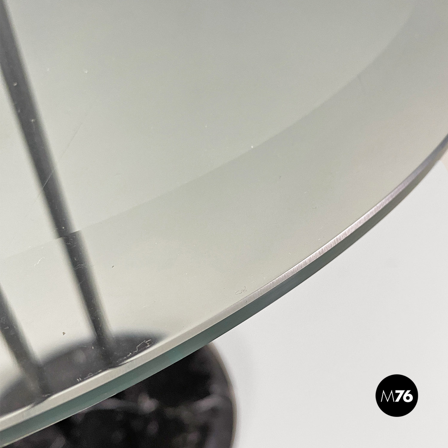Coppia di tavoli da caffè con base tonda in marmo nero di marquinia con venature bianche piano tondo in vetro trasparente al cui centro si trova un elemento tondo da dove partono due tubolari che costituiscono lo stelo centrale del tavolo il tutto in metallo verniciato nero.
