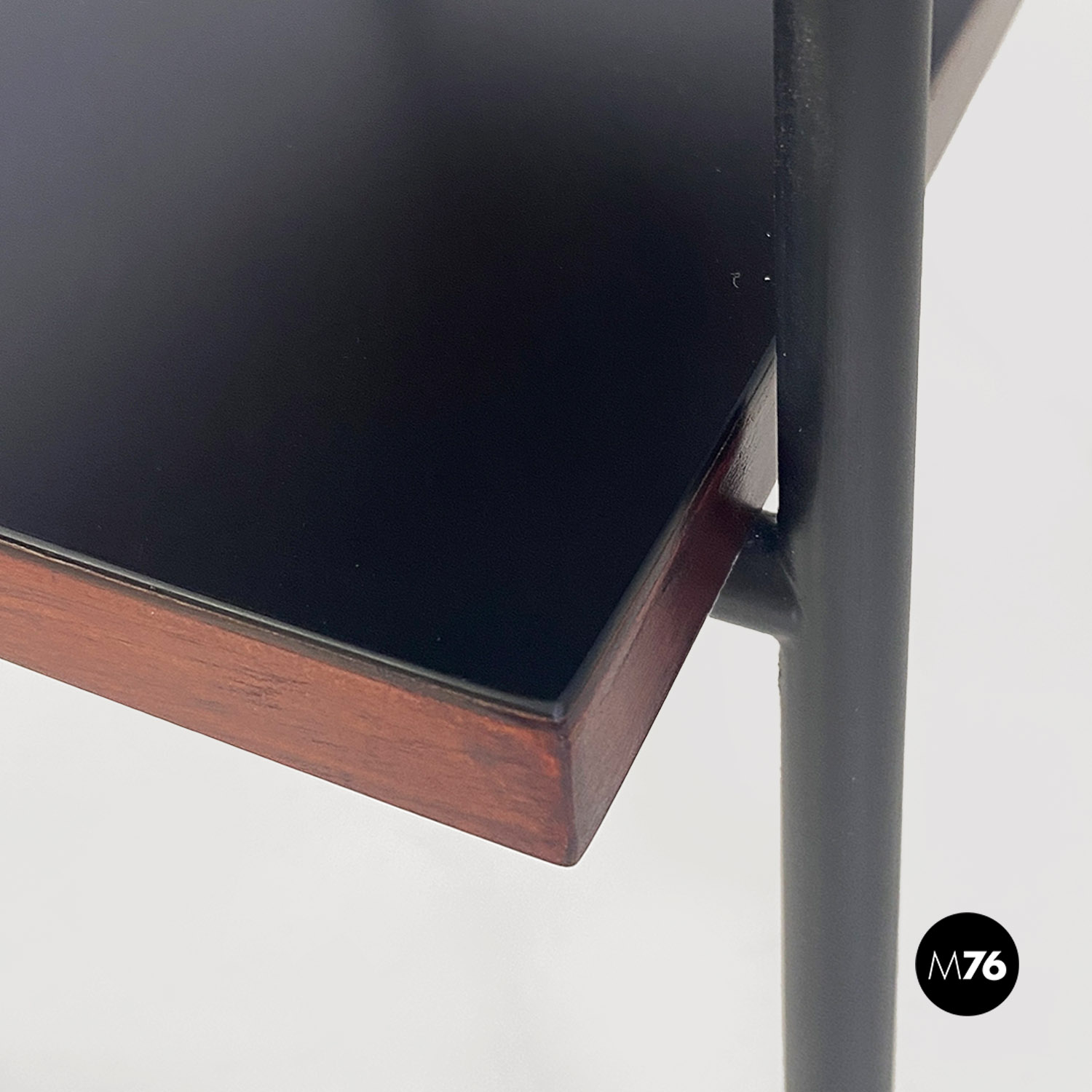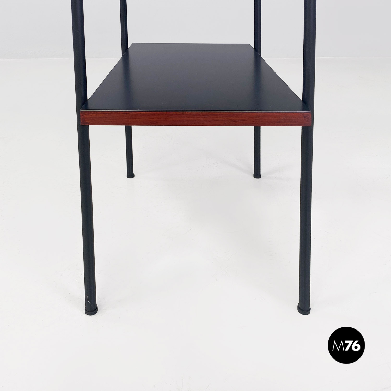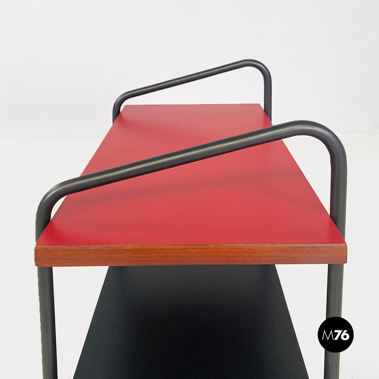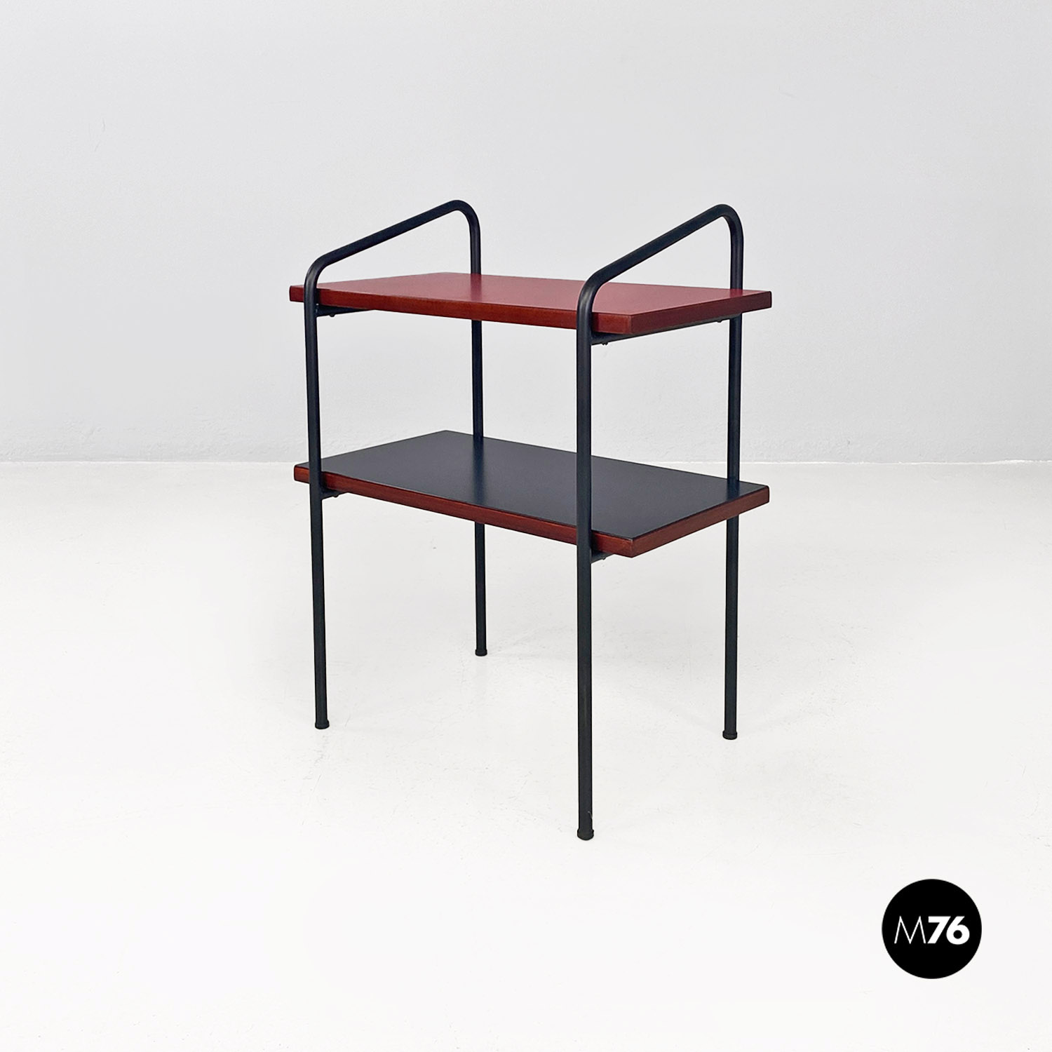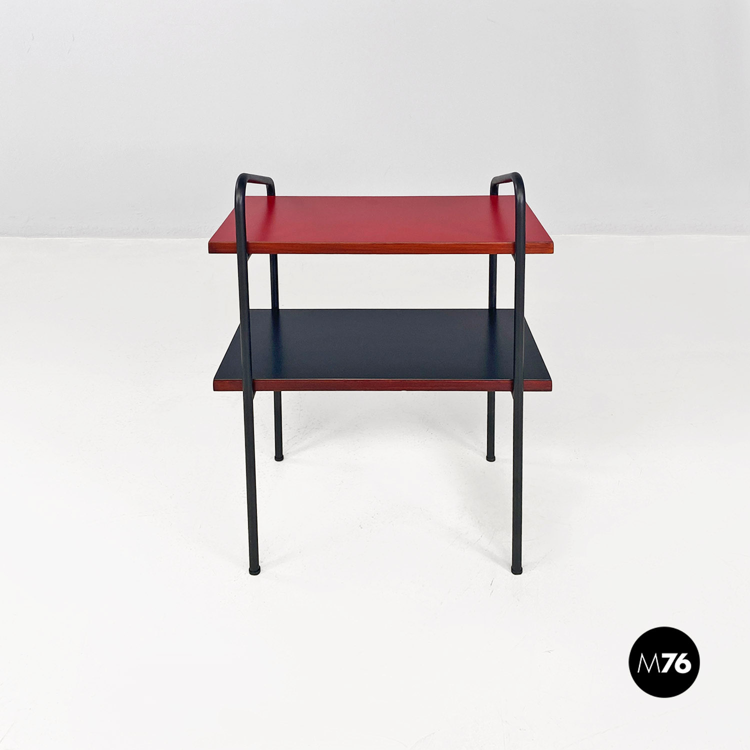 Coppia di comodini a doppio ripiano rivestito in formica di colore rosso opaco nella parte alta e in nero opaco sulla mensola inferiore con bordo marrone in tinta noce. La struttura è composta da tondini in metallo verniciato nero con finitura opaca su cui sono avvitati i ripiani. Il singolo elemento può essere utilizzato anche come tavolo da caffè o come un piccolo scaffale libreria da fianco divano.