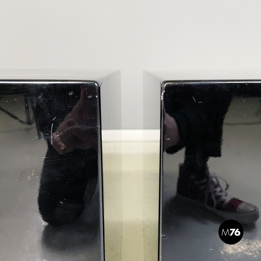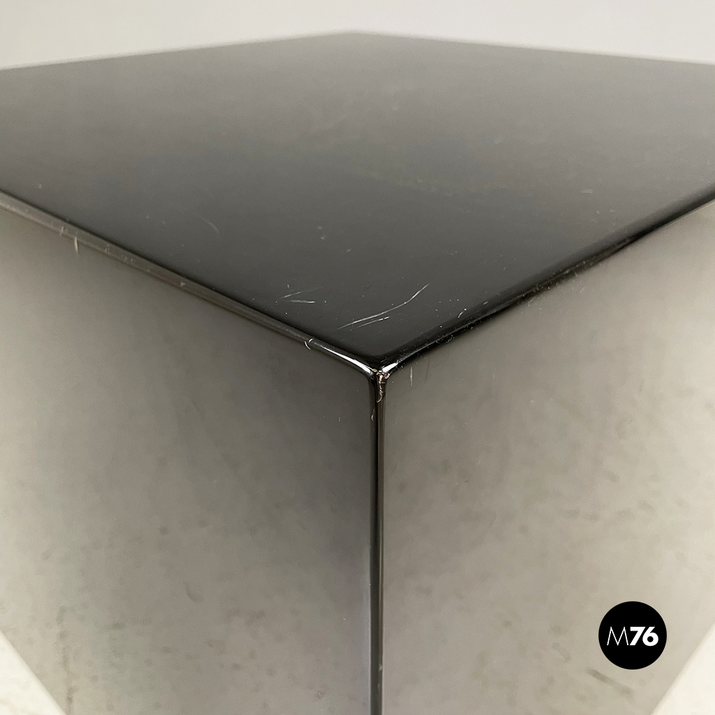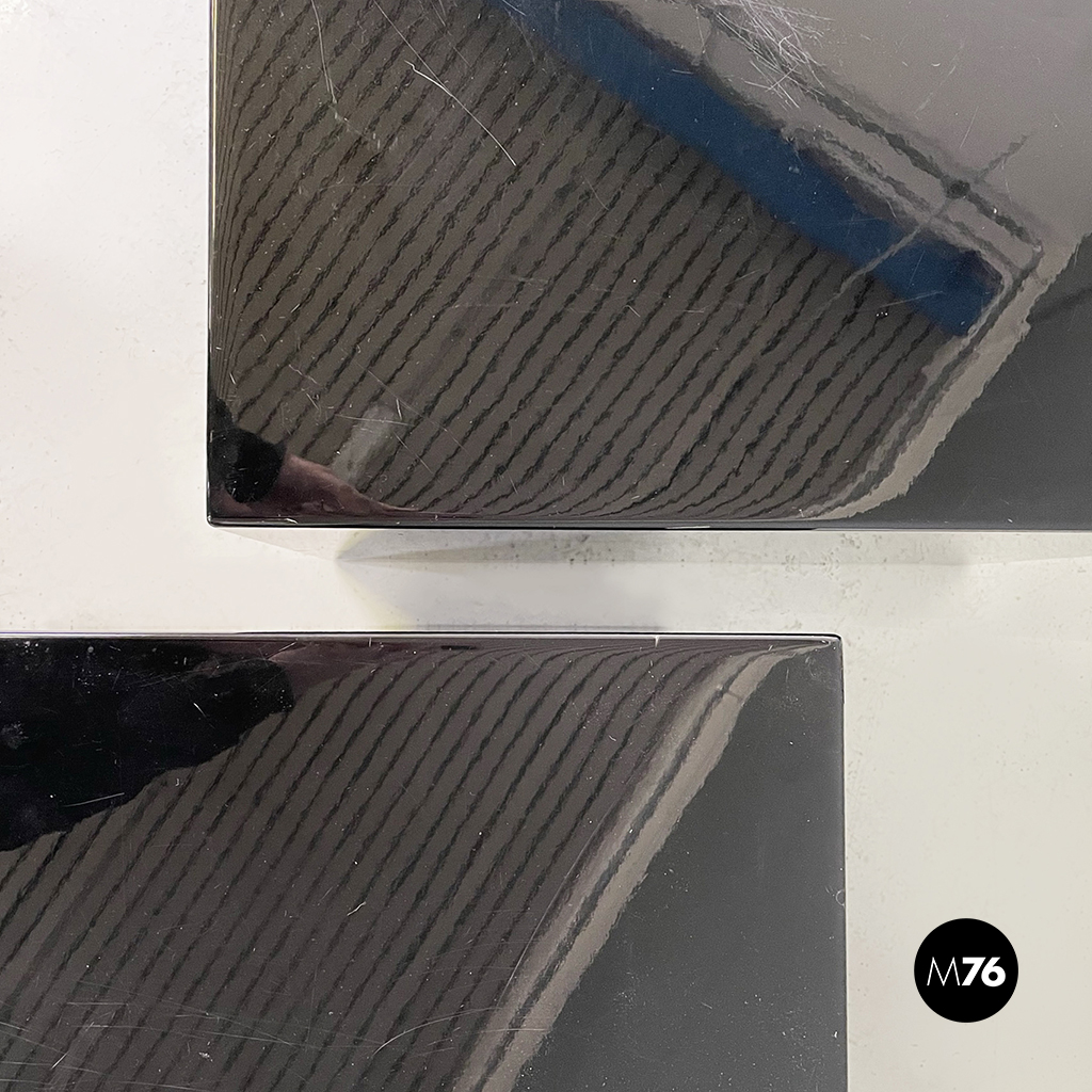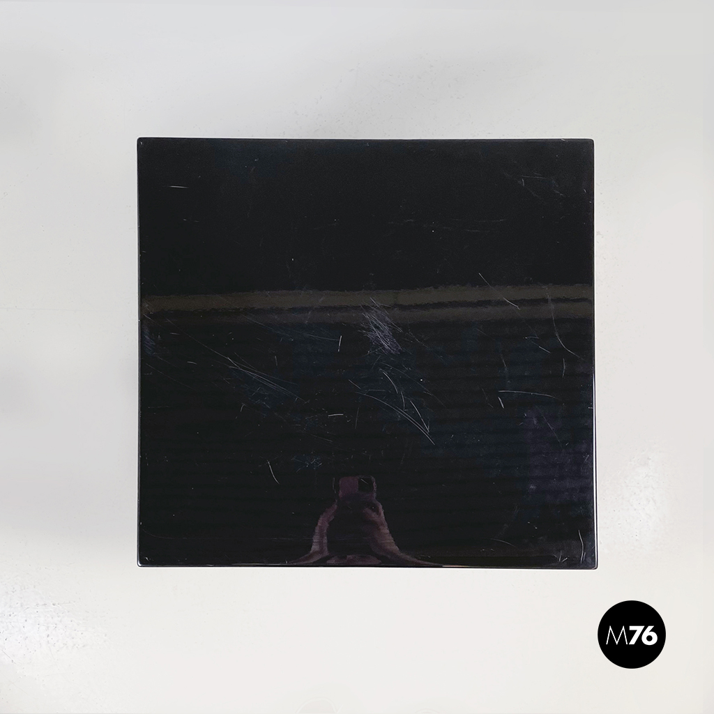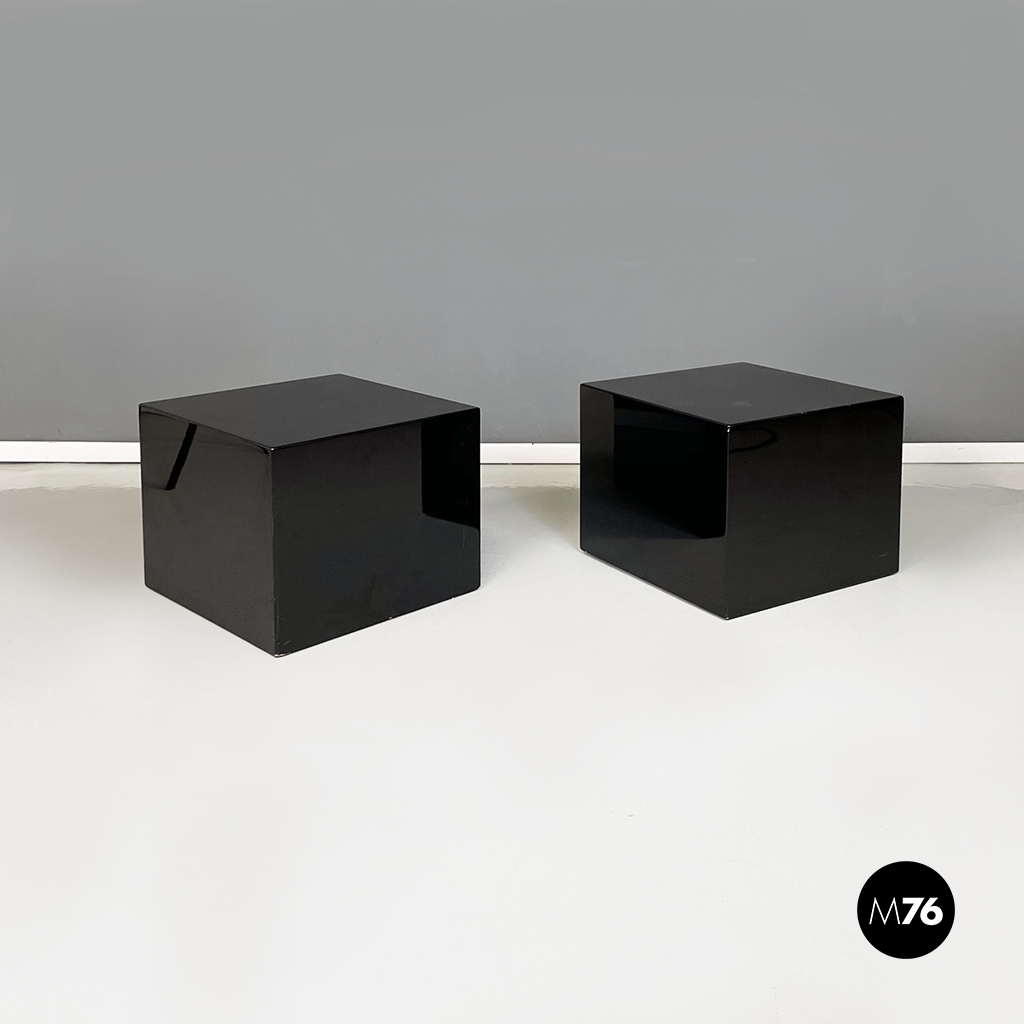 Coppia di tavoli da caffè con piano quadrato interamente in legno laccato nero. I bordi del tavolo sono arrotondati. Alla base sono presenti delle ruote. Possono essere usati anche come comodini espositori piedistalli o tavoli laterali.