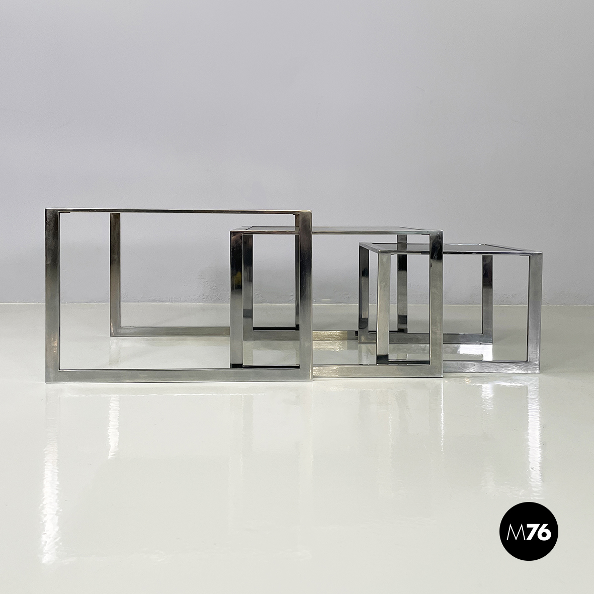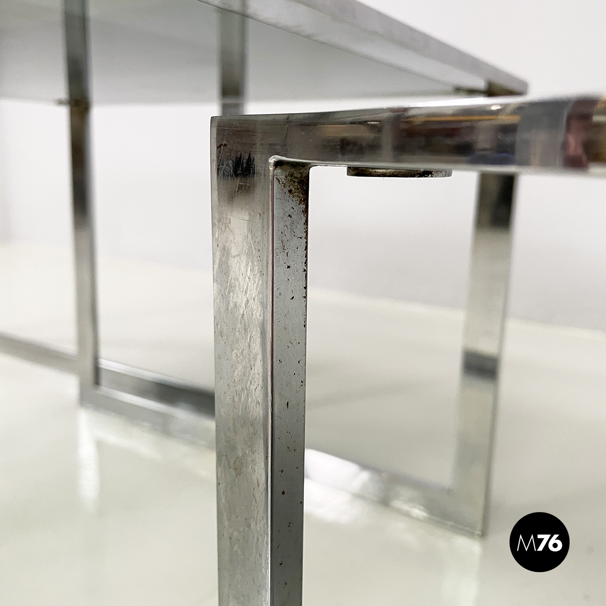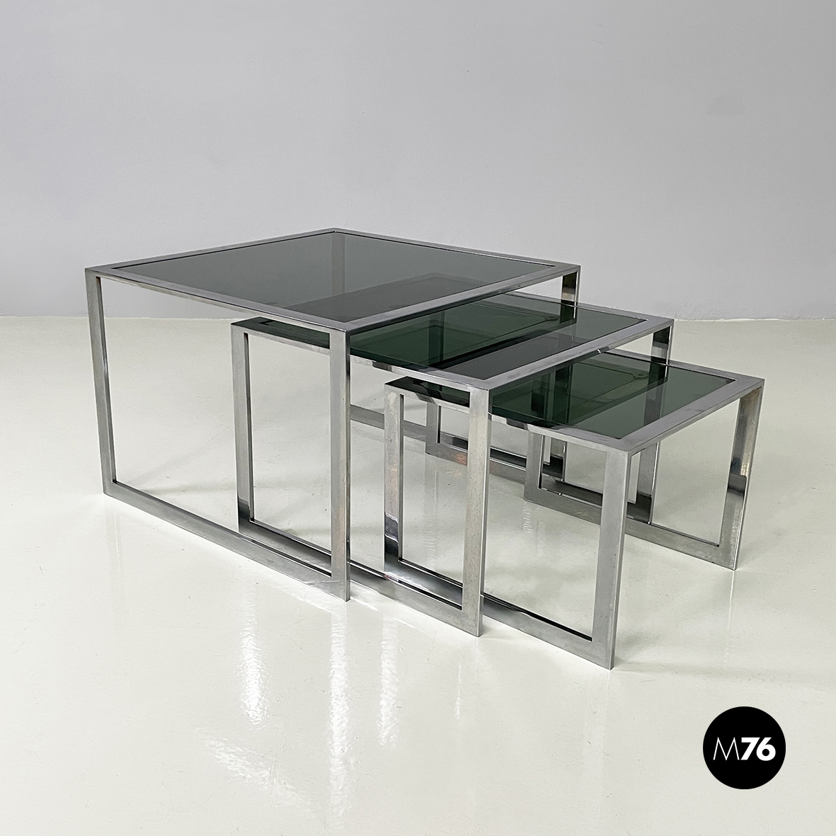Tris di tavoli da caffè con piano quadrato in vetro fumè. La struttura è in listelli in metallo cromato.
