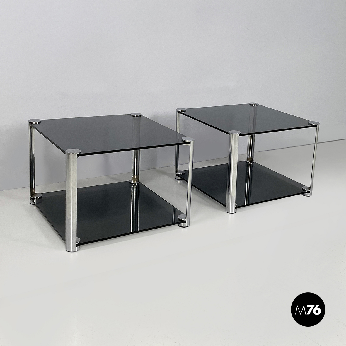 Coppia di tavoli da caffè con doppio ripiano squadrato in vetro fumé. La struttura di un tavolo è composta da quattro cilindri in metallo cromato nei quali si incastra il piano. Piedini tondi in gomma nera. Utilizzabili anche come comodini.