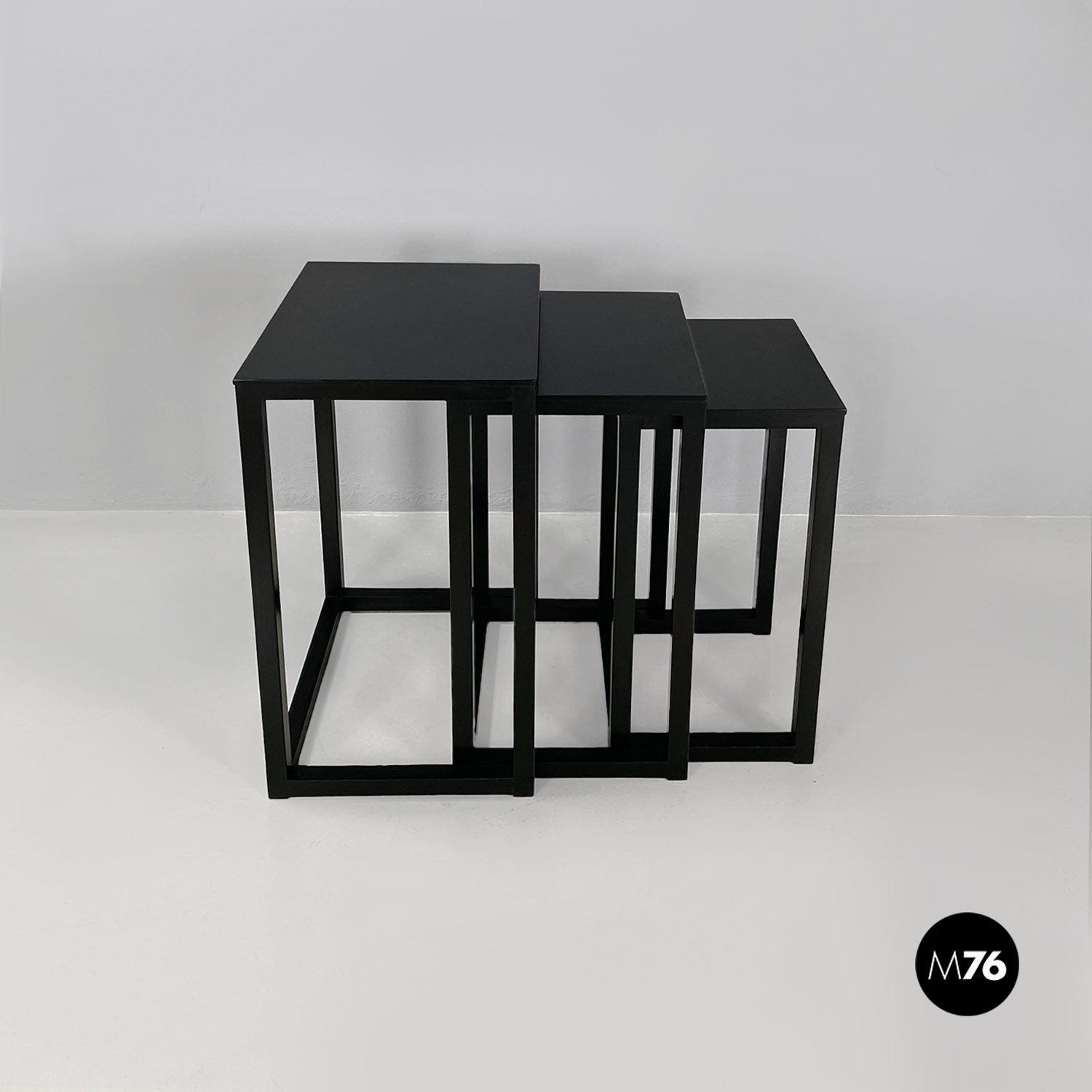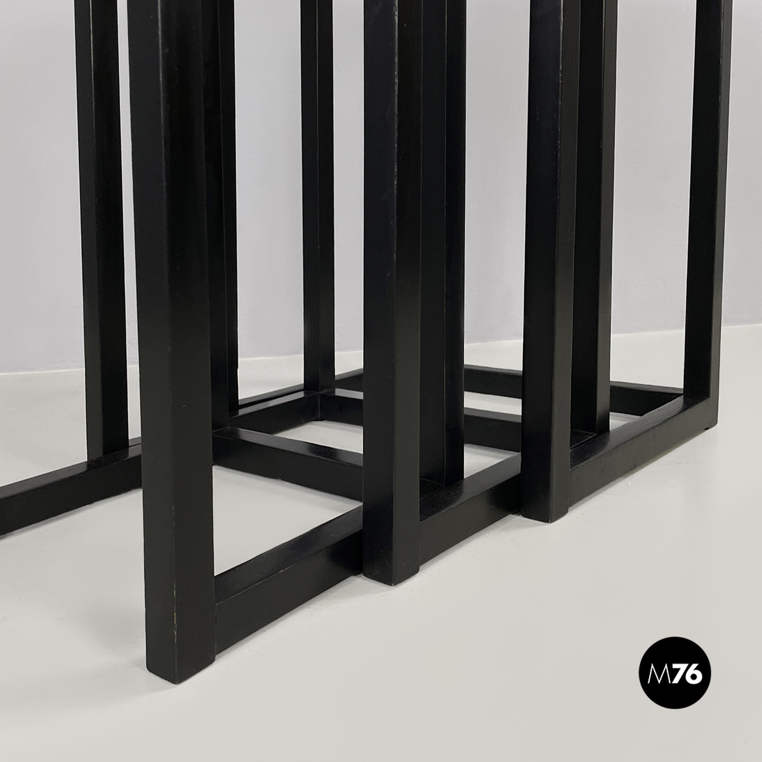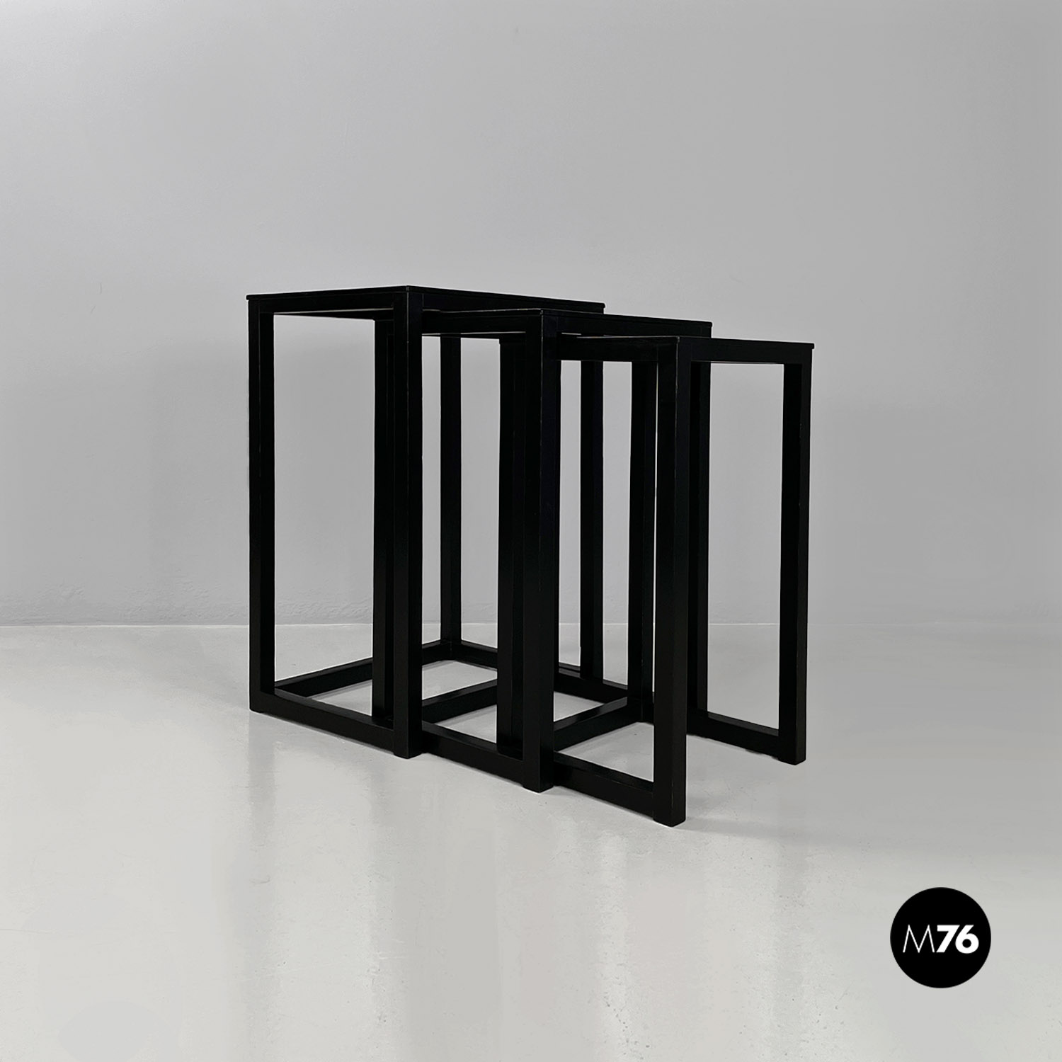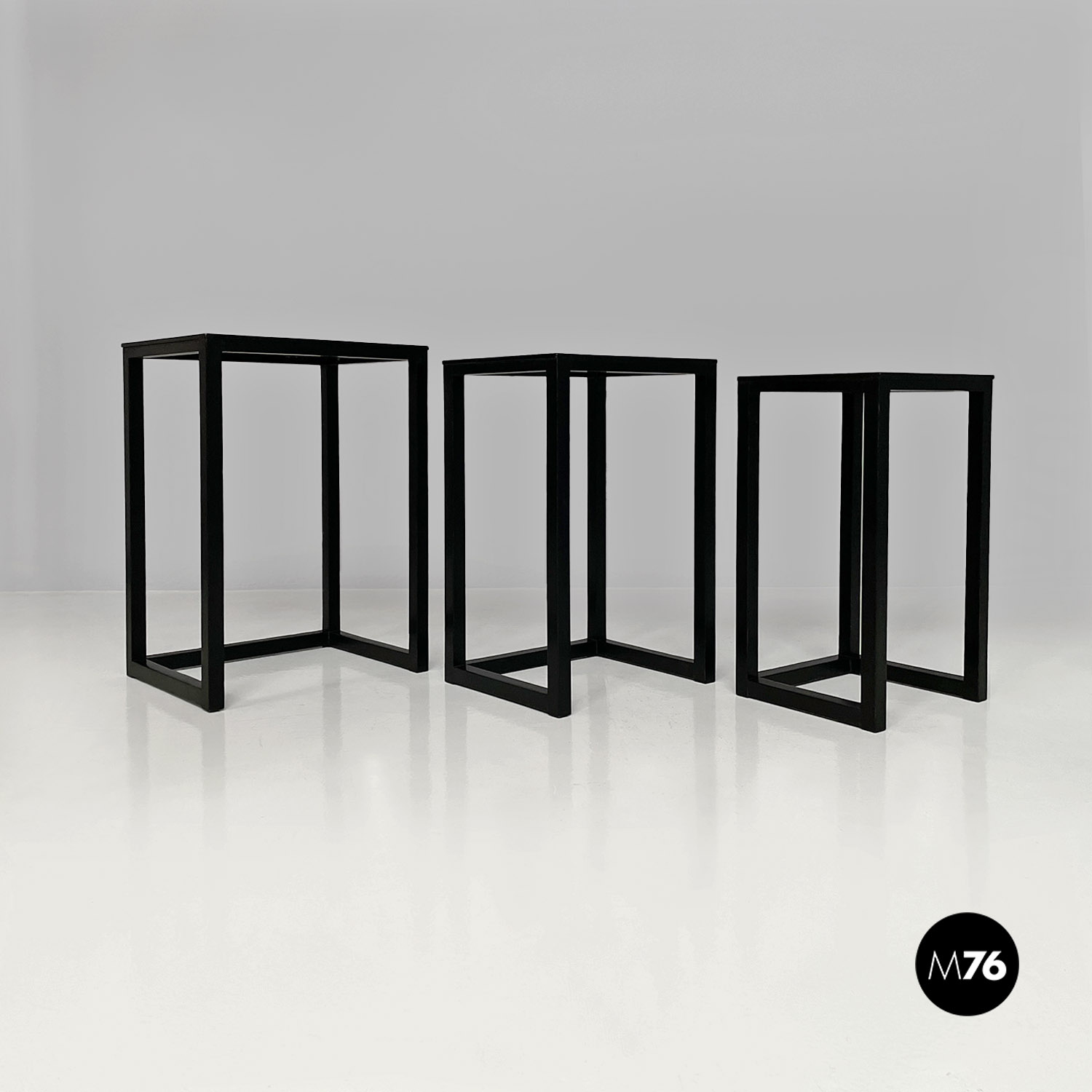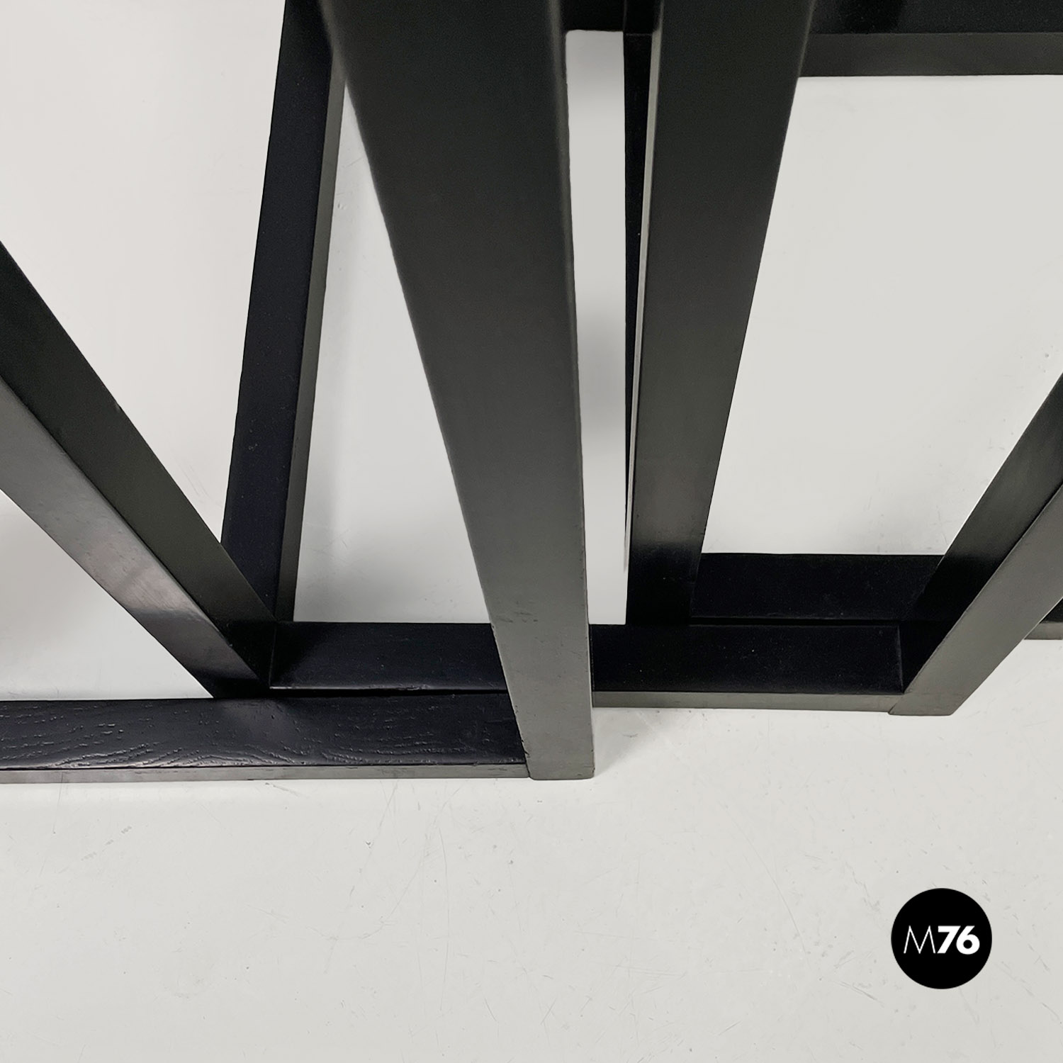 Set di tavoli da caffè modello Satztische con struttura in legno massello di frassino tinto in color nero e piano con impiallacciatura di frassino nero sovrapponibili infatti si incastrano perfettamente uno all’interno dell’altro. Il piano dei tavolini è quasi un quadrato e la zampa è a sezione quadrata così da creare un gioco di geometrie quando i tavolini sono uno dentro l’altro.