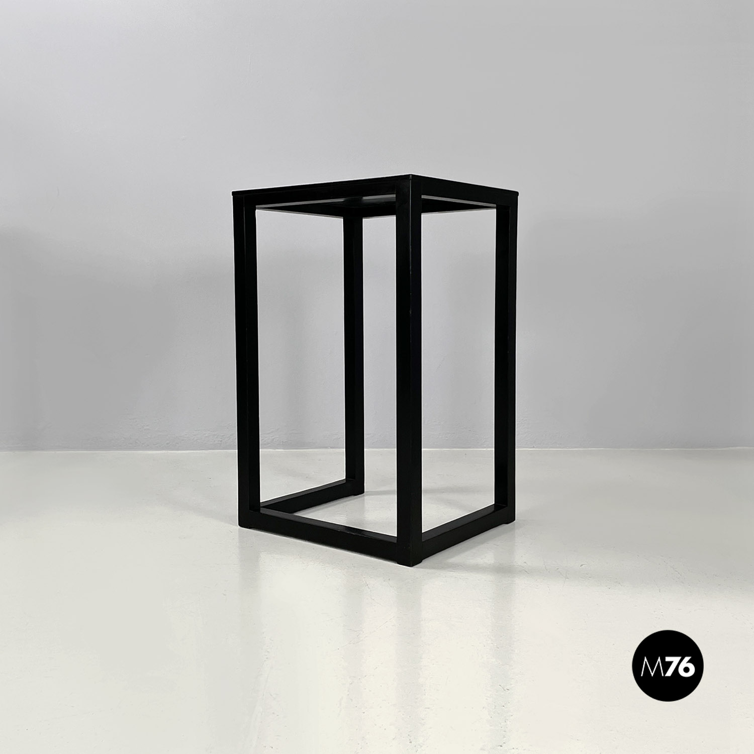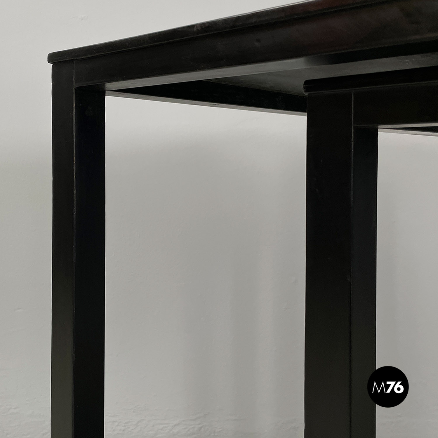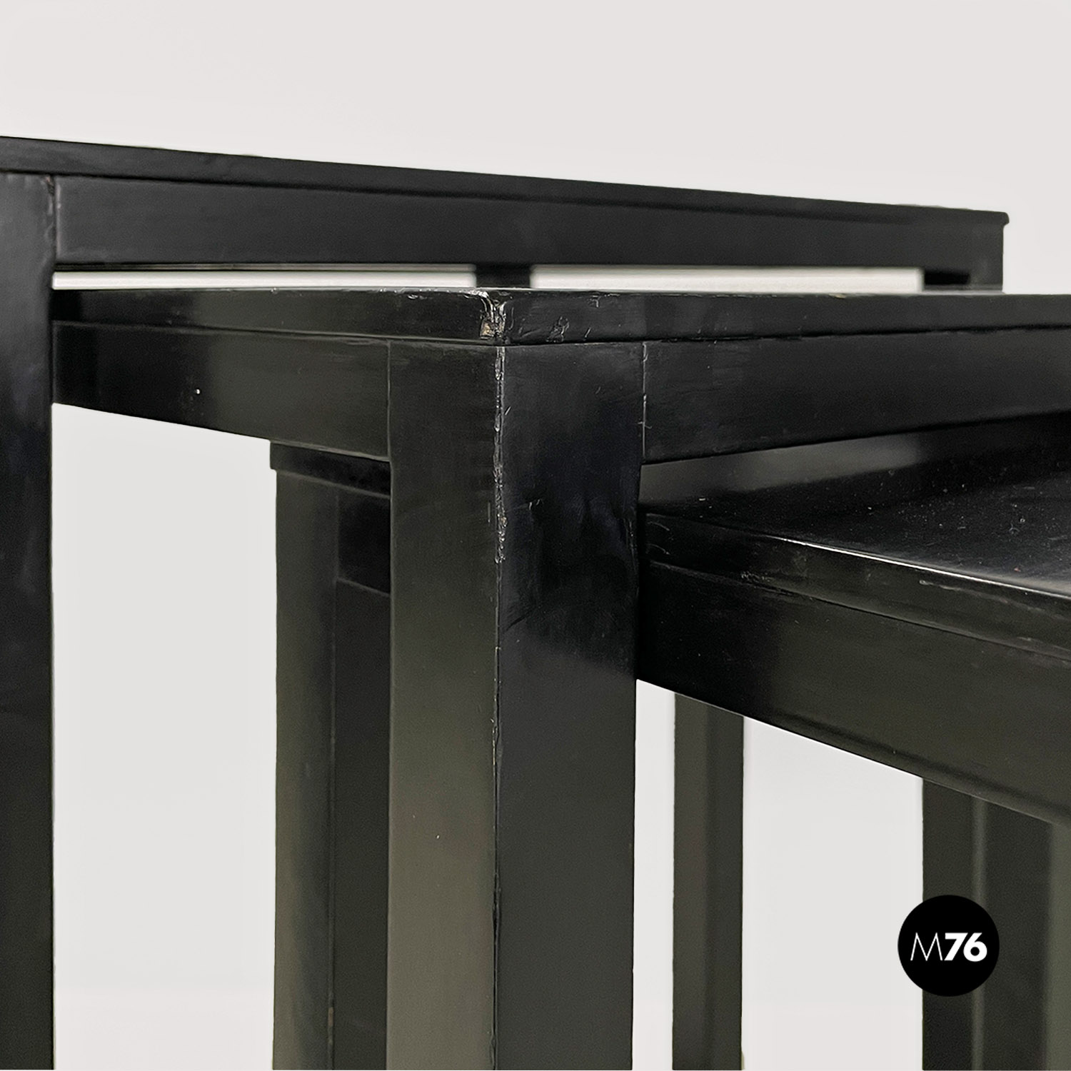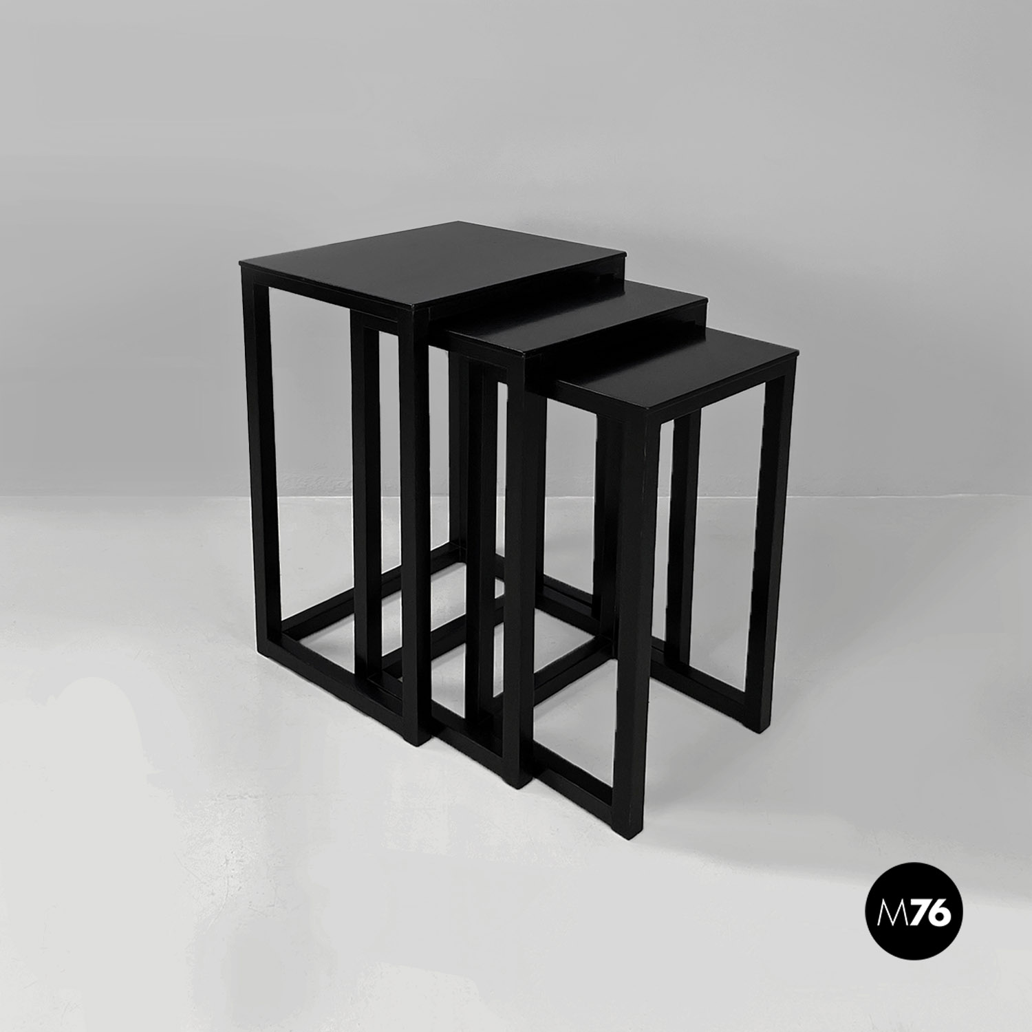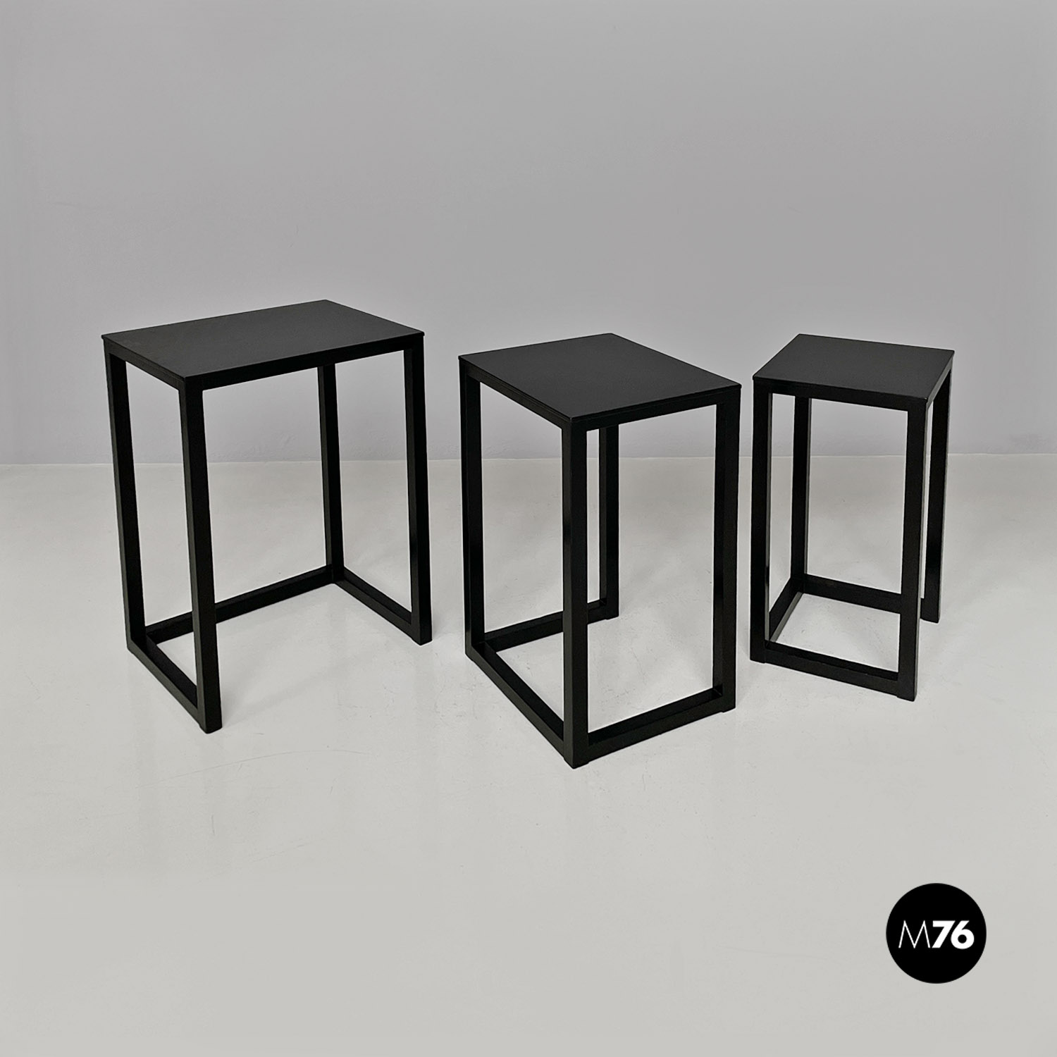Set di tavoli da caffè modello Satztische con struttura in legno massello di frassino tinto in color nero e piano con impiallacciatura di frassino nero sovrapponibili infatti si incastrano perfettamente uno all’interno dell’altro. Il piano dei tavolini è quasi un quadrato e la zampa è a sezione quadrata così da creare un gioco di geometrie quando i tavolini sono uno dentro l’altro.