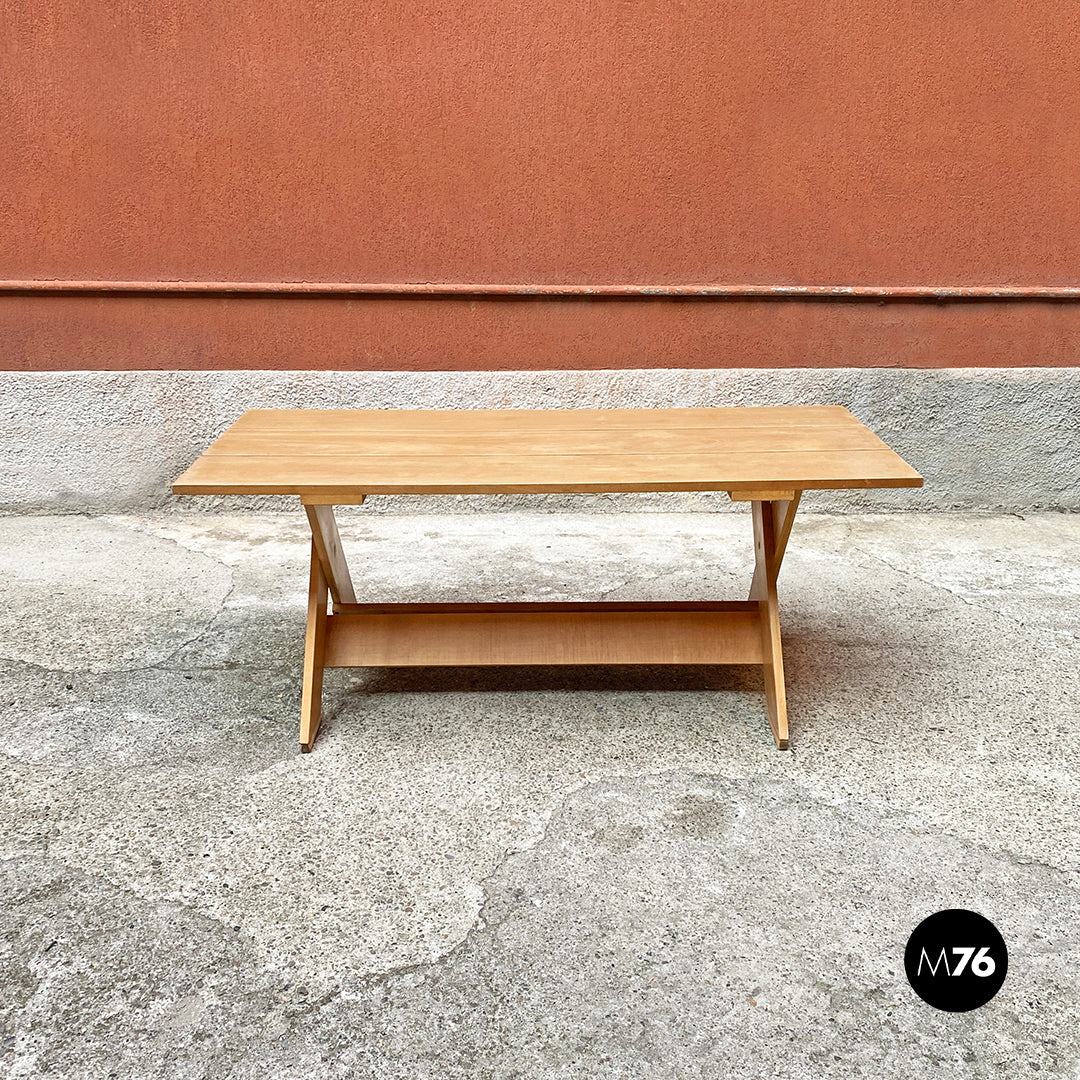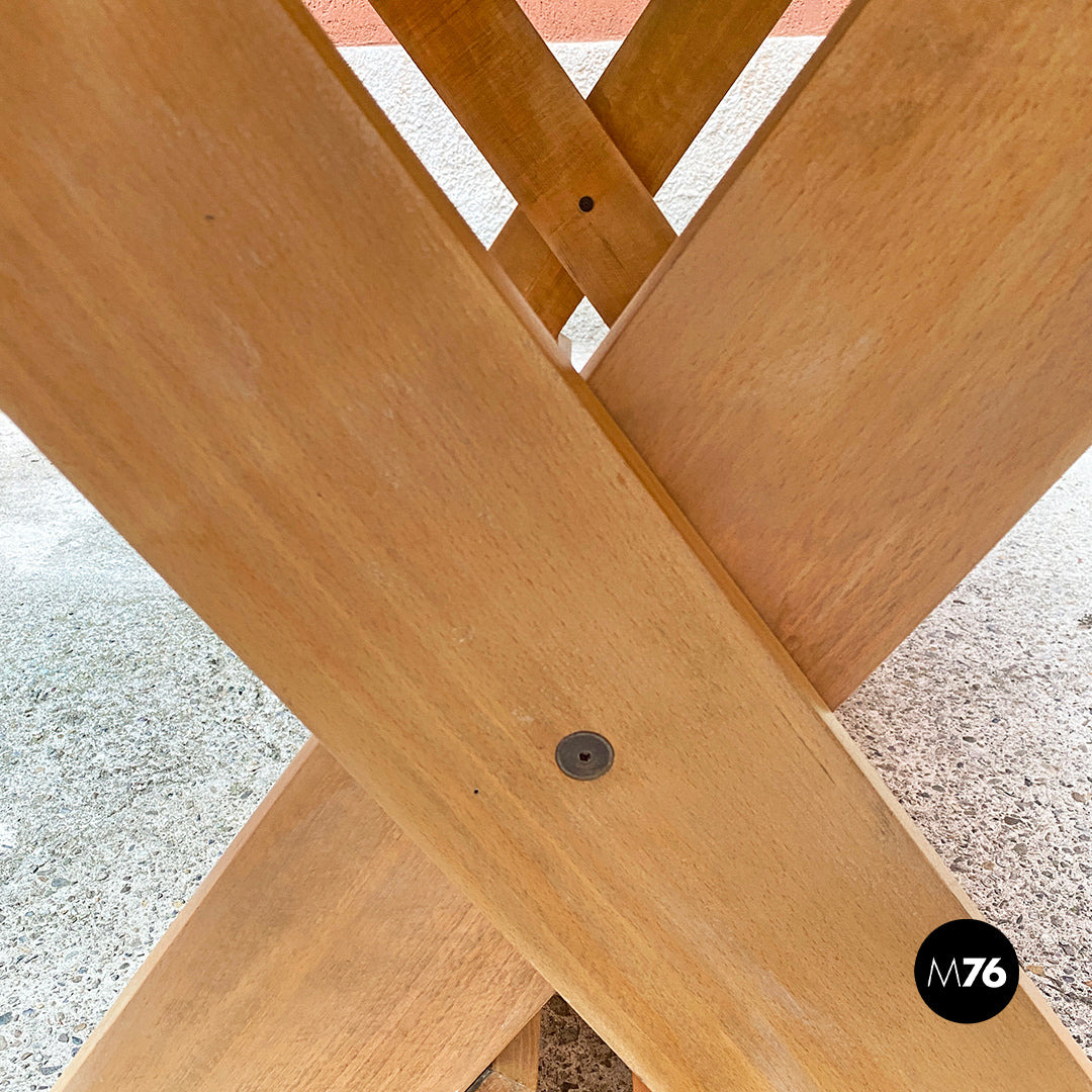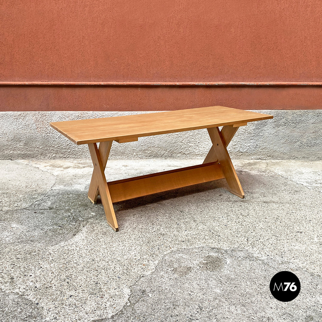 Tavolo da pranzo della serie Crate con piano formato da tavole parallele in massello e con zampe incrociate a formare una X.