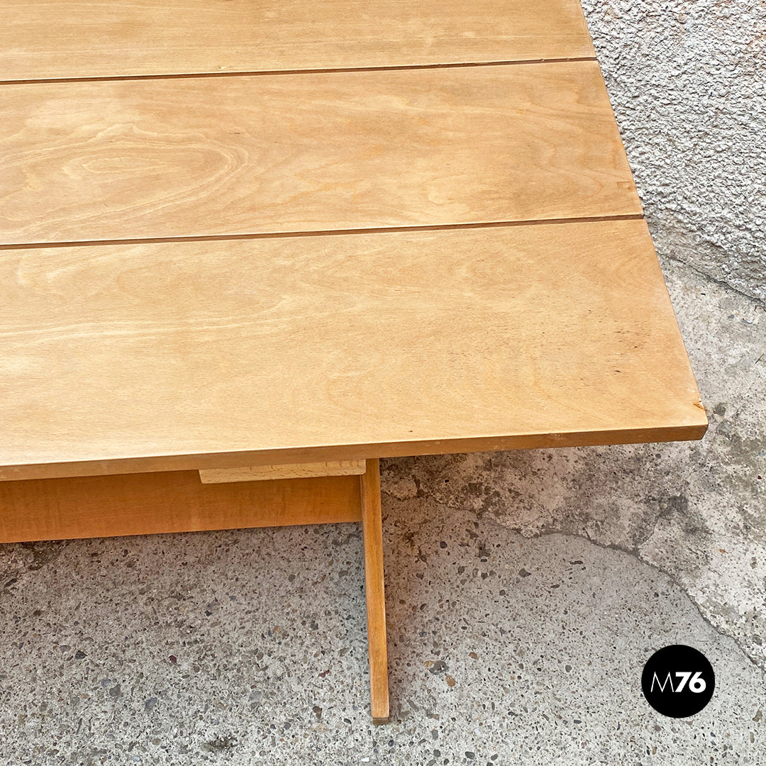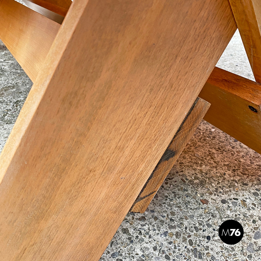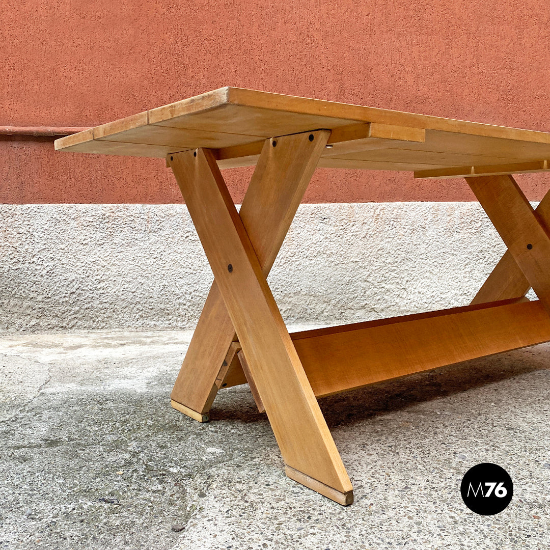 Tavolo da pranzo della serie Crate con piano formato da tavole parallele in massello e con zampe incrociate a formare una X.