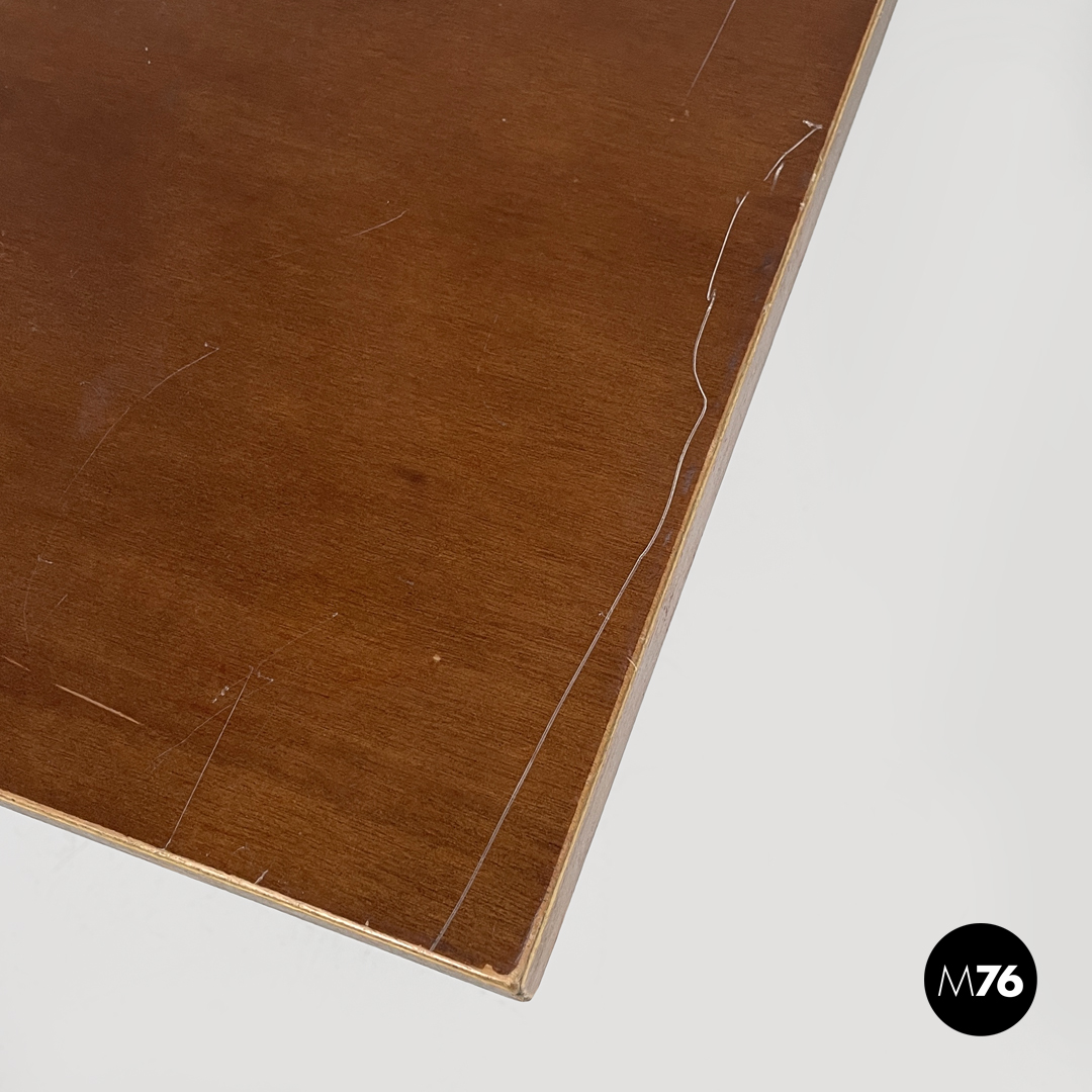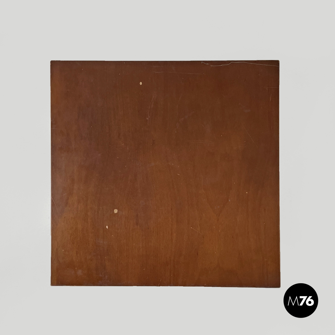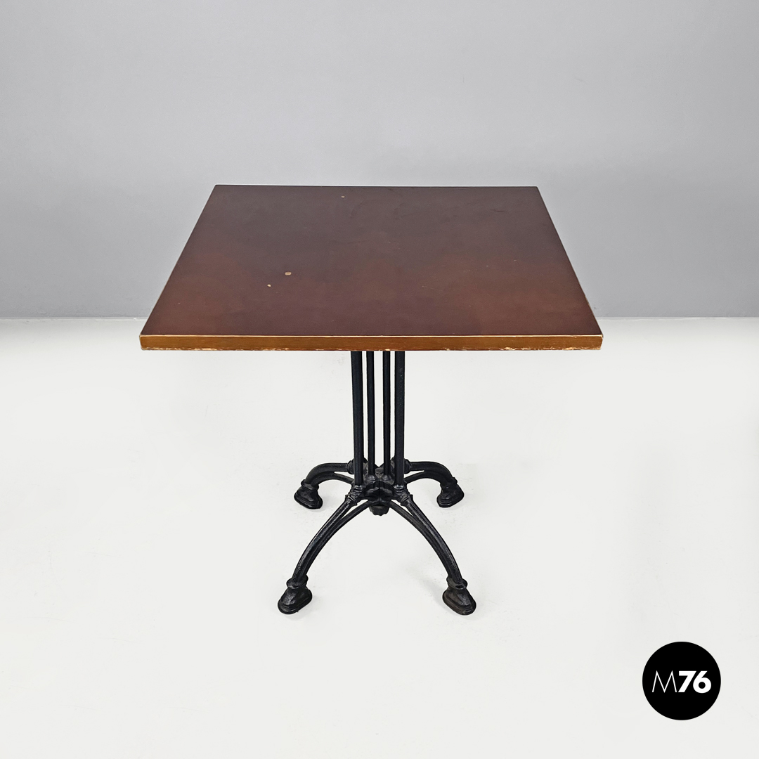 Tavolo da bar da caffè o da pranzo con piano in legno quadrato. La struttura è in ghisa verniciata nera ed è composta da quattro tubolari interni e quattro esterni che partono curvando da sotto il piano si uniscono nella parte centrale alta e bassa creando un elemento decorativo per poi aprirsi all’appoggio a terra in quattro razze stondate con piedino lavorato. Utilizzabile anche come piccolo tavolo da pranzo.