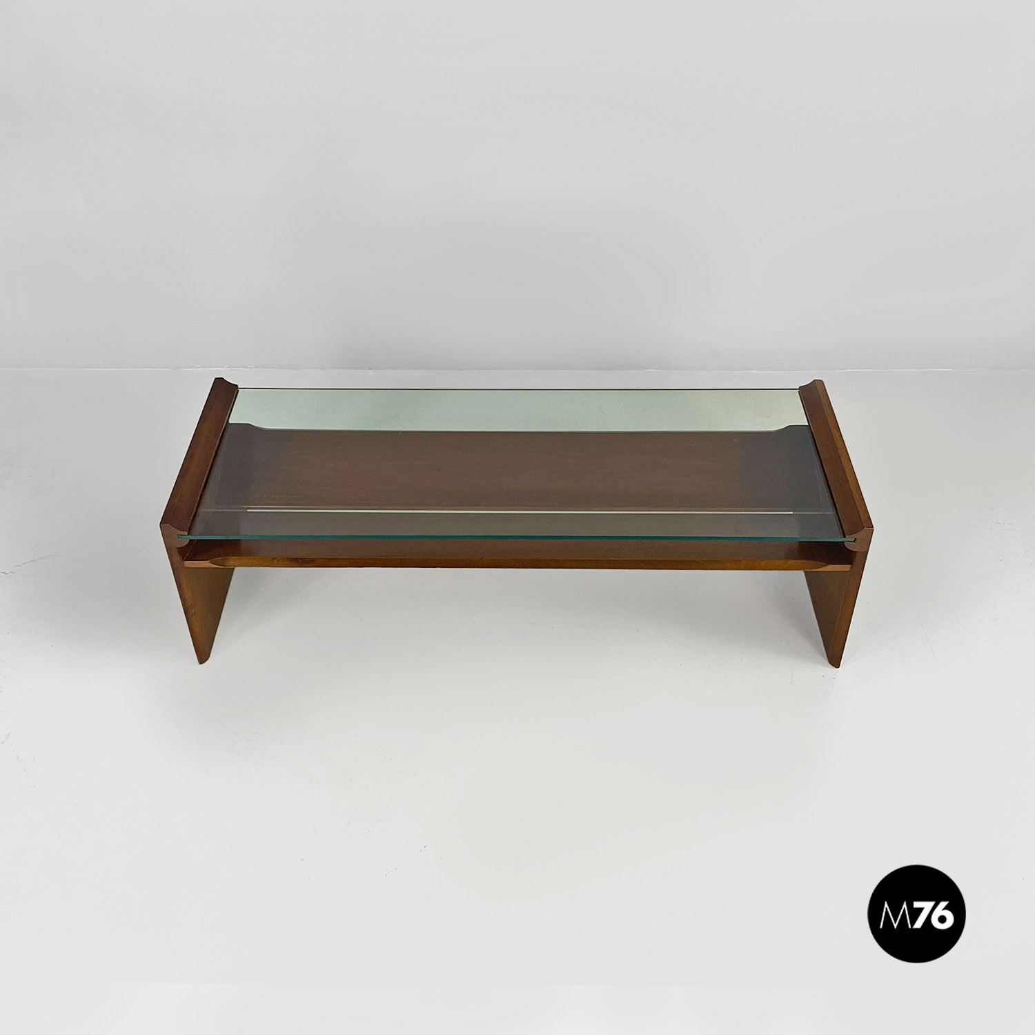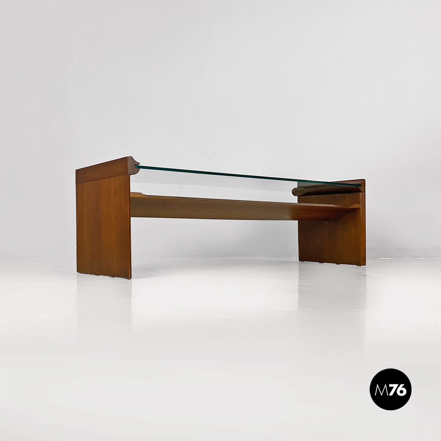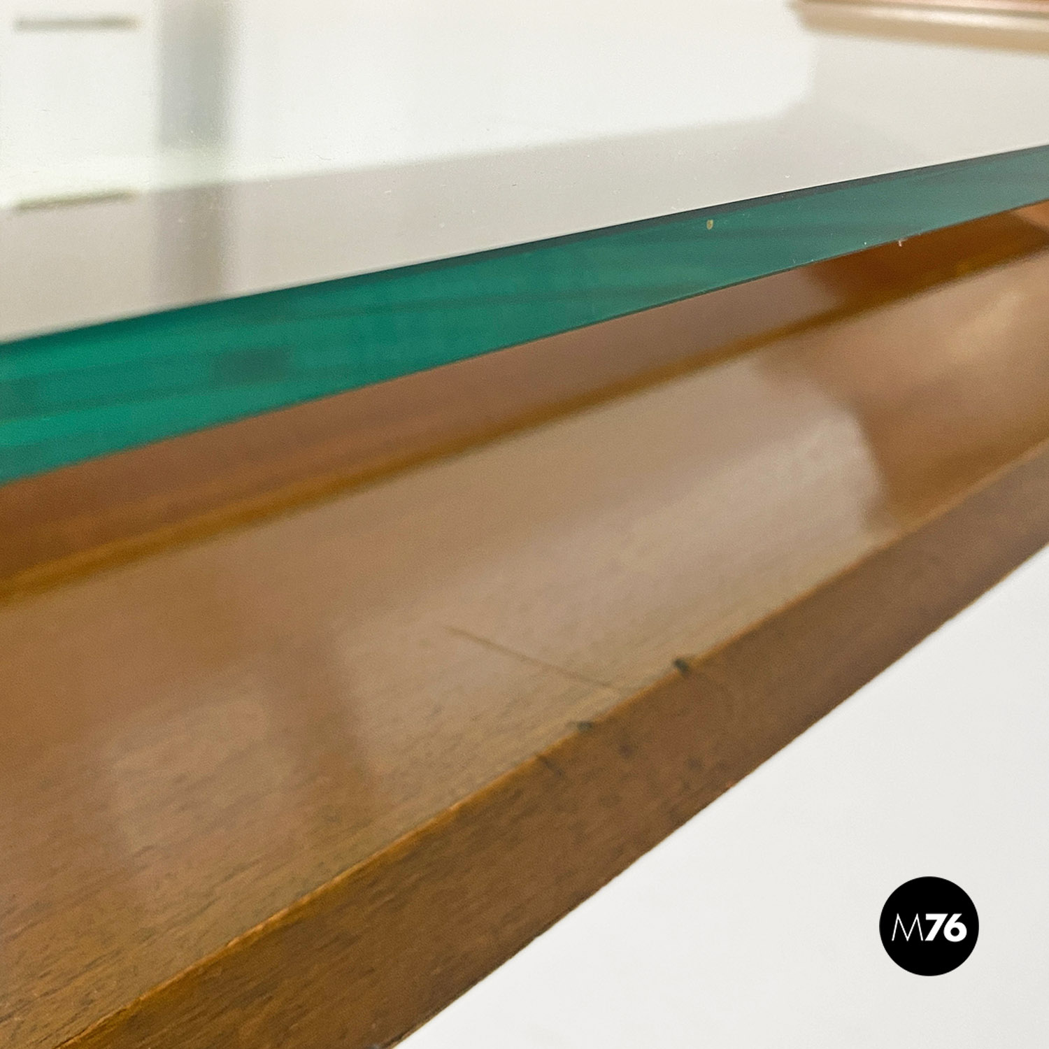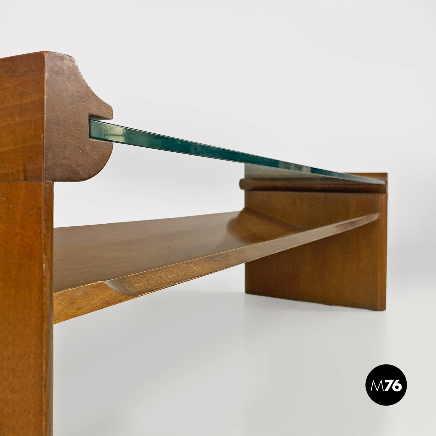Tavolo da caffè modello Acca con struttura in legno di forma rettangolare con dettagli sagomati e scanalature all’interno dei fianchi dove si inserisce il piano in vetro verde acqua marina. Con portariviste nella parte inferiore del tavolino diviso in due metà inclinate.
