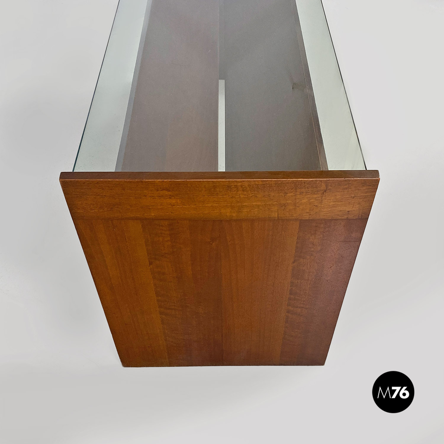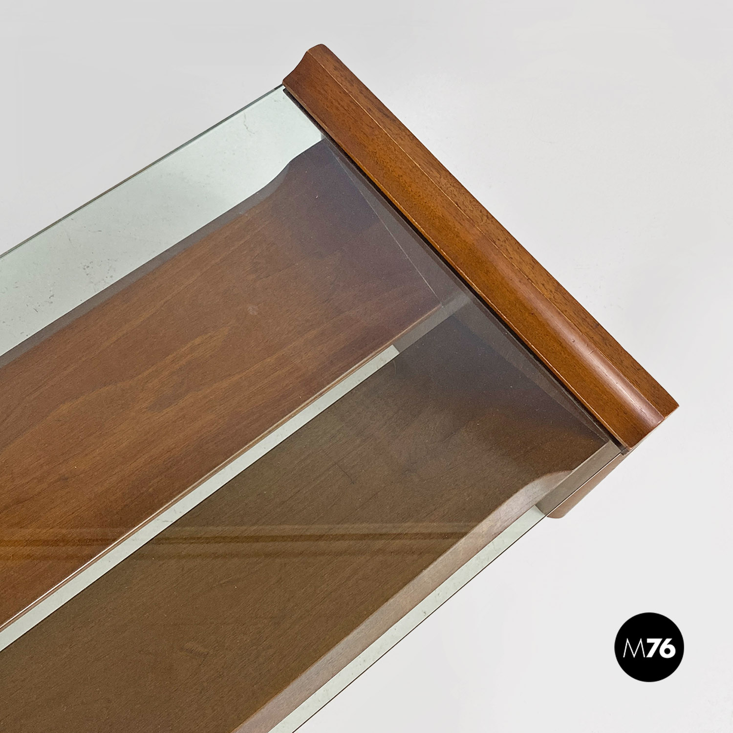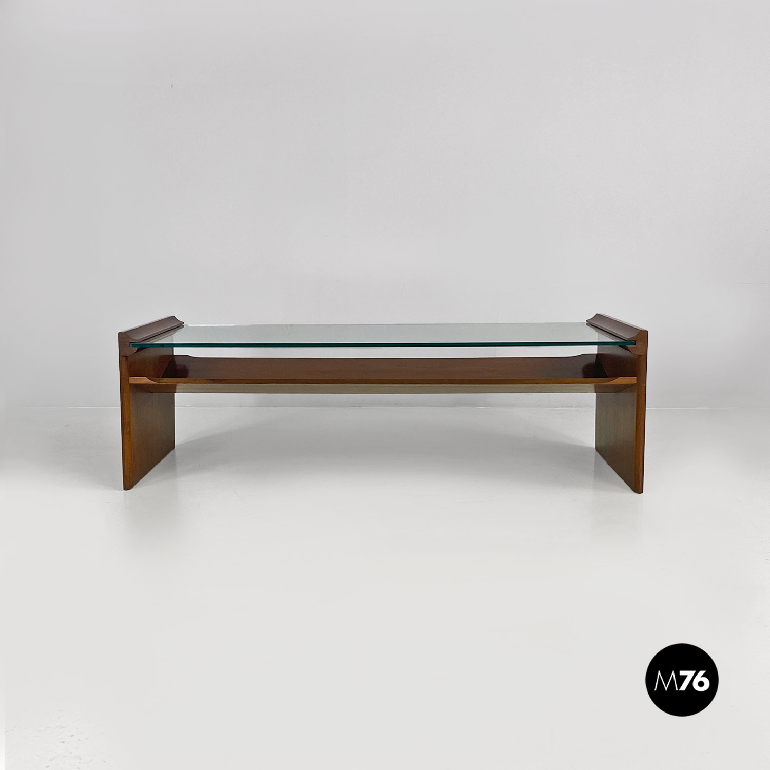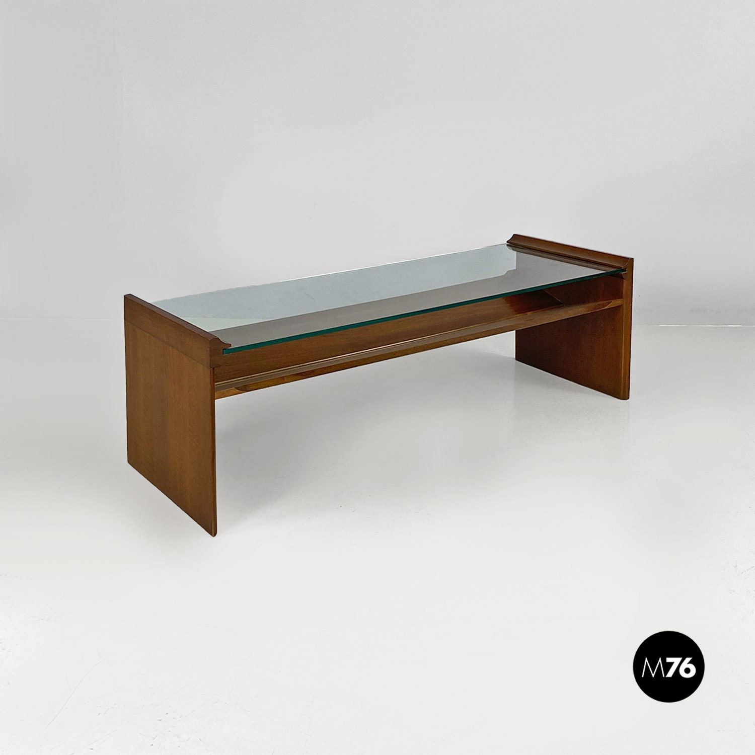 Tavolo da caffè modello Acca con struttura in legno di forma rettangolare con dettagli sagomati e scanalature all’interno dei fianchi dove si inserisce il piano in vetro verde acqua marina. Con portariviste nella parte inferiore del tavolino diviso in due metà inclinate.