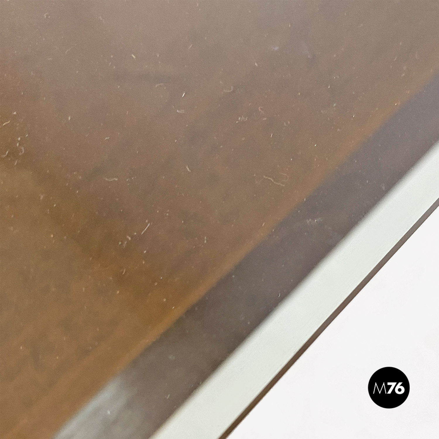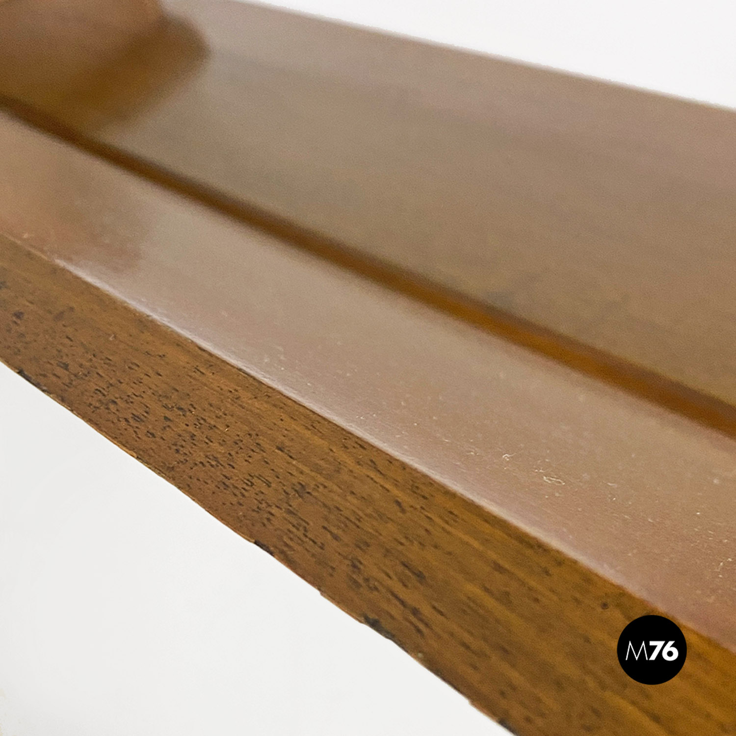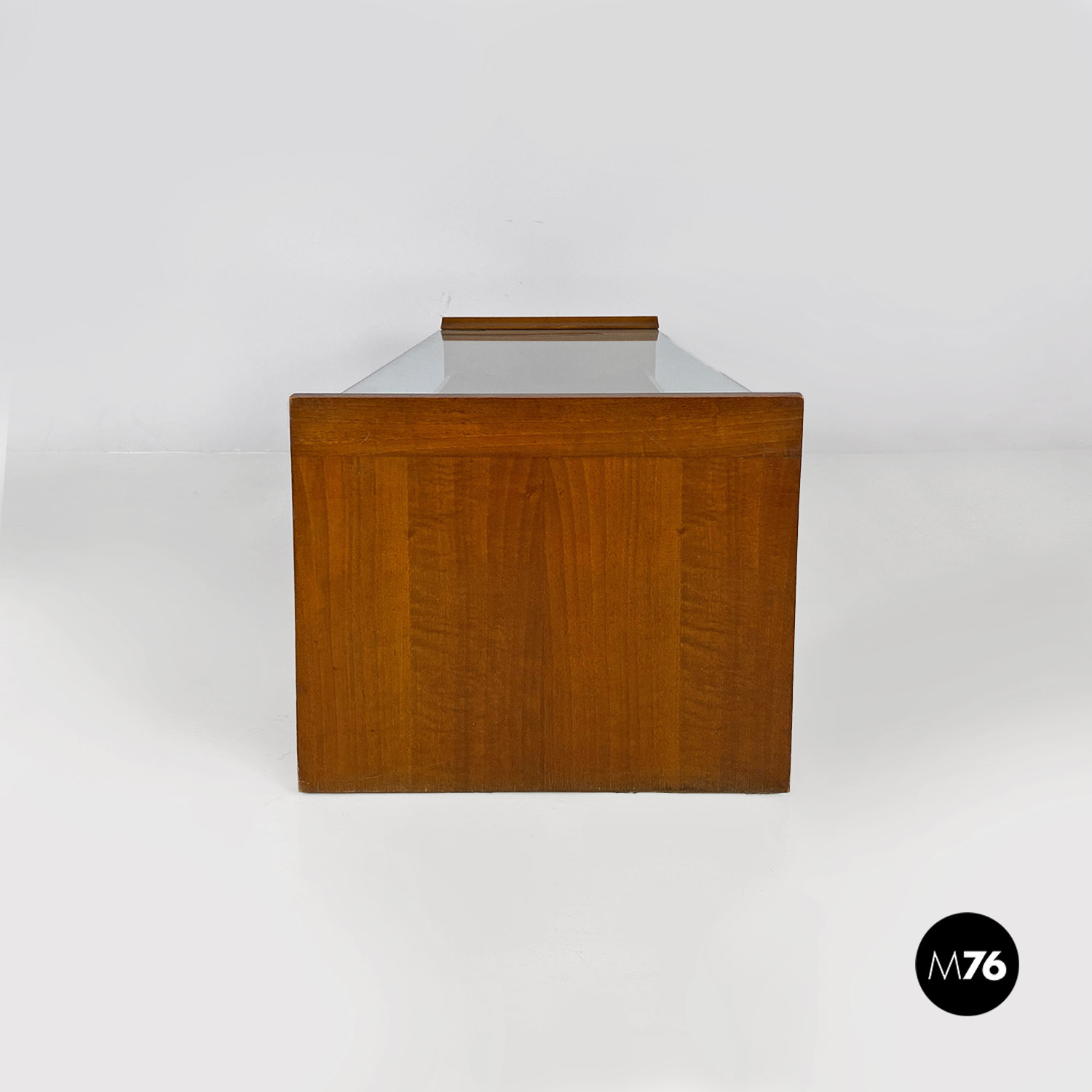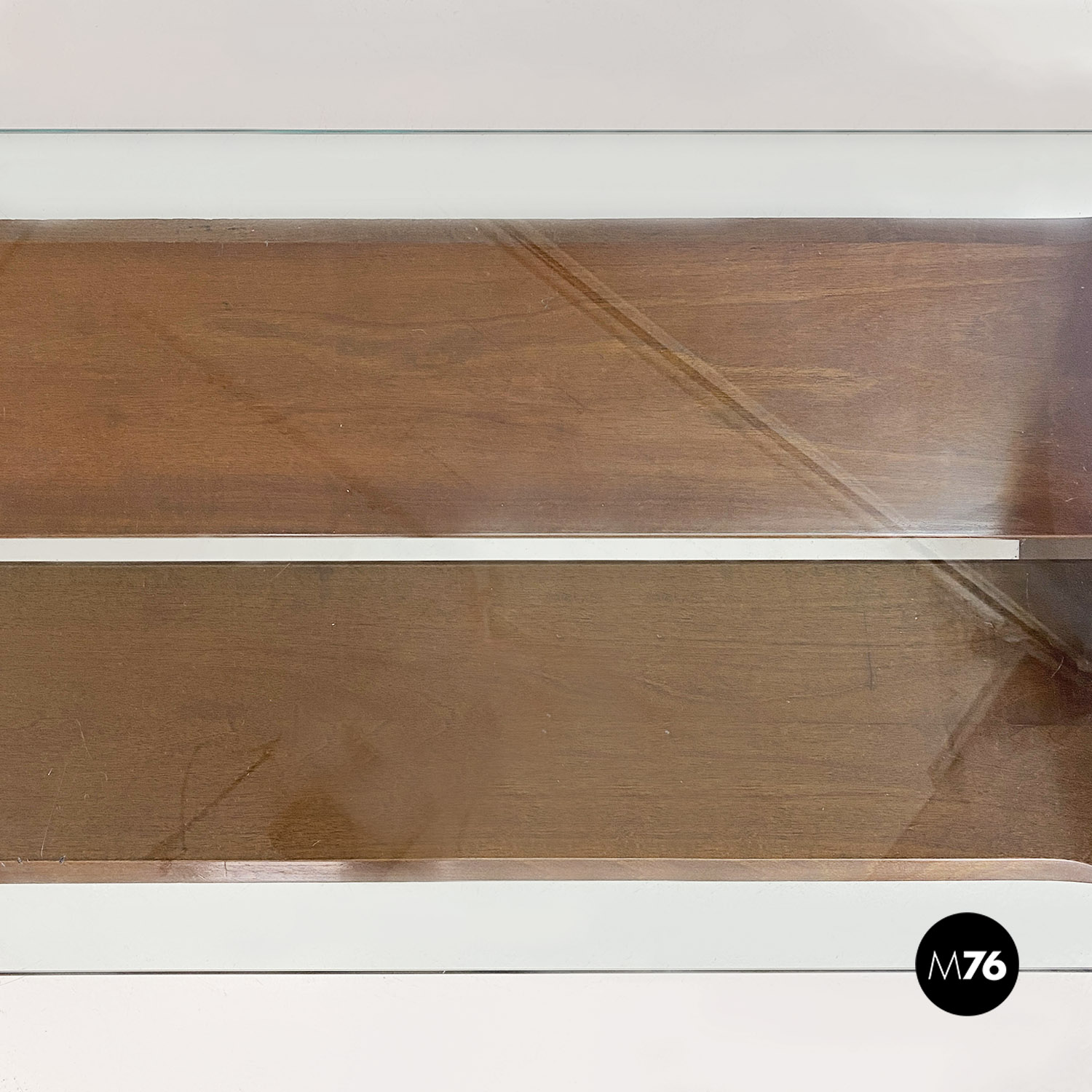 Tavolo da caffè modello Acca con struttura in legno di forma rettangolare con dettagli sagomati e scanalature all’interno dei fianchi dove si inserisce il piano in vetro verde acqua marina. Con portariviste nella parte inferiore del tavolino diviso in due metà inclinate.