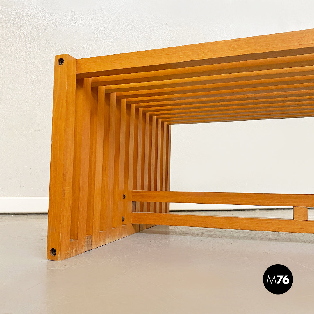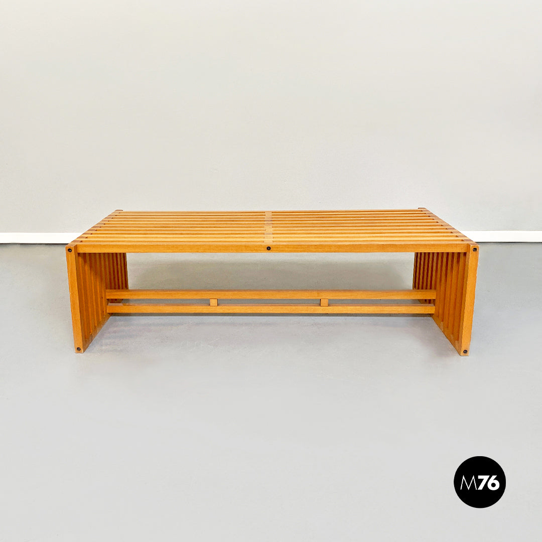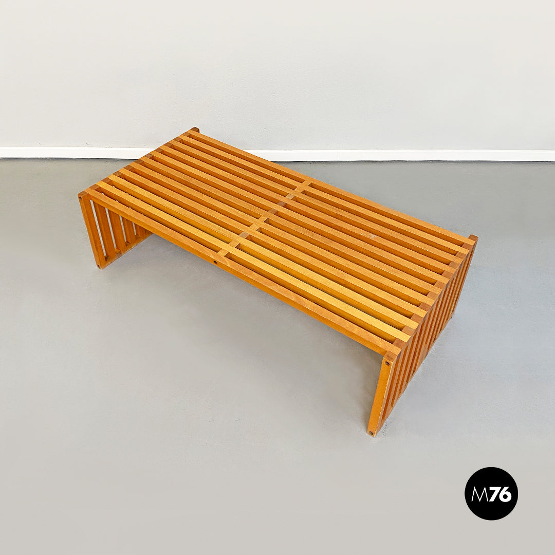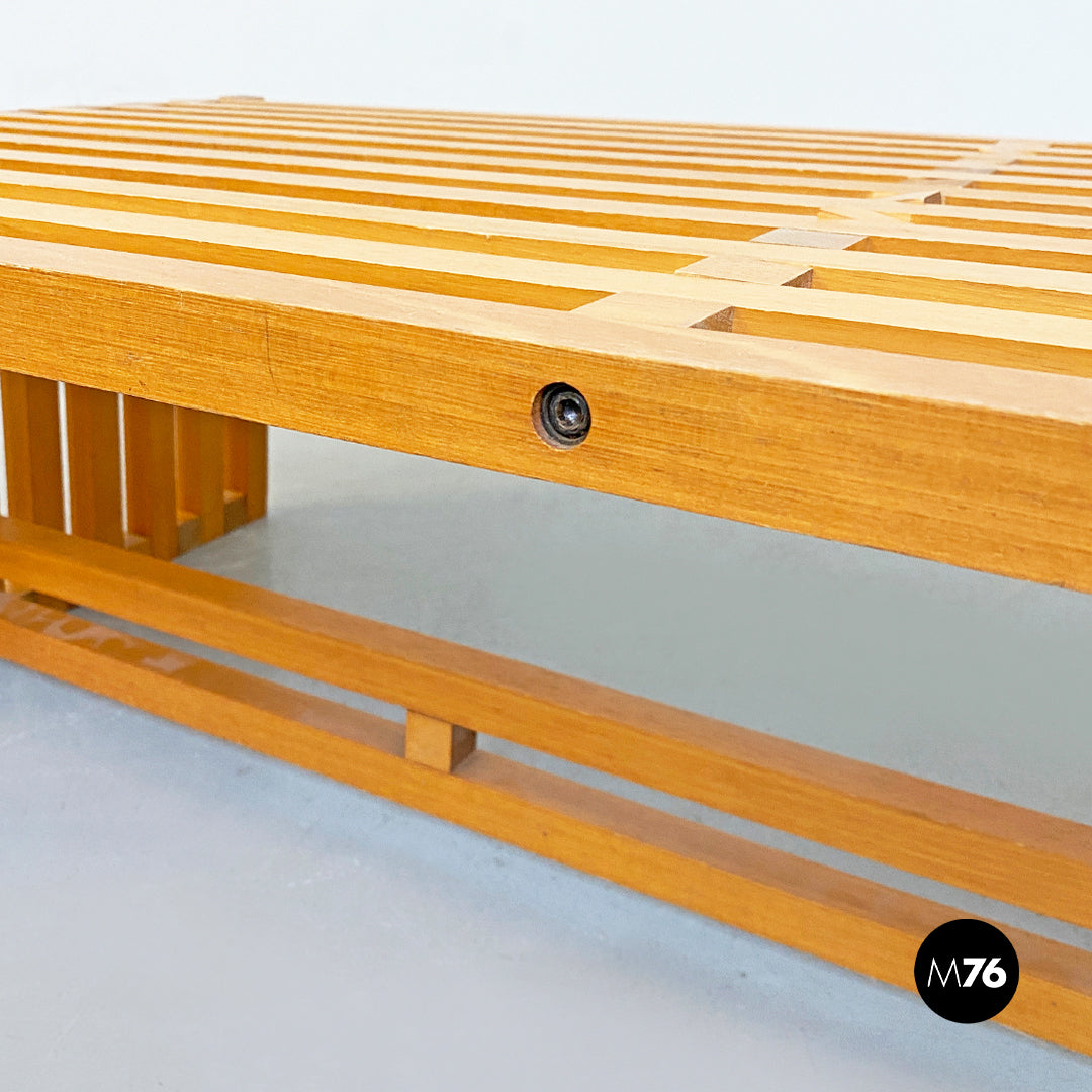 Tavolo da caffè modello Ara interamente realizzato a file di listelli di legno chiaro.