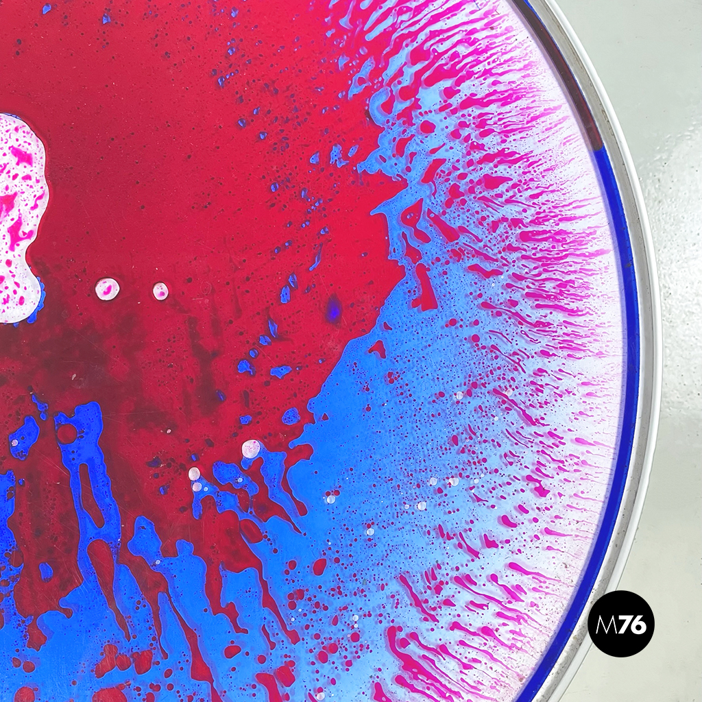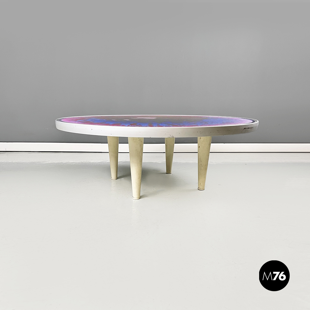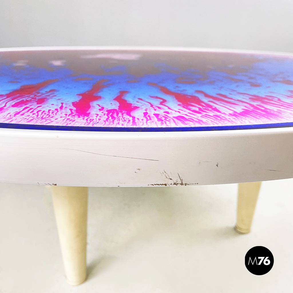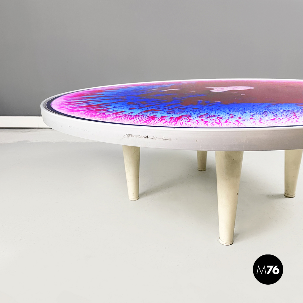 Tavolo da caffè con piano tondo in plastica trasparente e profili in metallo. Nel piano sono presenti degli oli colorati in rosa-fucsia e blu-azzurro. Questi oli grazie al movimento o alla pressione posta sul piano tondo creano effetti e giochi di colore tie dye. Zampe coniche in plastica bianca.