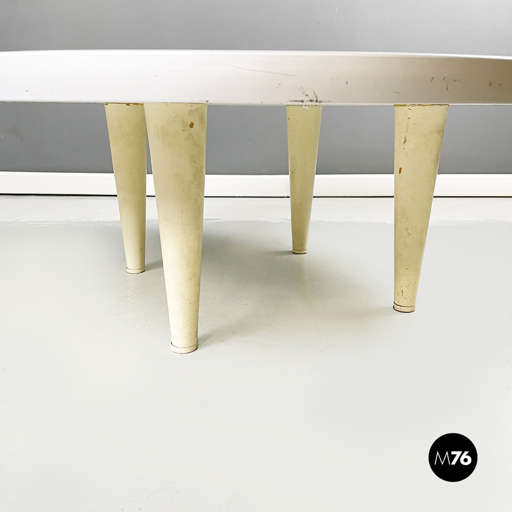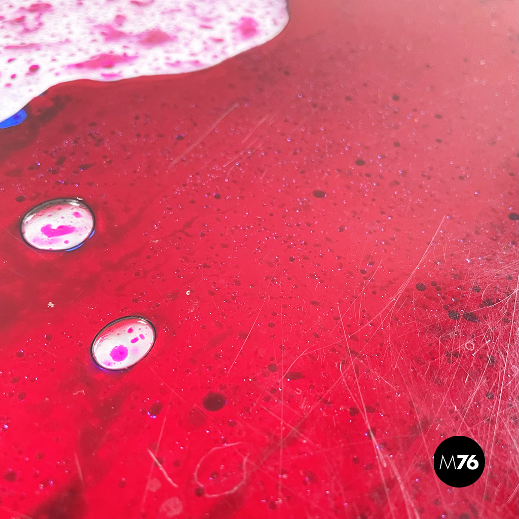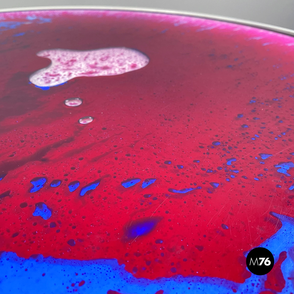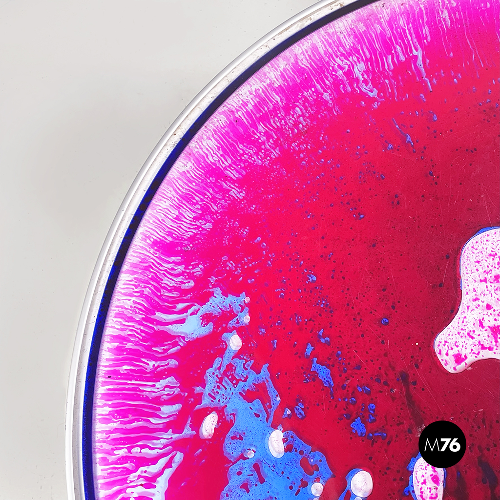 Tavolo da caffè con piano tondo in plastica trasparente e profili in metallo. Nel piano sono presenti degli oli colorati in rosa-fucsia e blu-azzurro. Questi oli grazie al movimento o alla pressione posta sul piano tondo creano effetti e giochi di colore tie dye. Zampe coniche in plastica bianca.