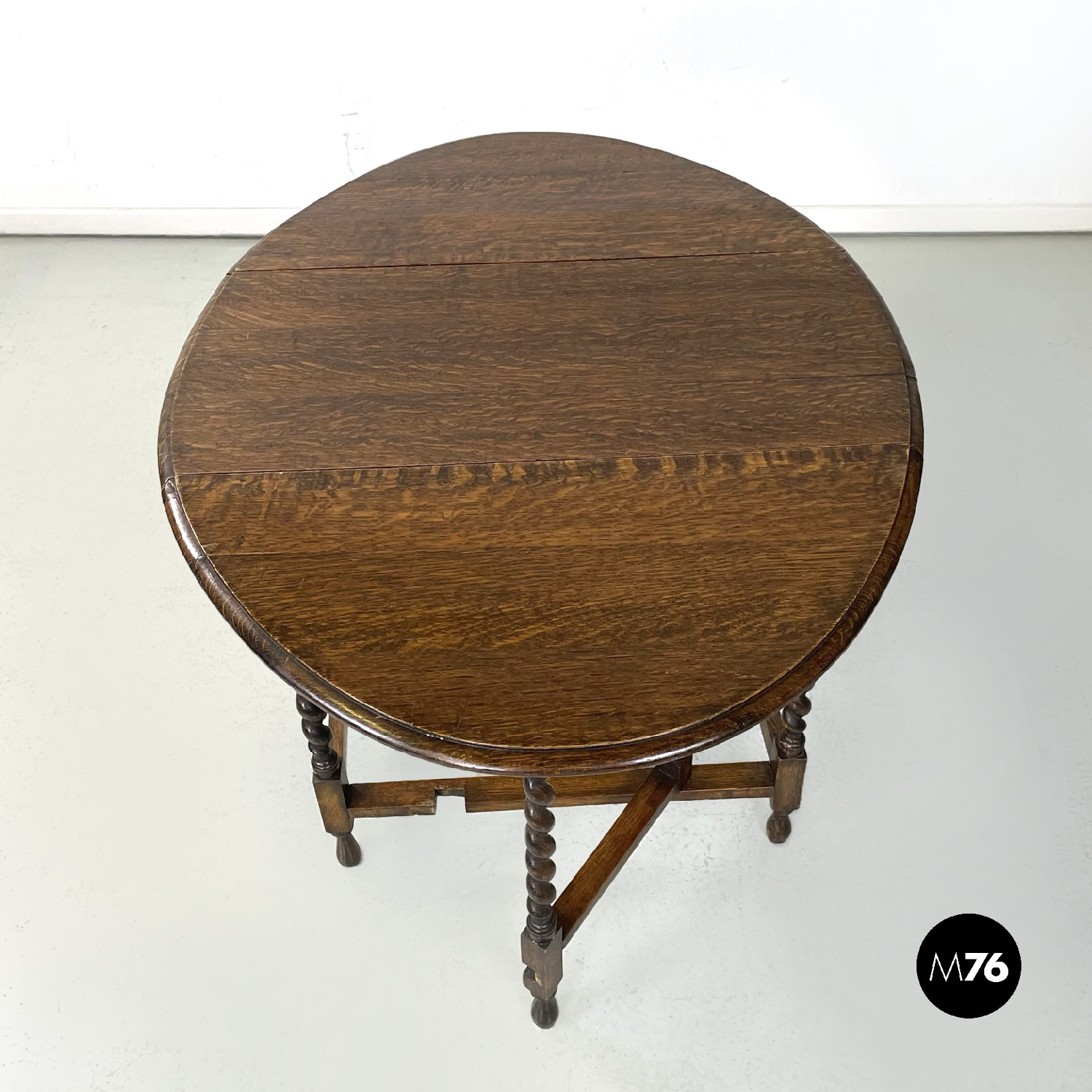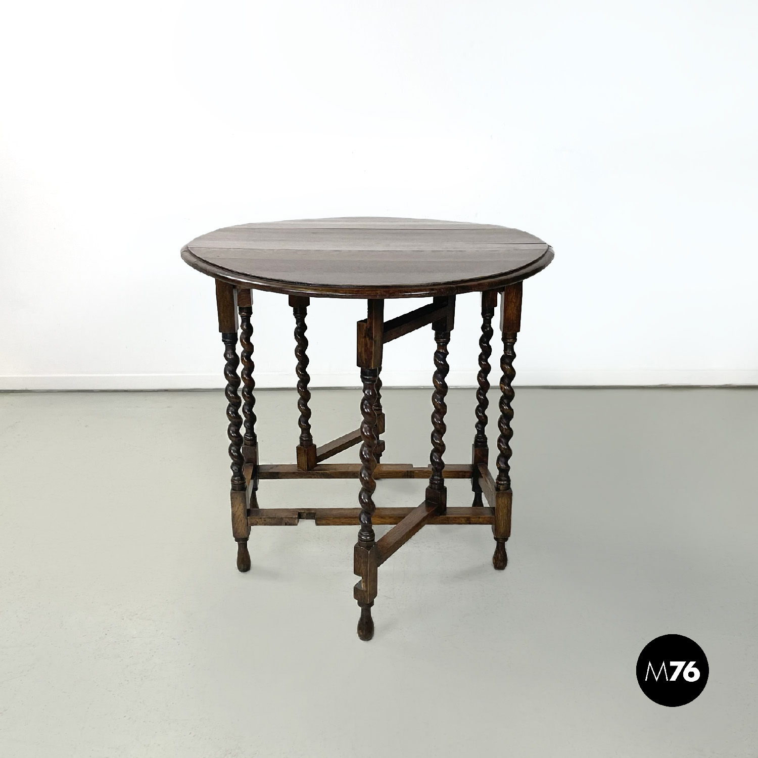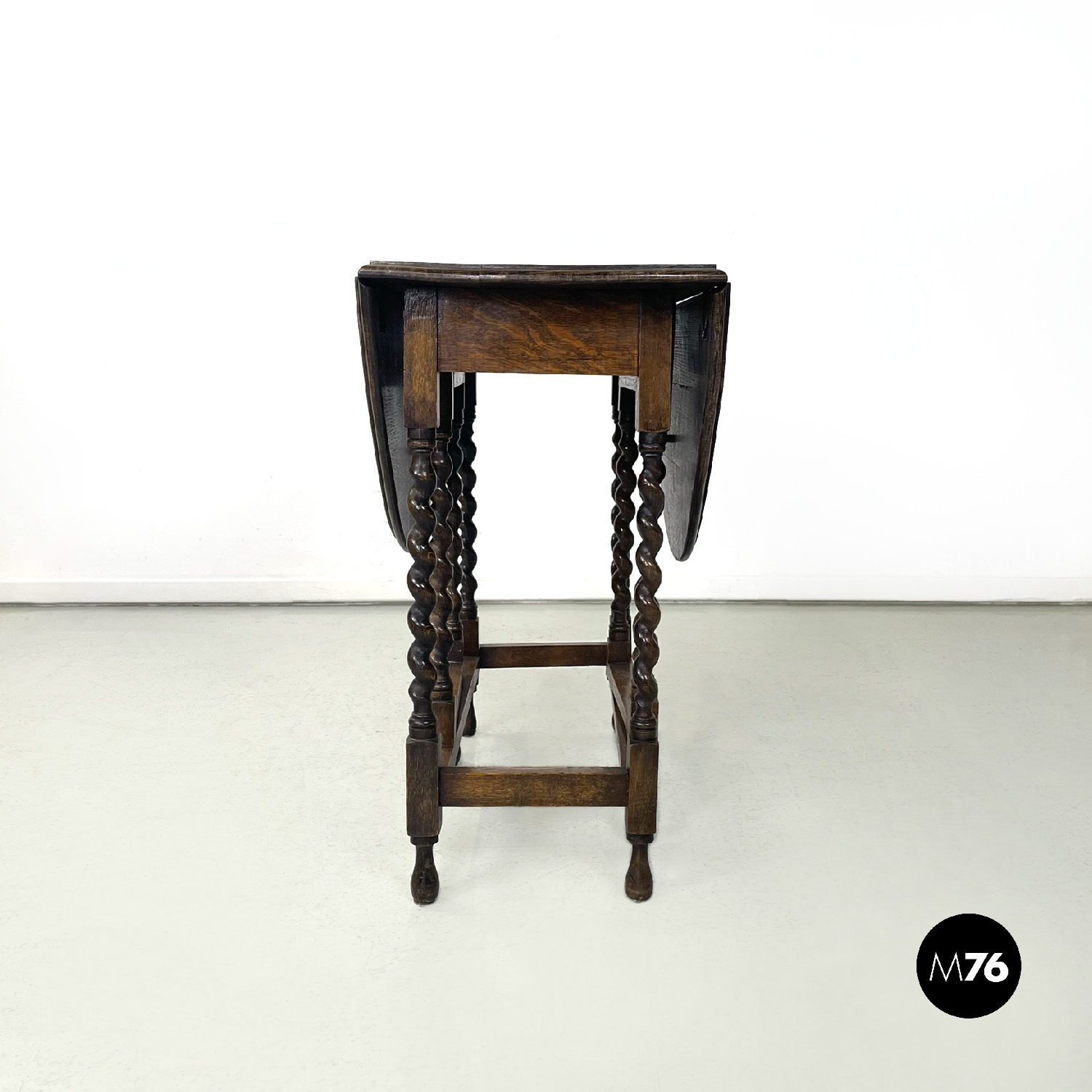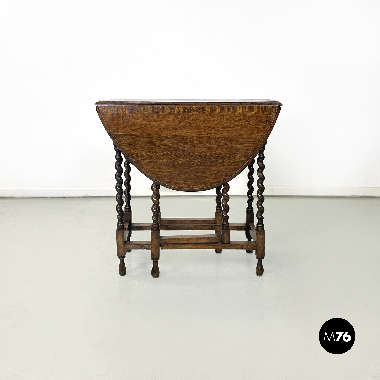 Tavolo da caffè o di servizio interamente in legno. Presenta un piano centrale rettangolare fisso a cui corrispondono due ante a ribalta laterali di forma a semicerchio così che una volta aperte entrambe il tavolo presenti un piano di forma ovale oppure se aperta una sola anta avrà un piano a ovale tagliato. Alla struttura centrale corrispondono quattro gambe fisse a torciglione ai lati si trovano due gambe mobili che fanno da appoggio alle ante a ribalta.