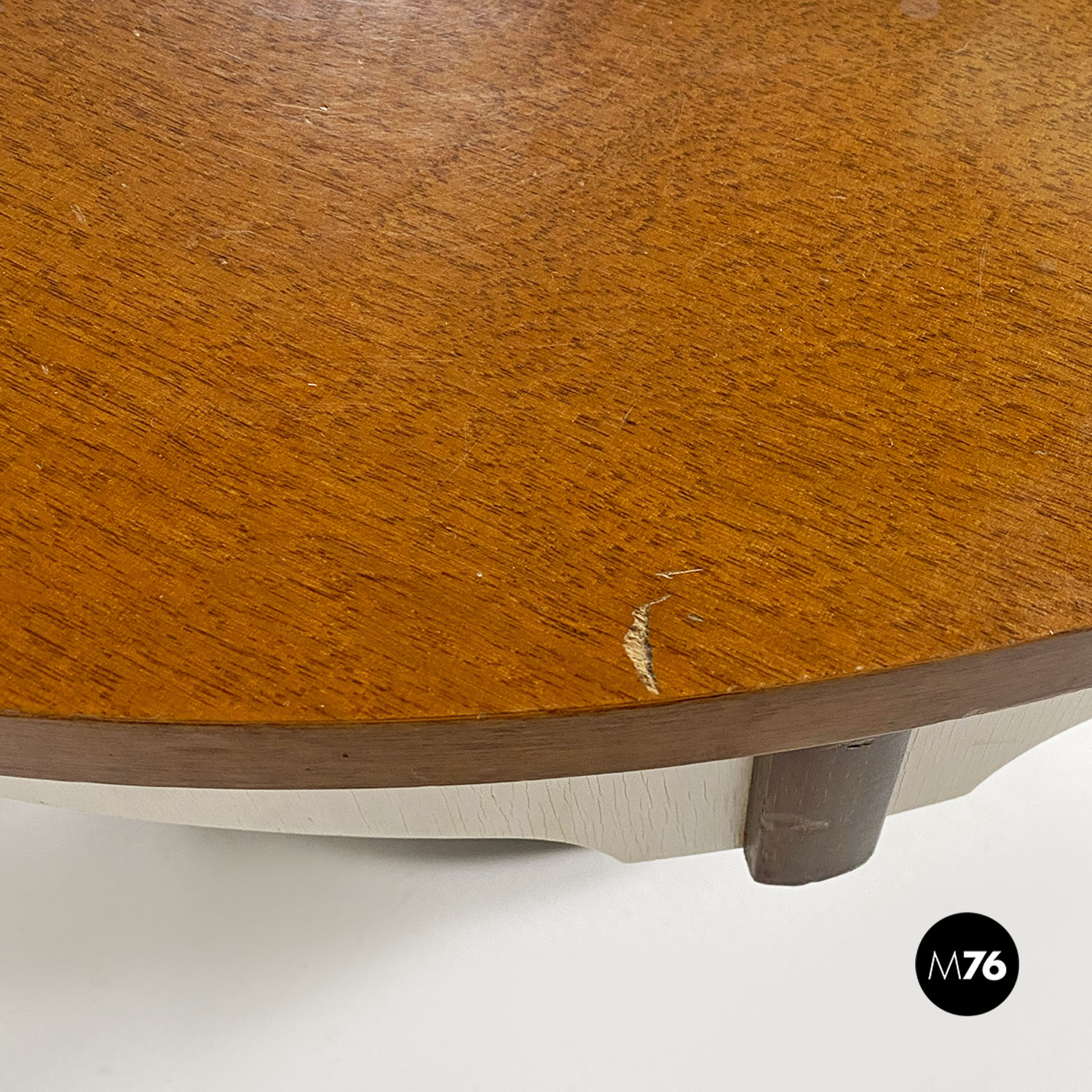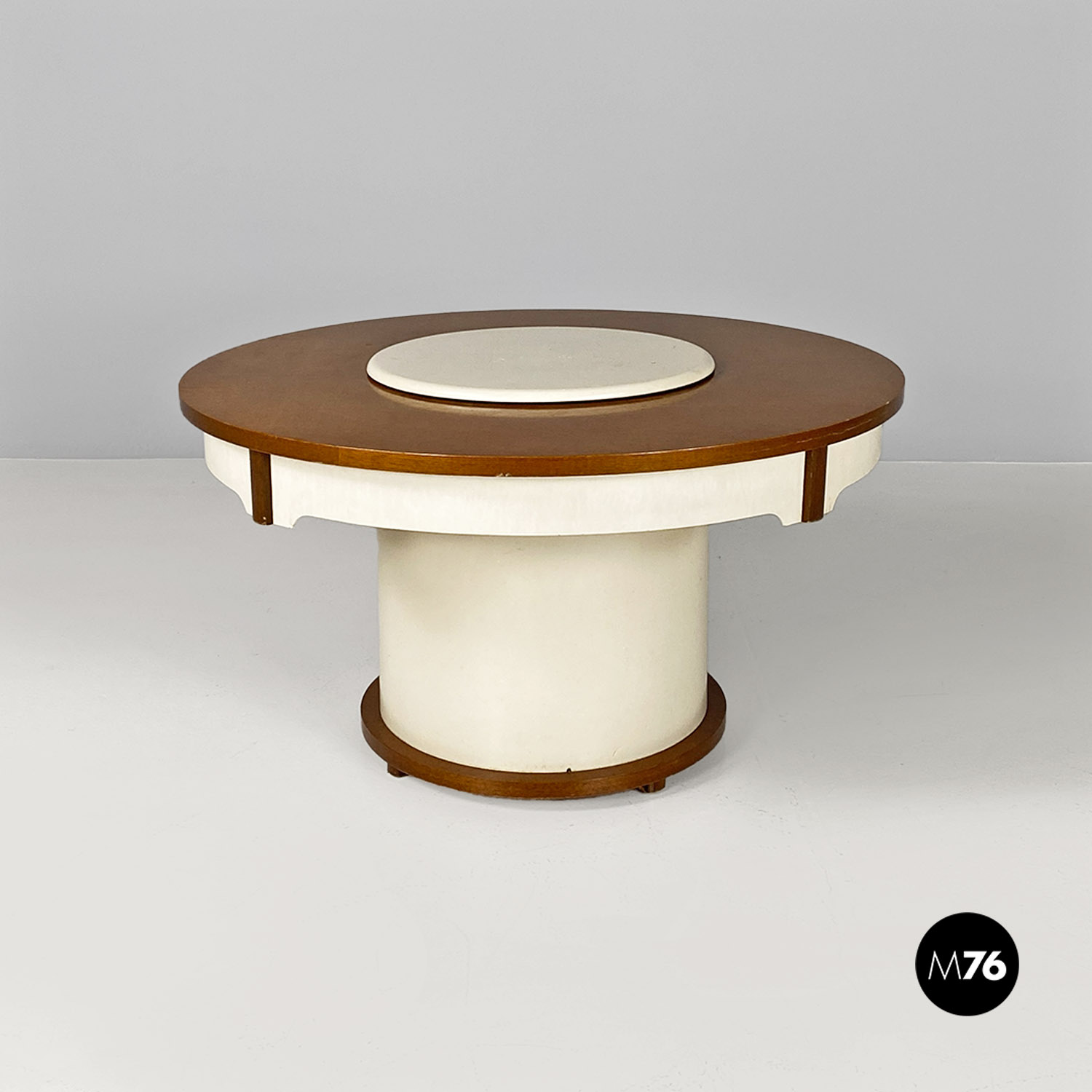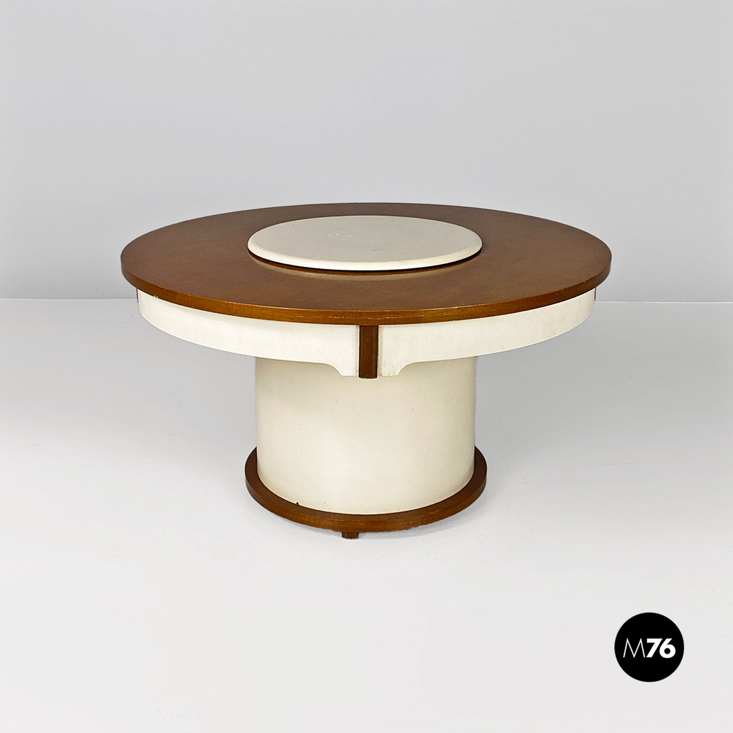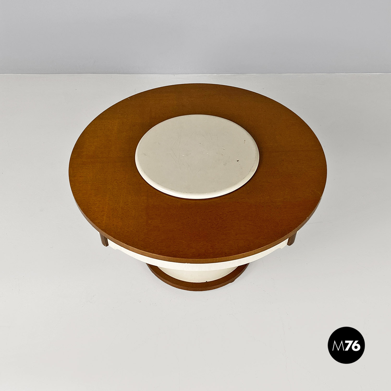 Tavolo da caffè noto anche come tavolo Gervasino con struttura in legno in colore naturale con parti verniciate in bianco. Il disco bianco posto al centro del piano nasconde un vano bar portabottiglie che viene su in automatico spostando una leva metallica posta sotto lo stesso piano.
