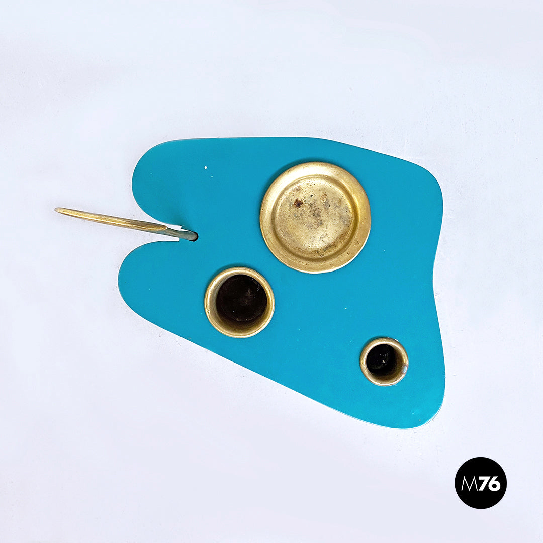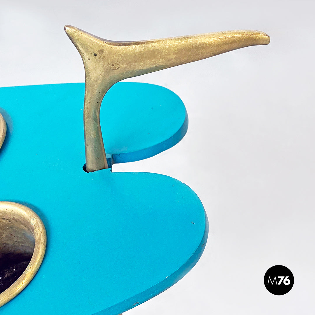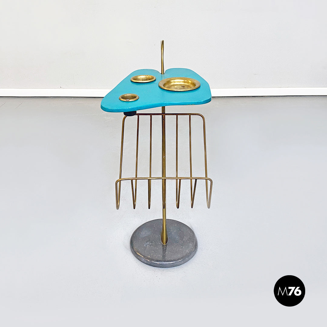 Tavolino con piano in metallo verniciato ottanio in colorazione originale e di forma irregolare tris di posaceneri in ottone con alloggio nello stesso piano e portariviste nella parte inferiore. Struttura centrale composta da un unica fusione di ottone curvato con dettaglio finale a punta sulla maniglia e base in marmo.
