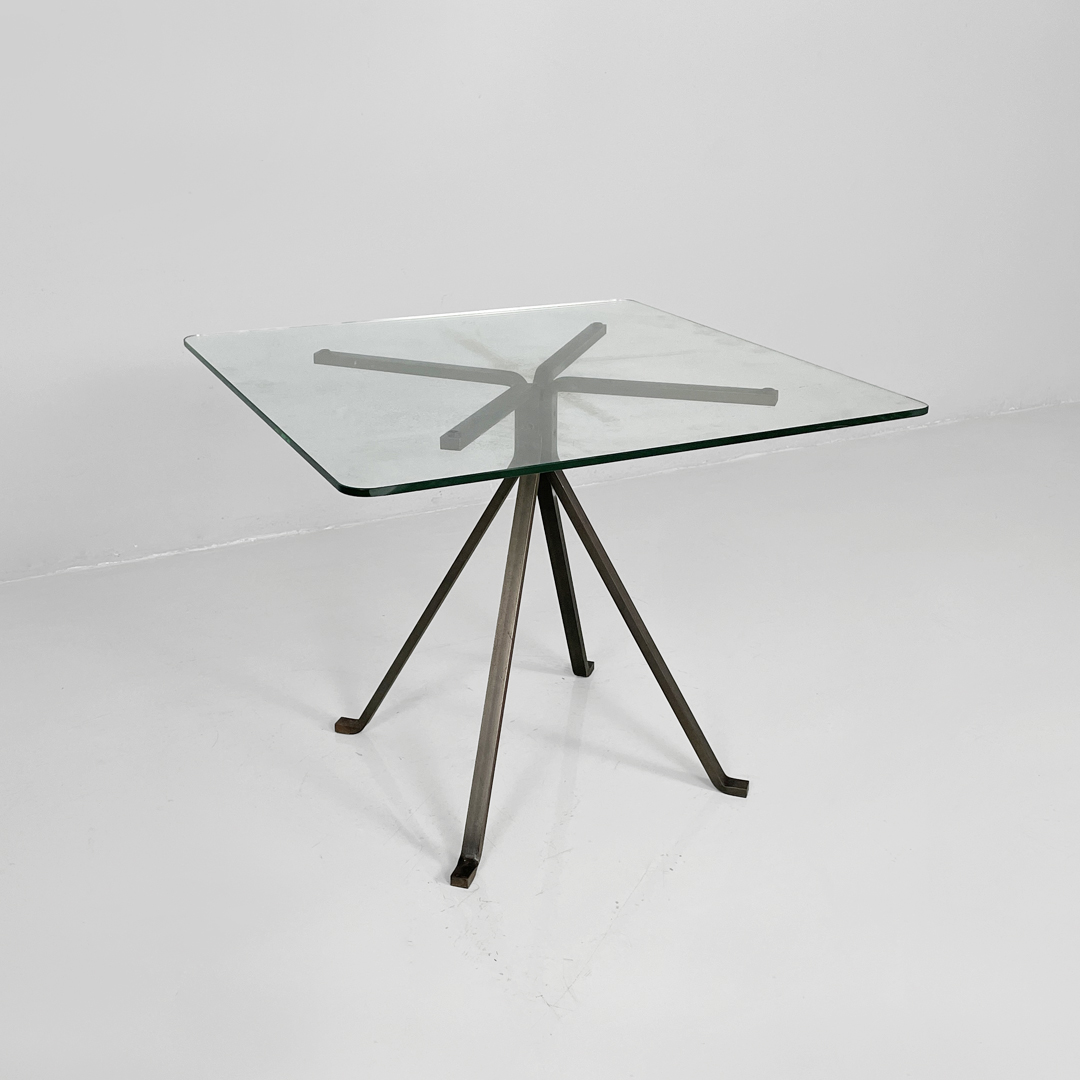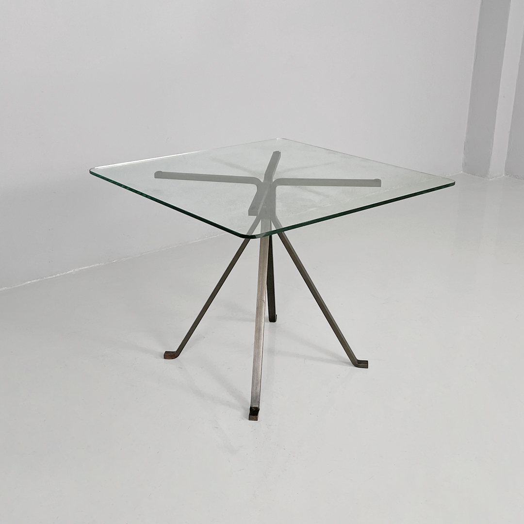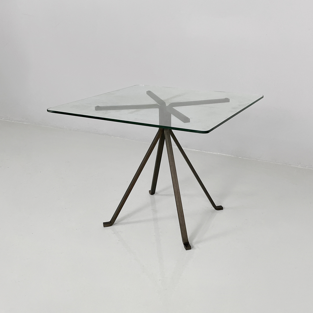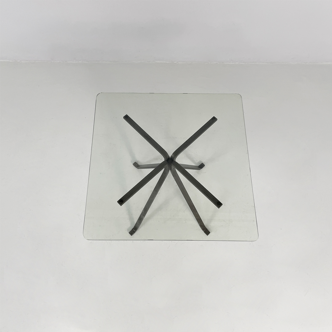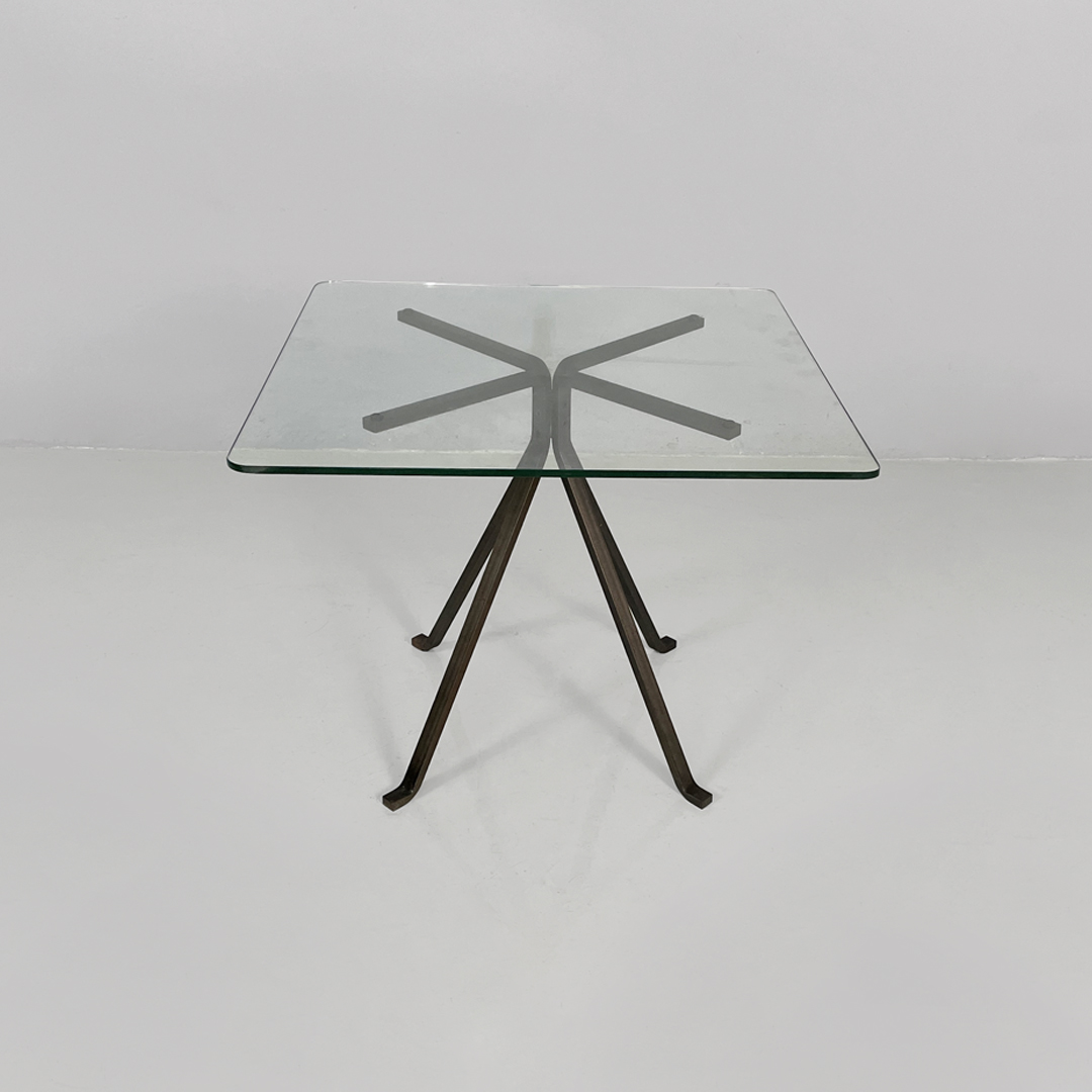 Tavolo da caffè modello Cuginetto con piano quadrato in vetro di grosso spessore con angoli stondati. La base è composta da quattro razze in ghisa a sezione rettangolare, con le parti terminali delle gambe piegate.