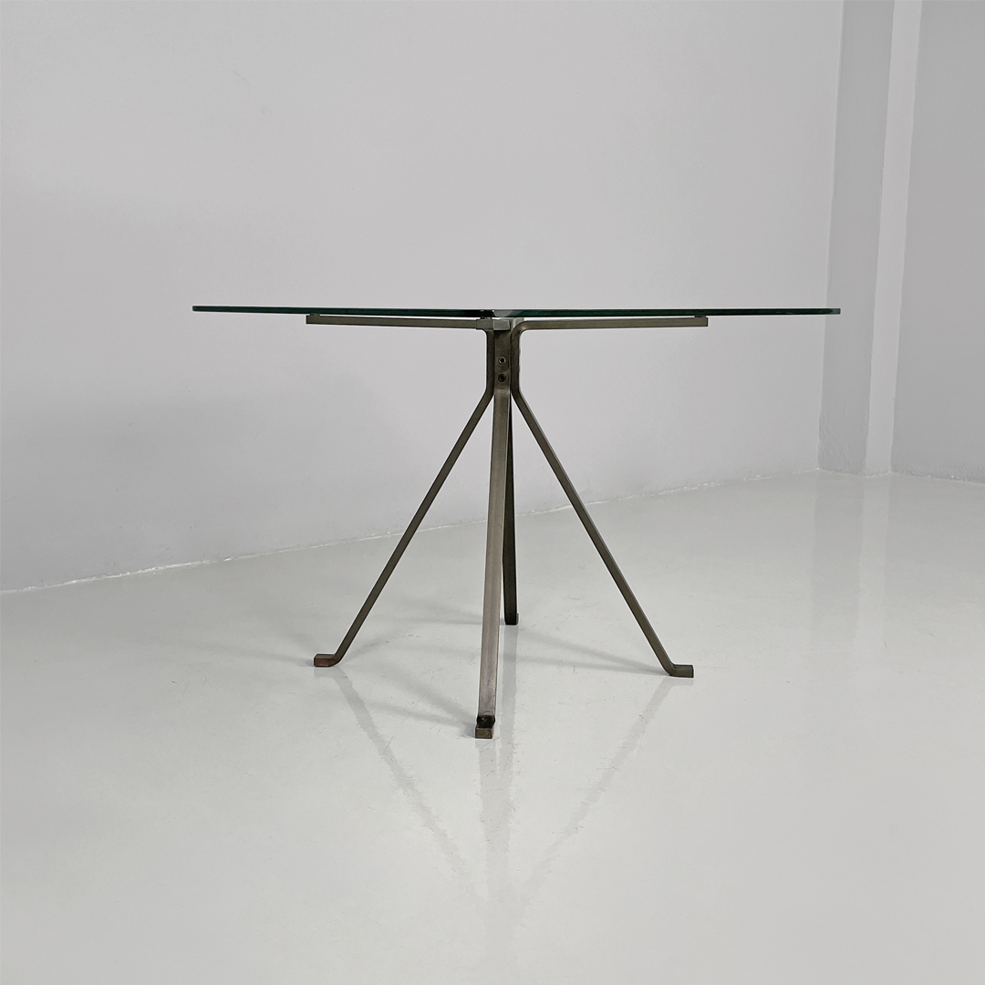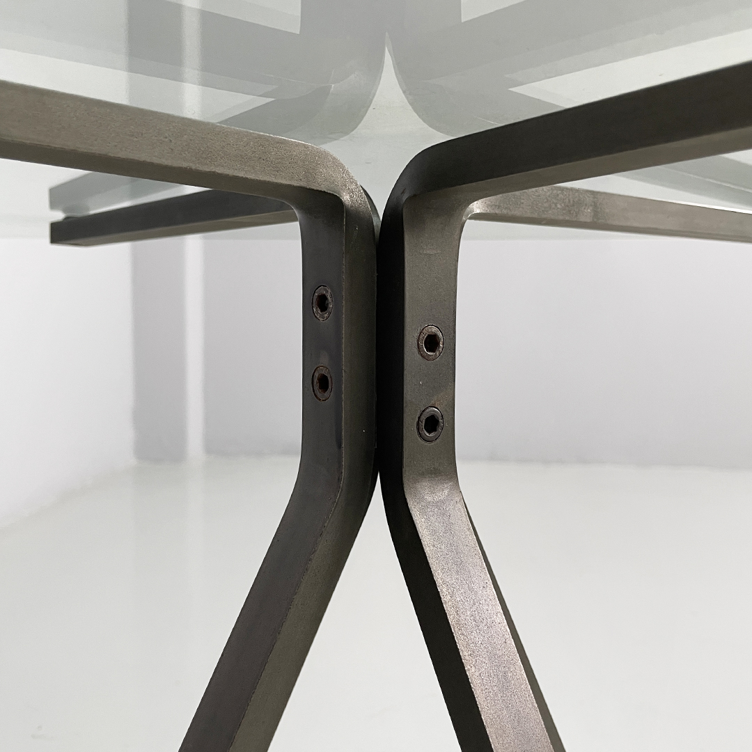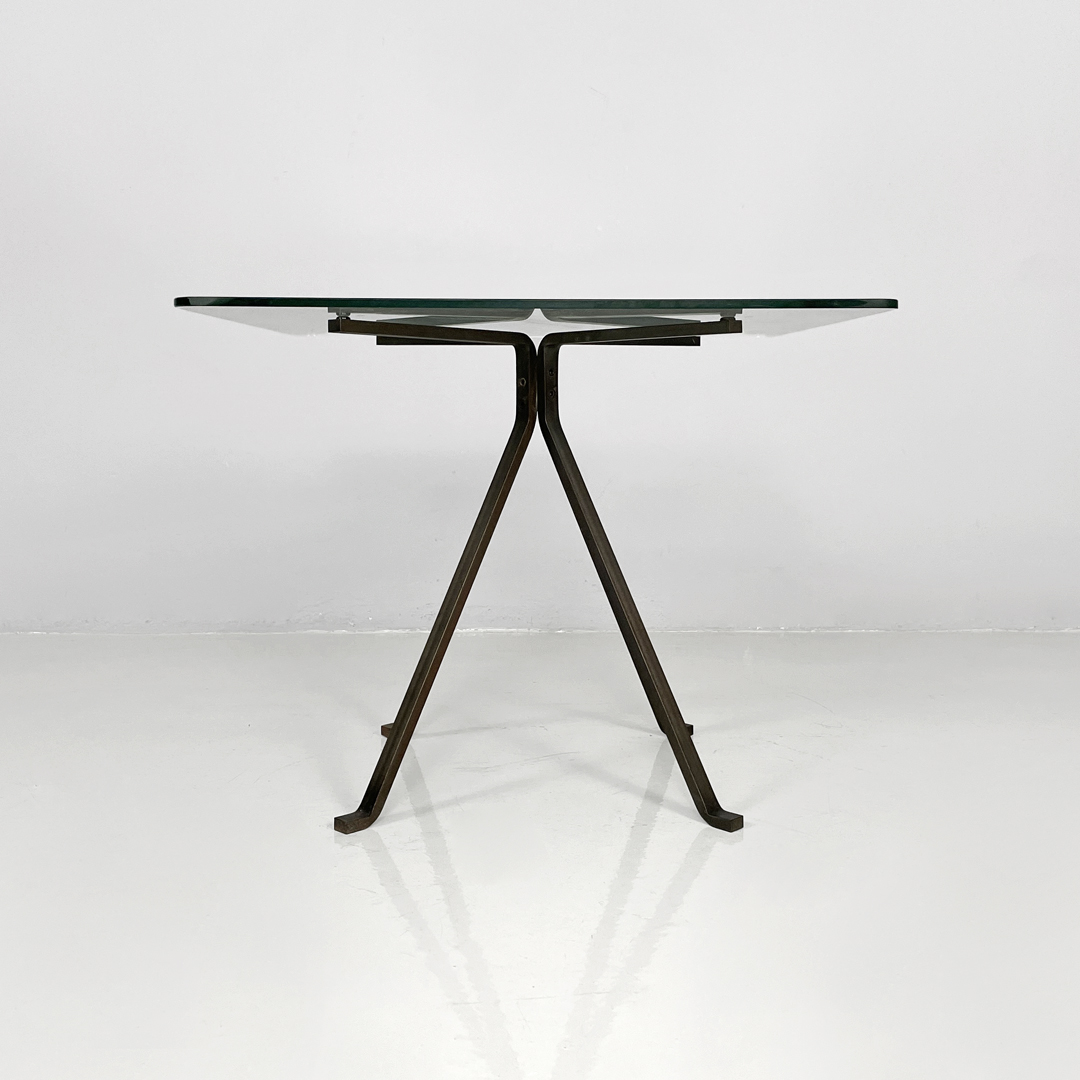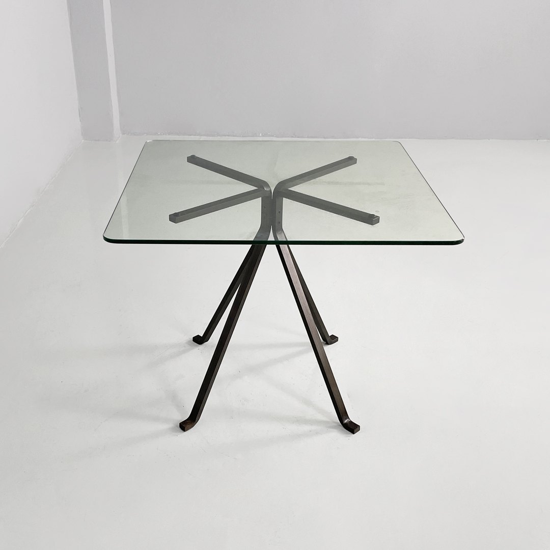 Tavolo da caffè modello Cuginetto con piano quadrato in vetro di grosso spessore con angoli stondati. La base è composta da quattro razze in ghisa a sezione rettangolare, con le parti terminali delle gambe piegate.