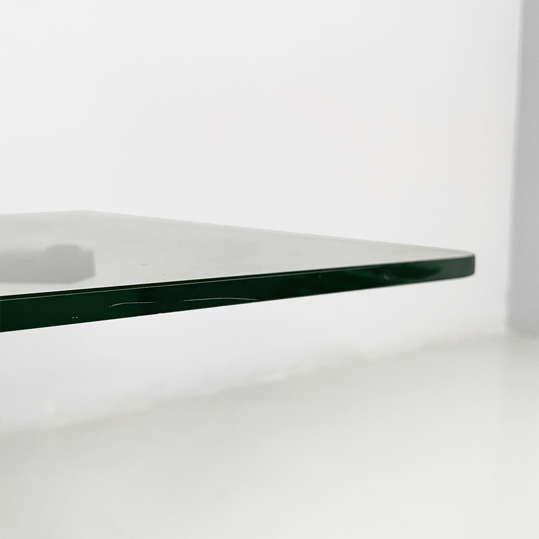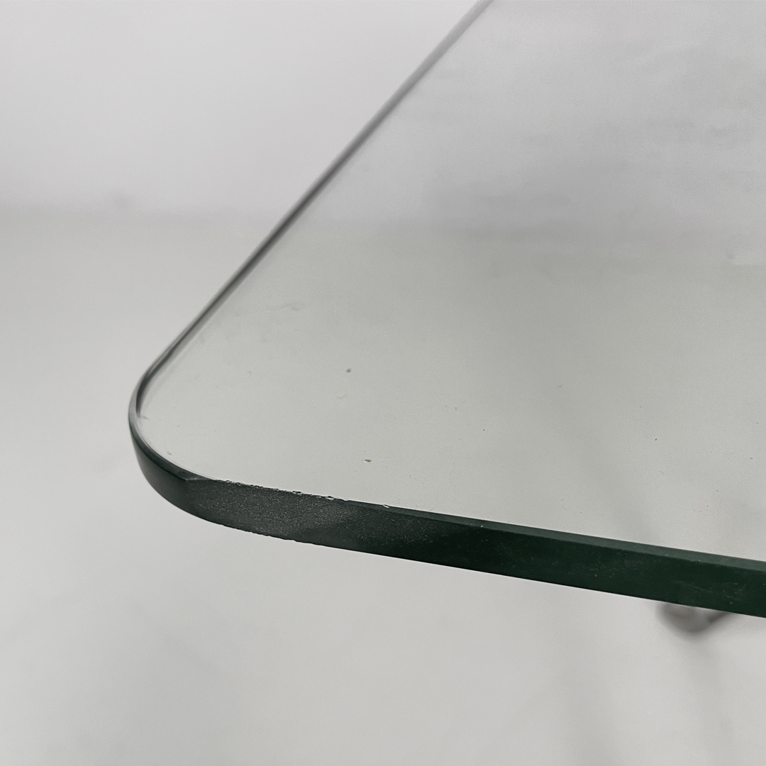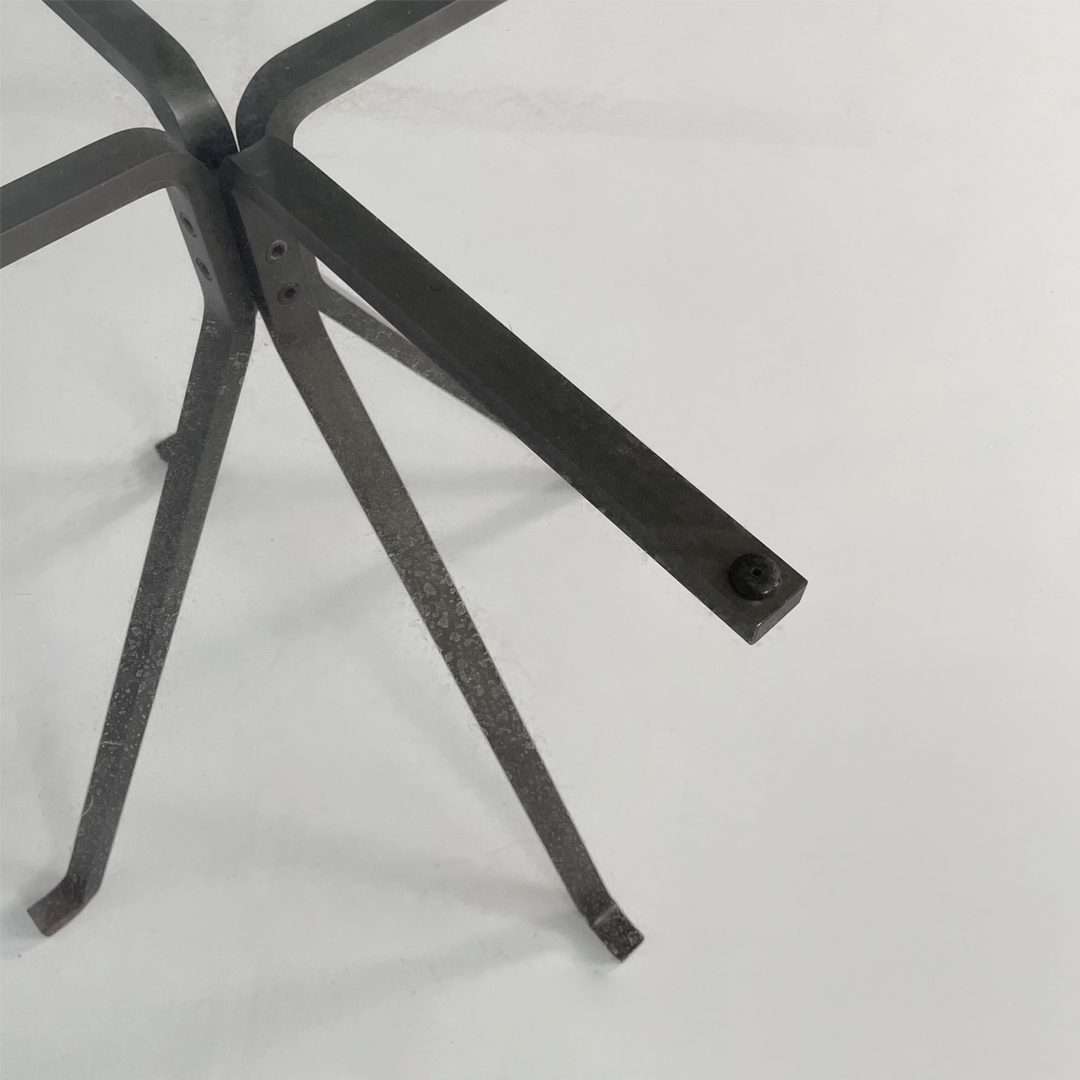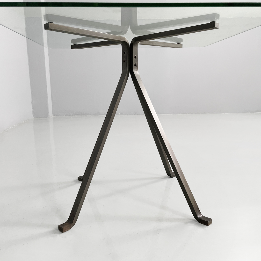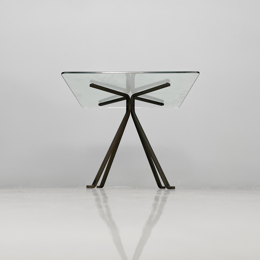 Tavolo da caffè modello Cuginetto con piano quadrato in vetro di grosso spessore con angoli stondati. La base è composta da quattro razze in ghisa a sezione rettangolare, con le parti terminali delle gambe piegate.