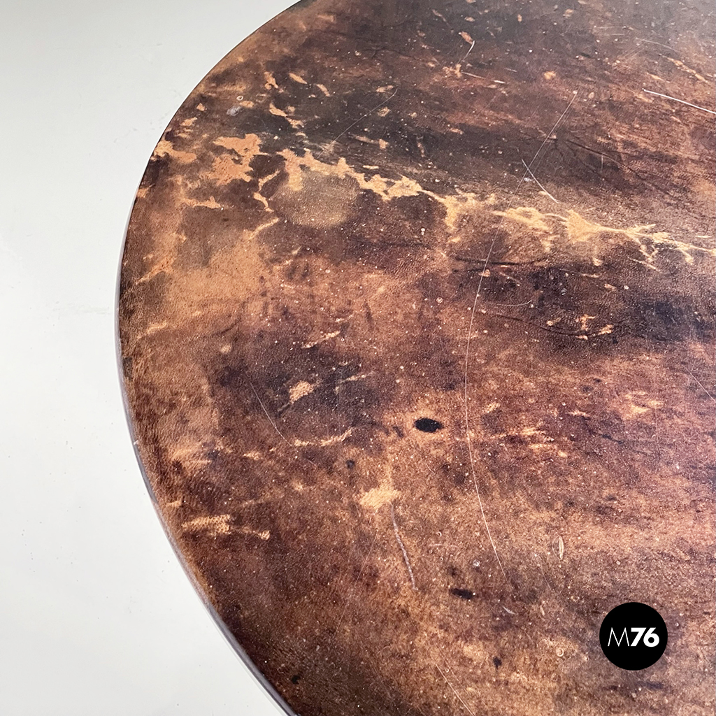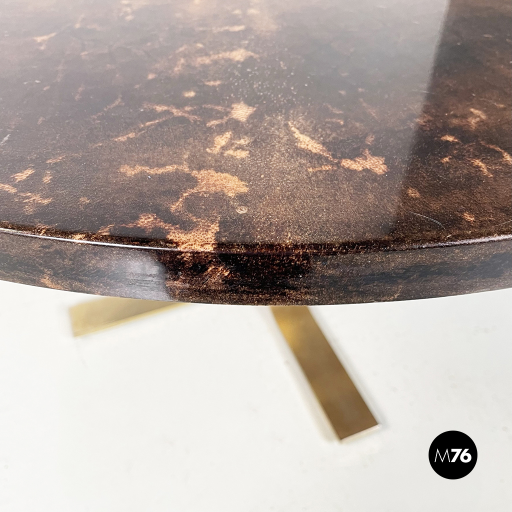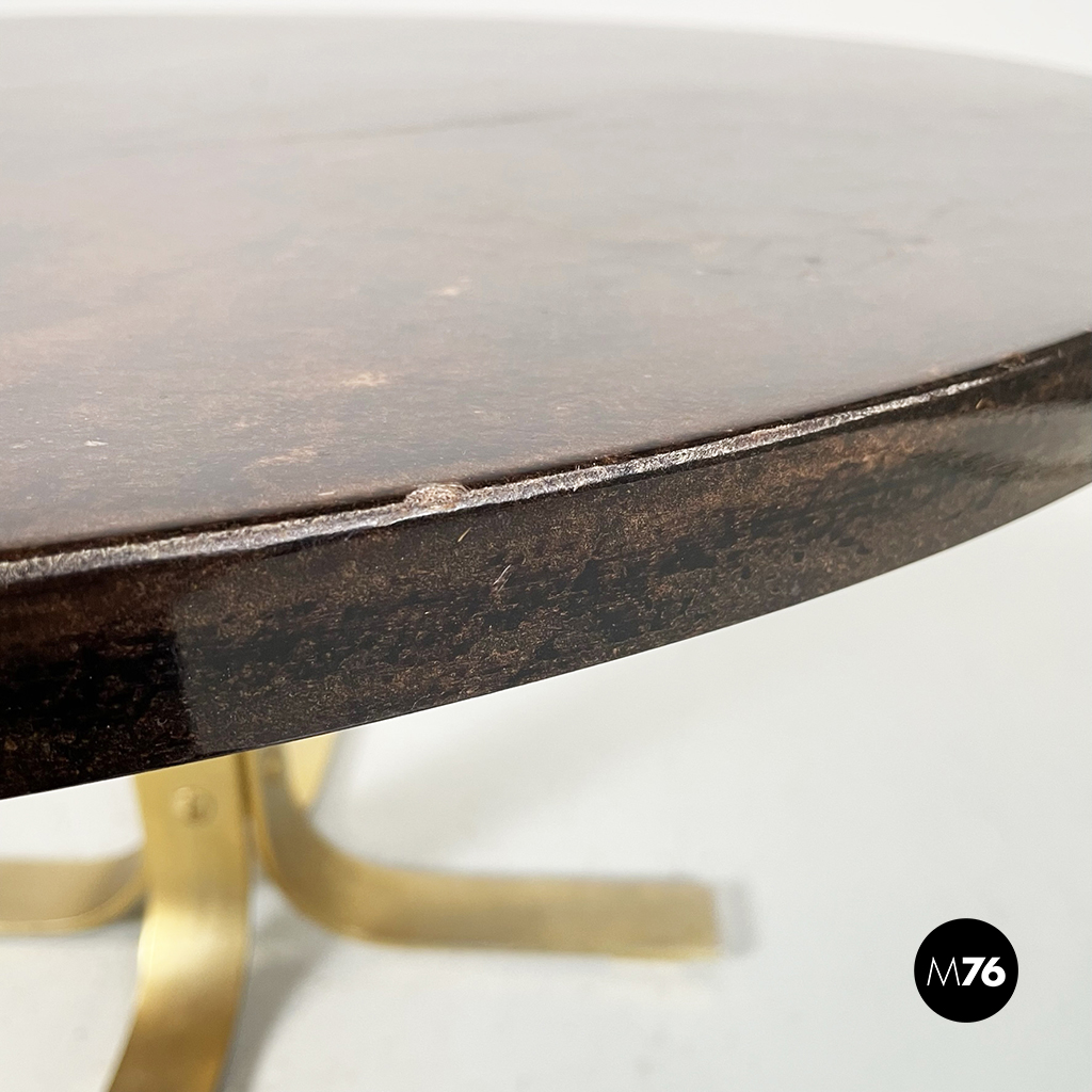 Tavolo da caffè con piano tondo in legno rivestito in pergamena con finitura in marrone scuro. La zampa a quattro razze è in ottone.