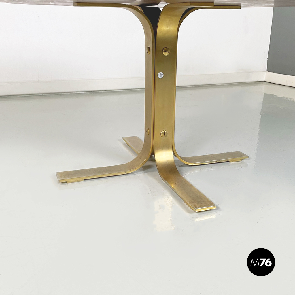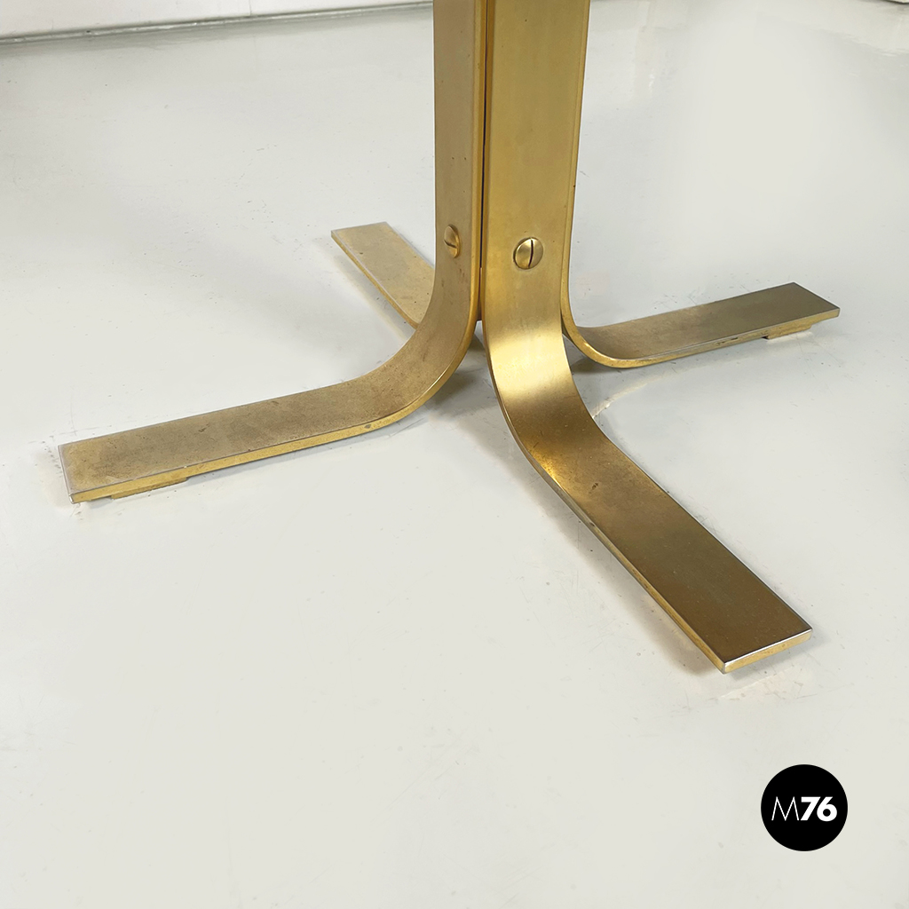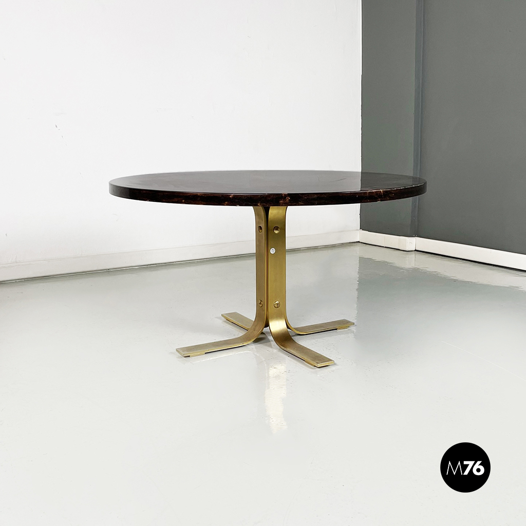 Tavolo da caffè con piano tondo in legno rivestito in pergamena con finitura in marrone scuro. La zampa a quattro razze è in ottone.