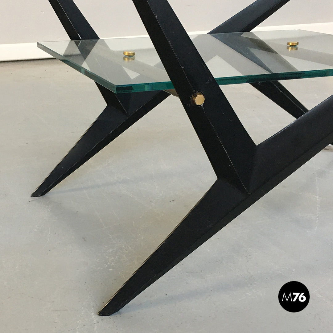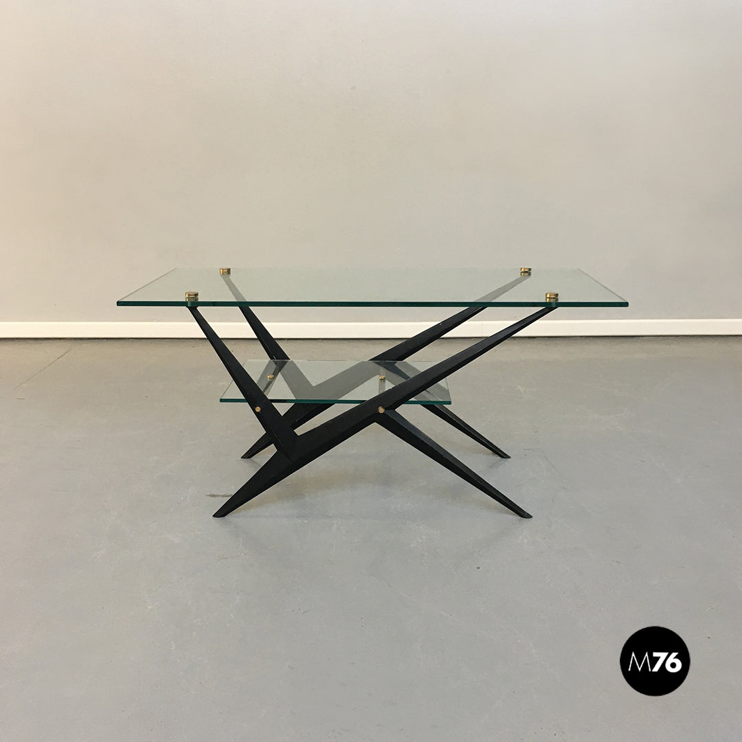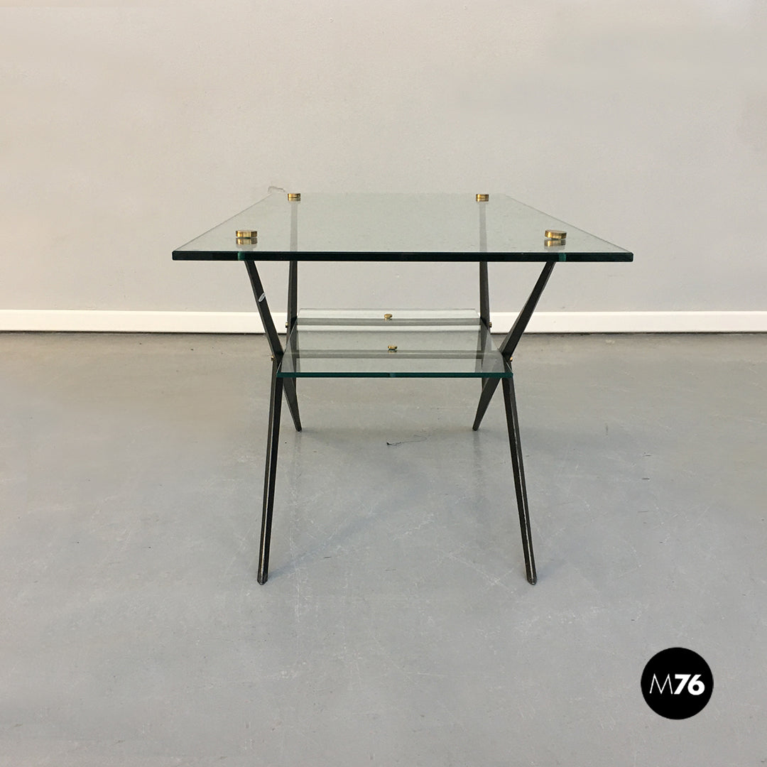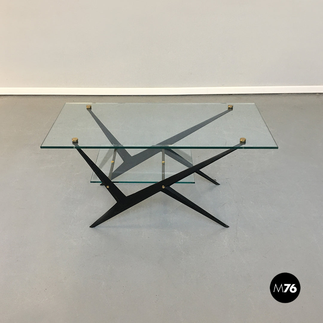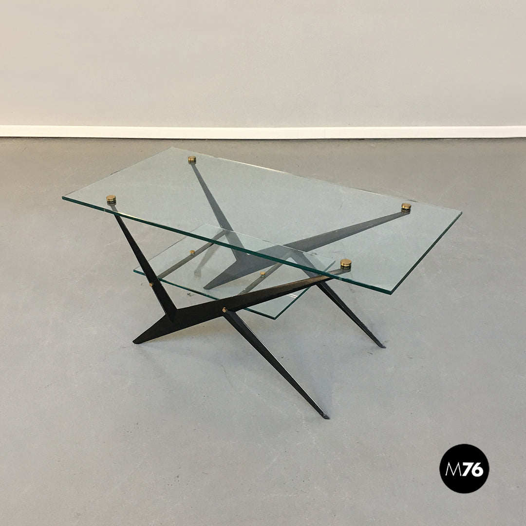 Tavolo da caffè con struttura in ferro a sezione romboidale che regge due cristalli rettangolari trasparenti.