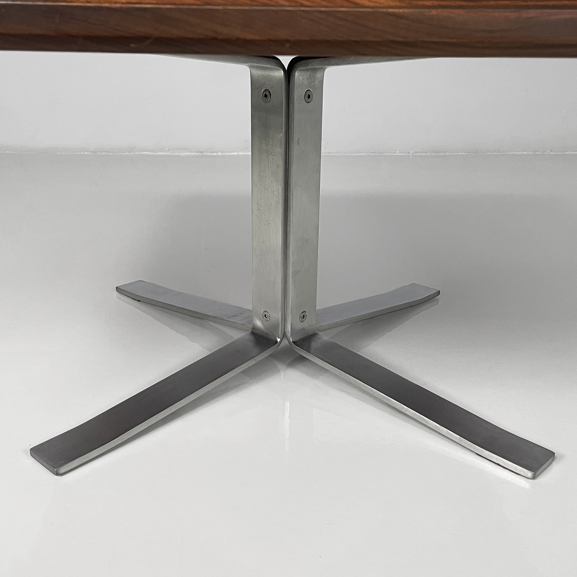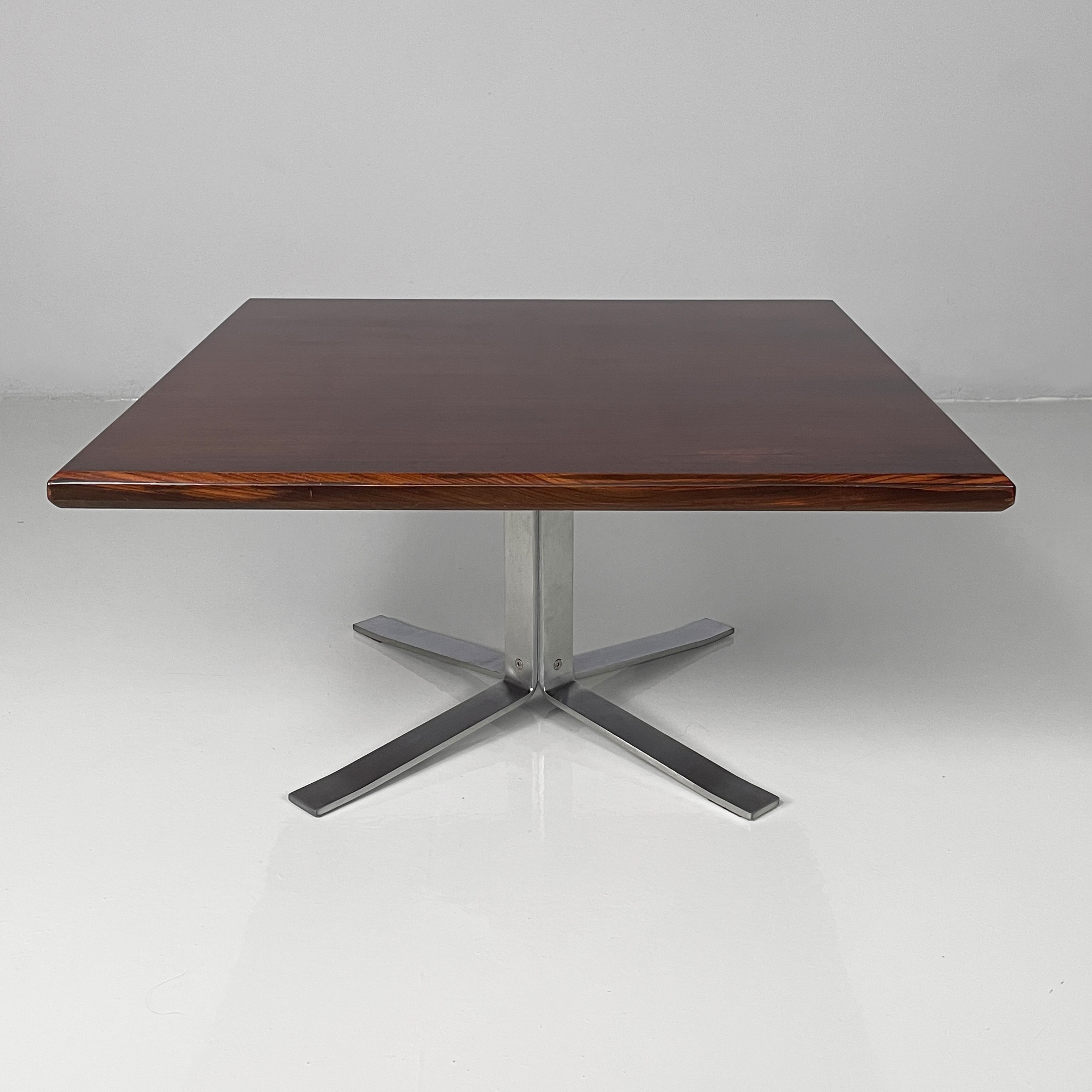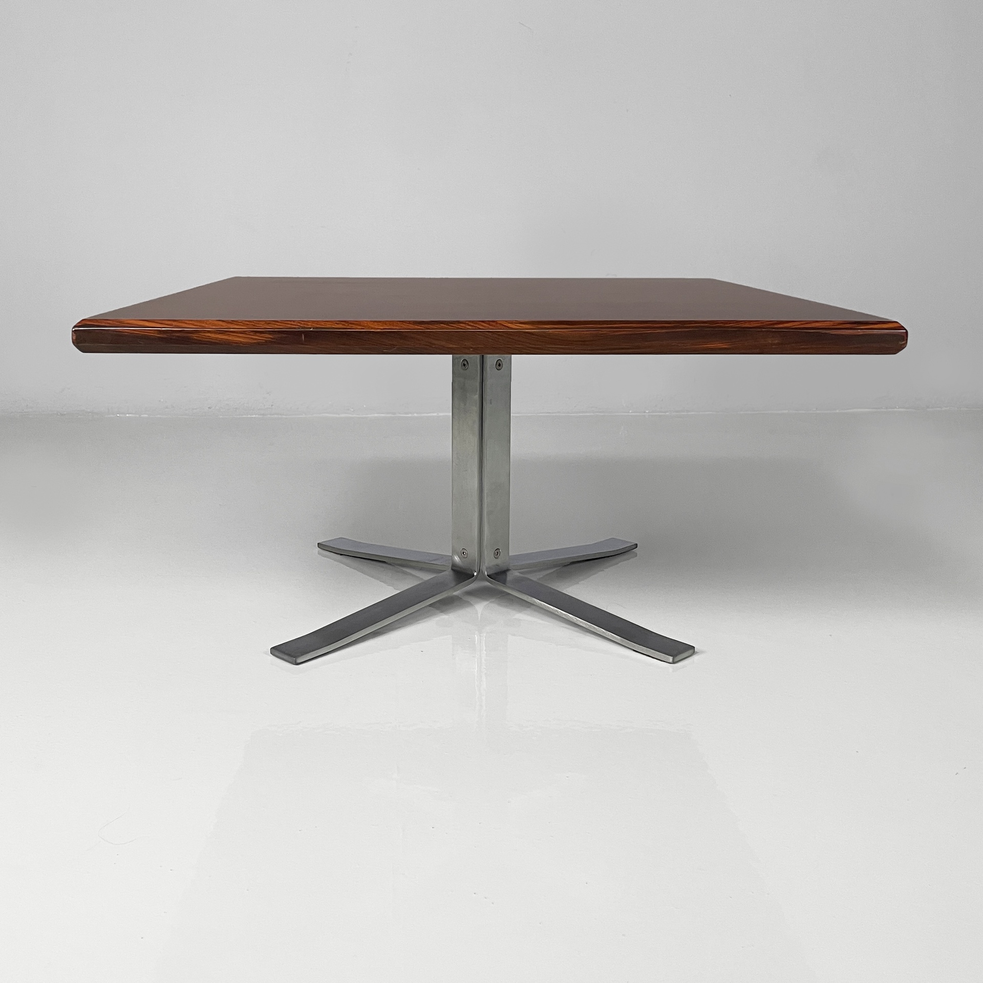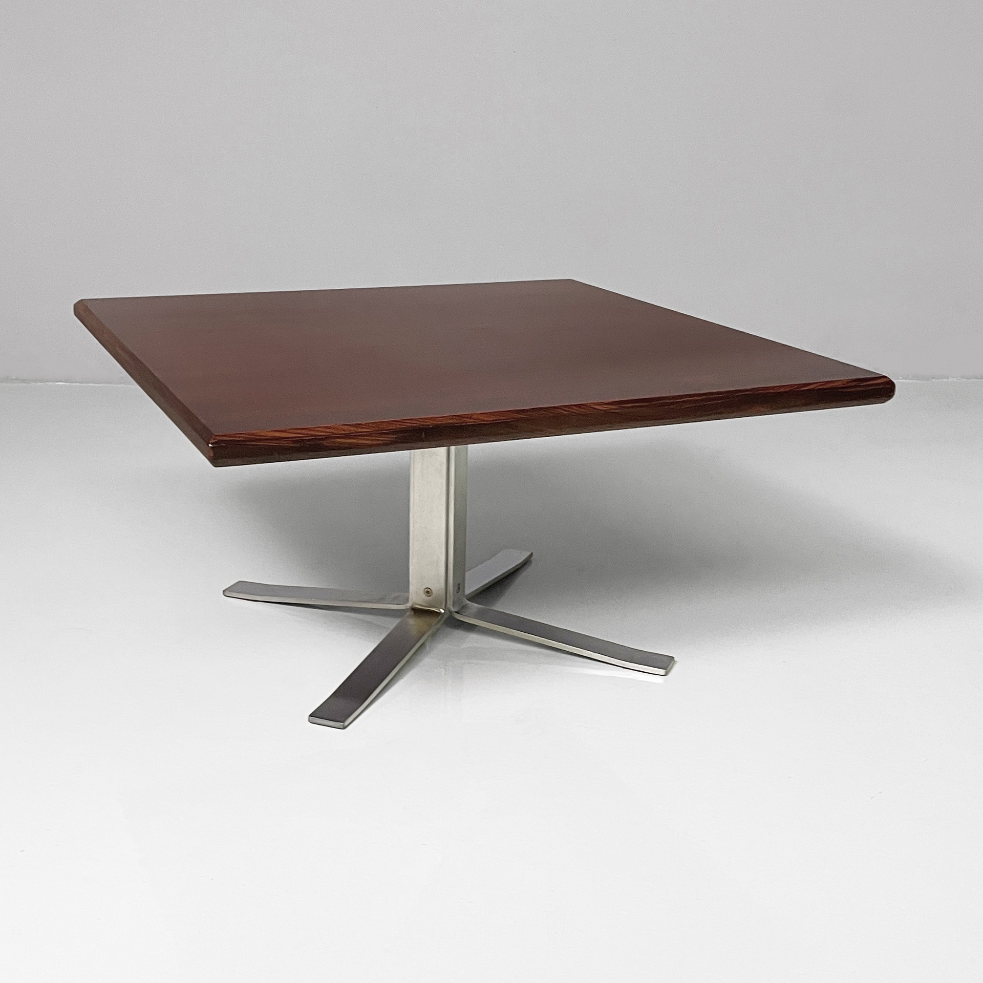 Tavolo da caffè con piano quadrato in legno. La base è a quattro razze in acciaio.