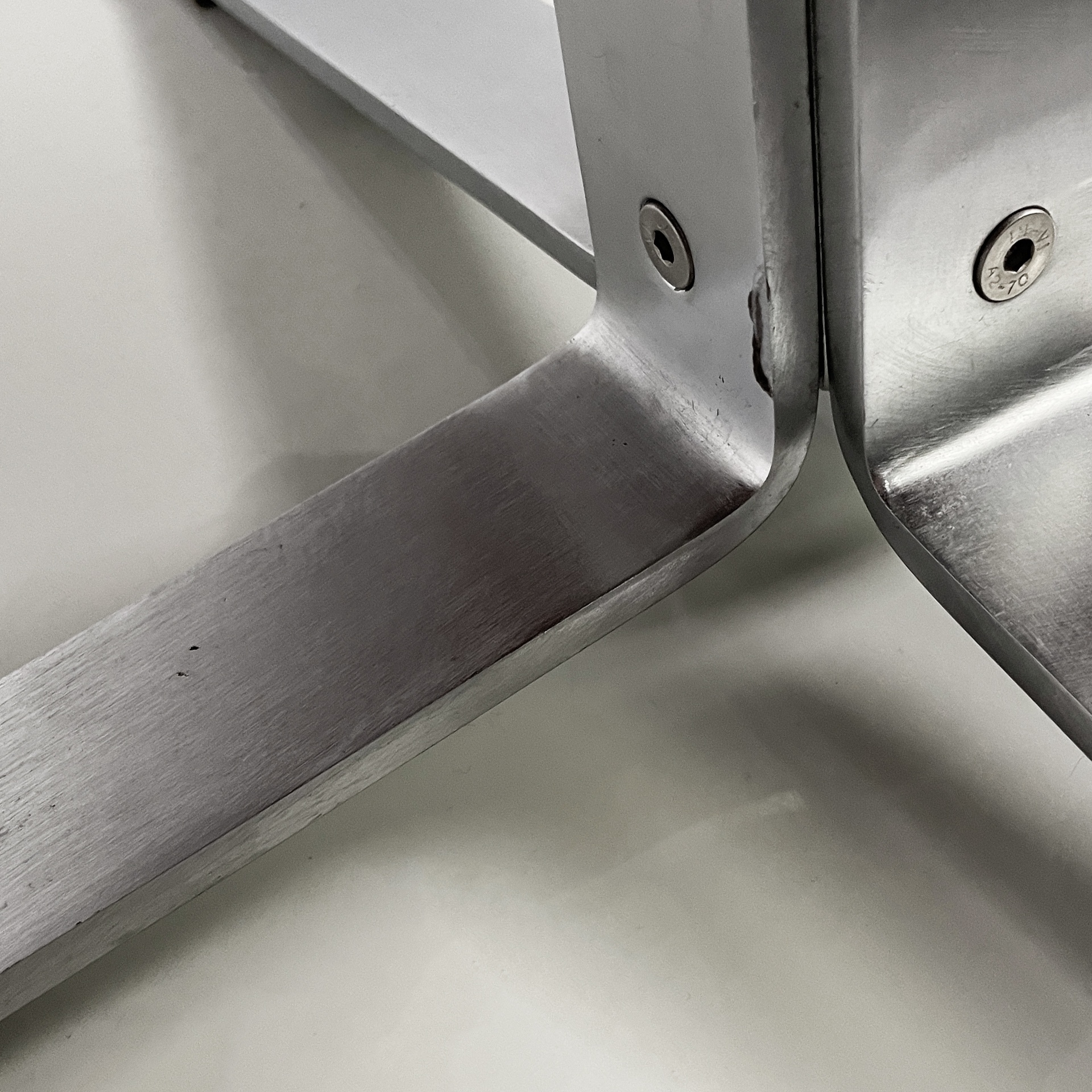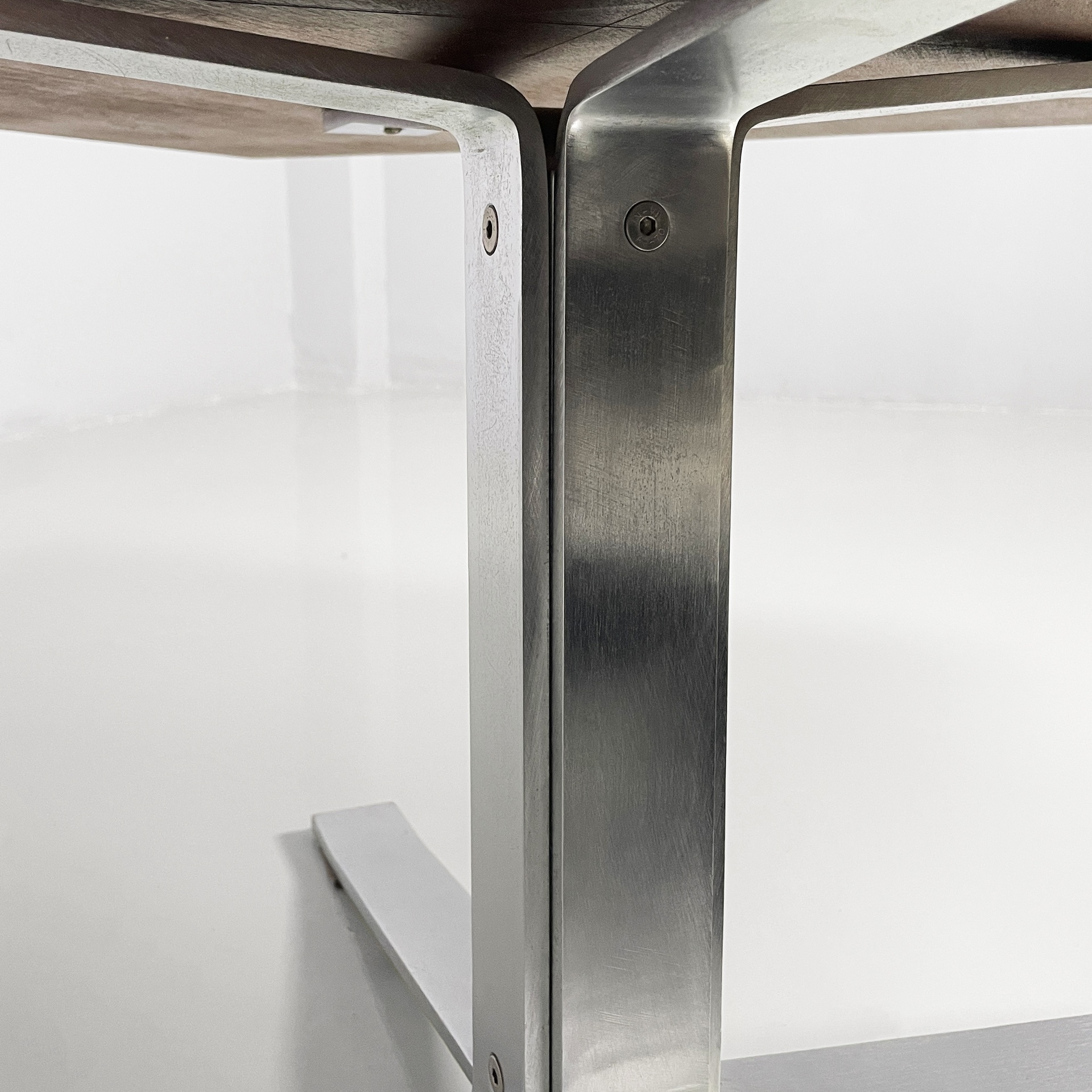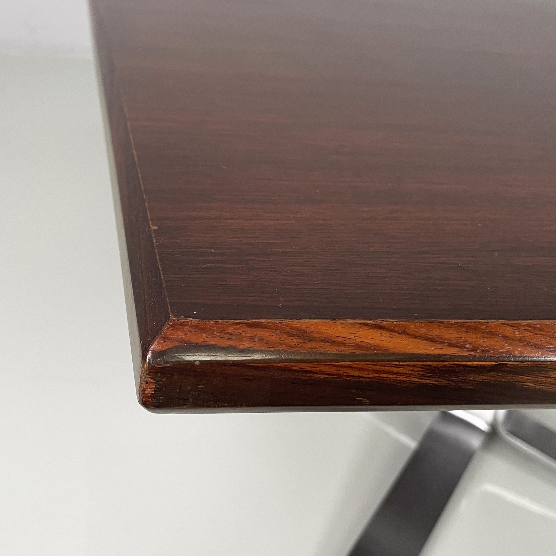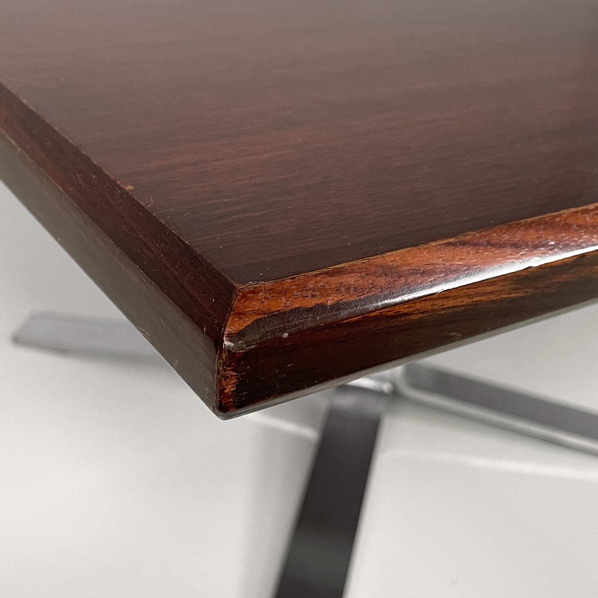 Tavolo da caffè con piano quadrato in legno. La base è a quattro razze in acciaio.