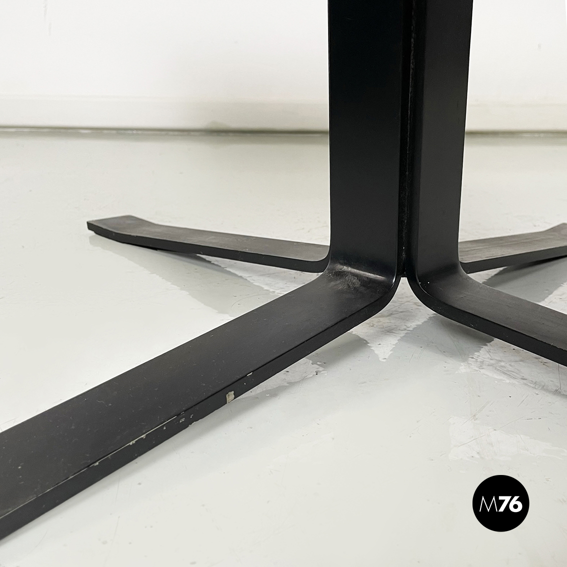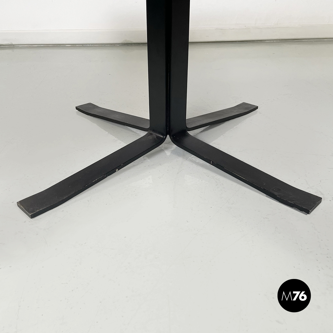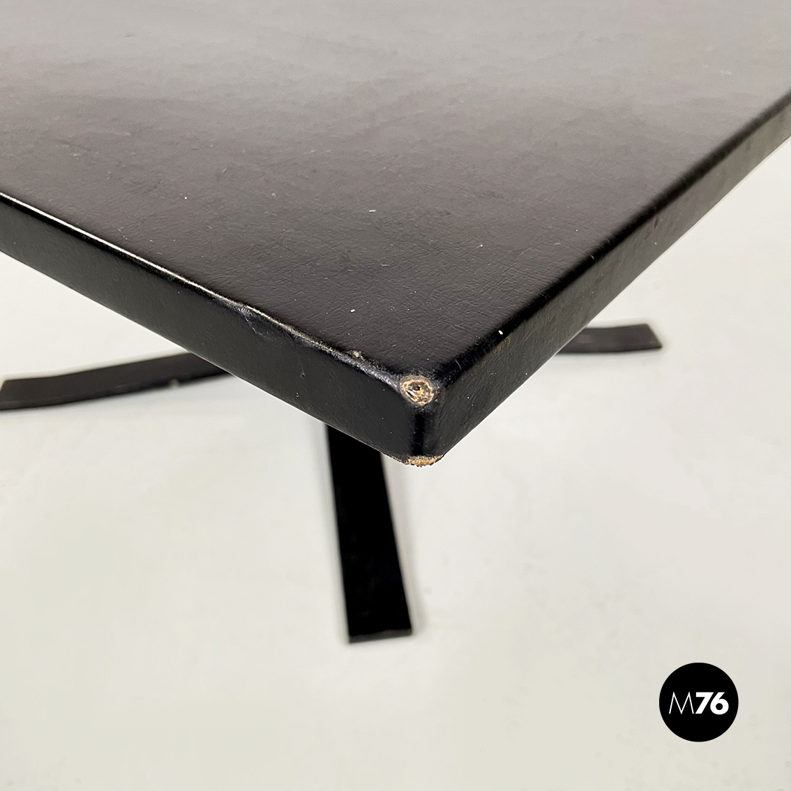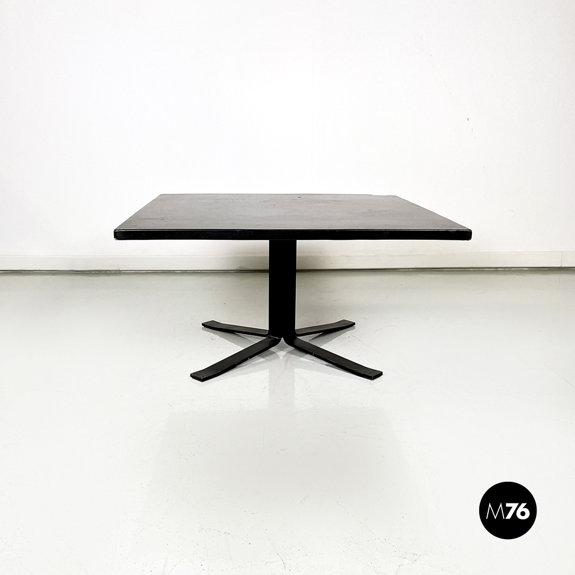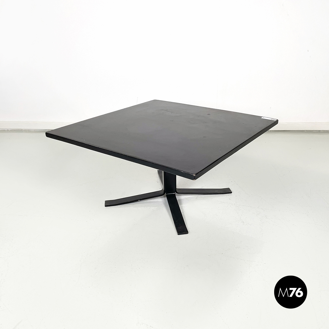 Tavolo da caffè con piano quadrato in legno rivestito in sky nero. Struttura centrale in ferro verniciato nero. Base a quattro razze in ferro verniciato nero.