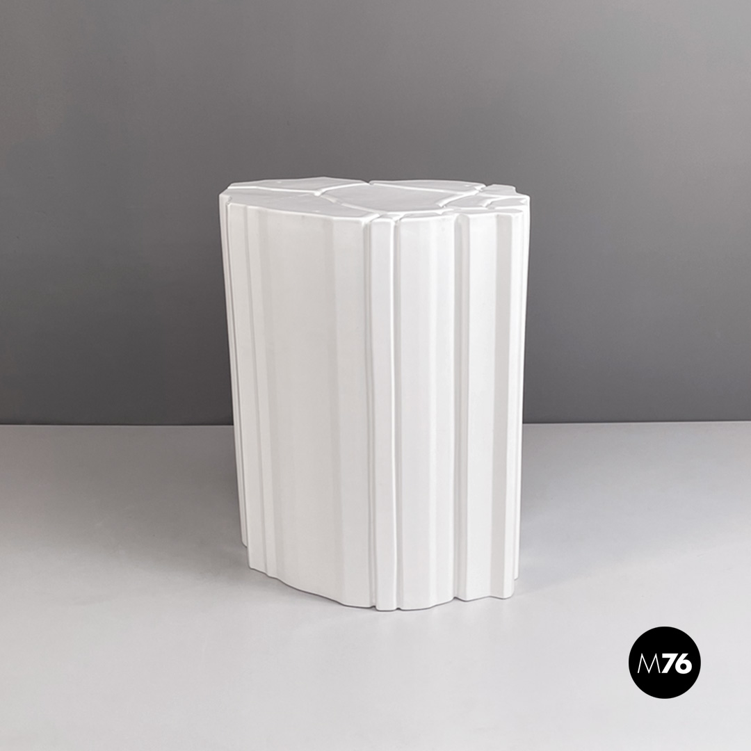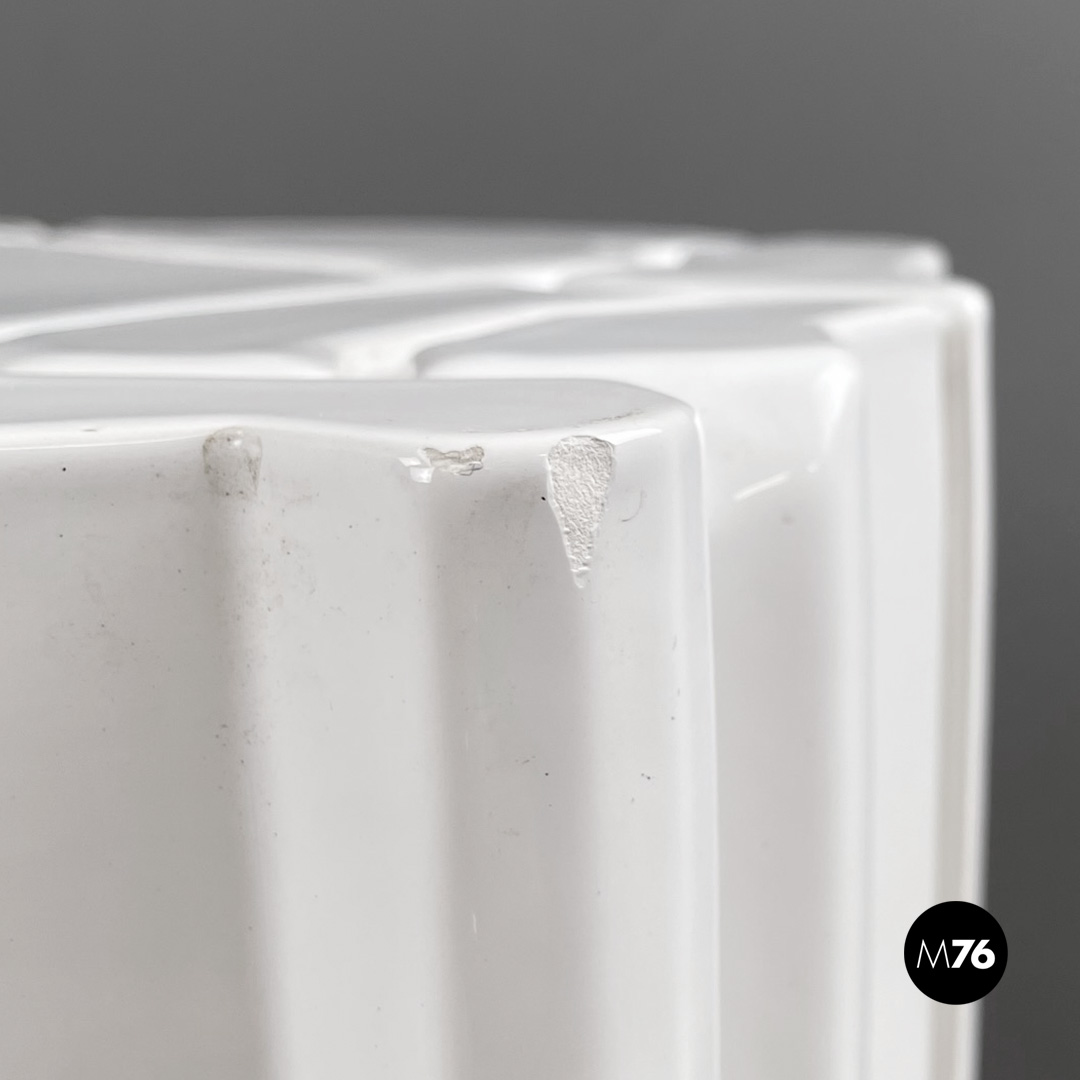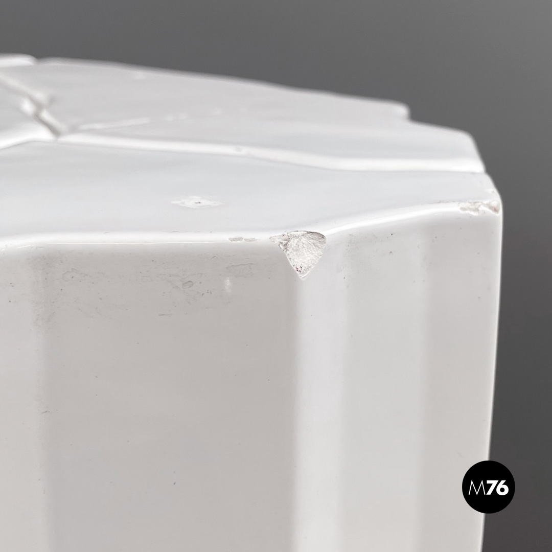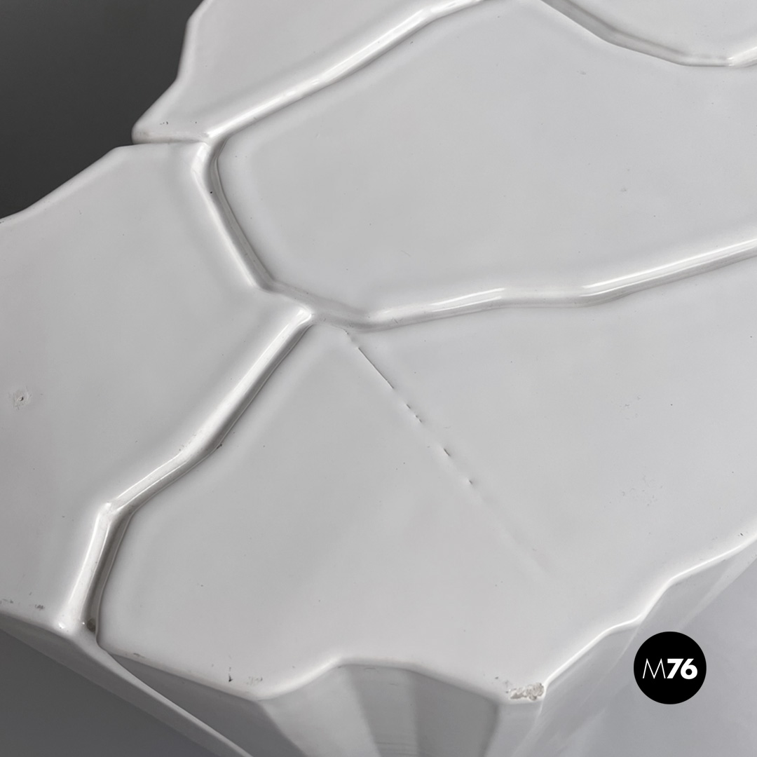 Tavolo da caffè geometrico in ceramica con finitura in vernice bianca lucida. Il piano presenta una decorazione geometrica in basso rilievo che prosegue sui lati rendendoli irregolari. Adatto ad uso esterno come in giardino.