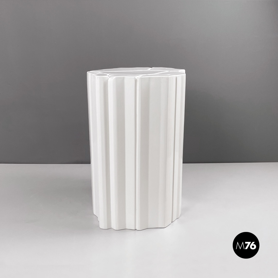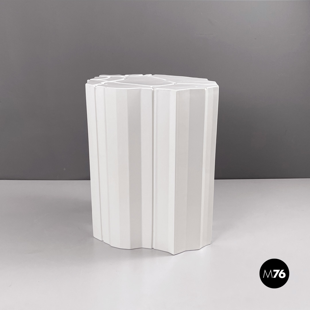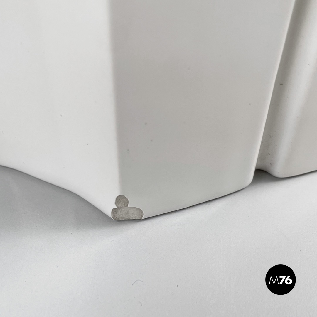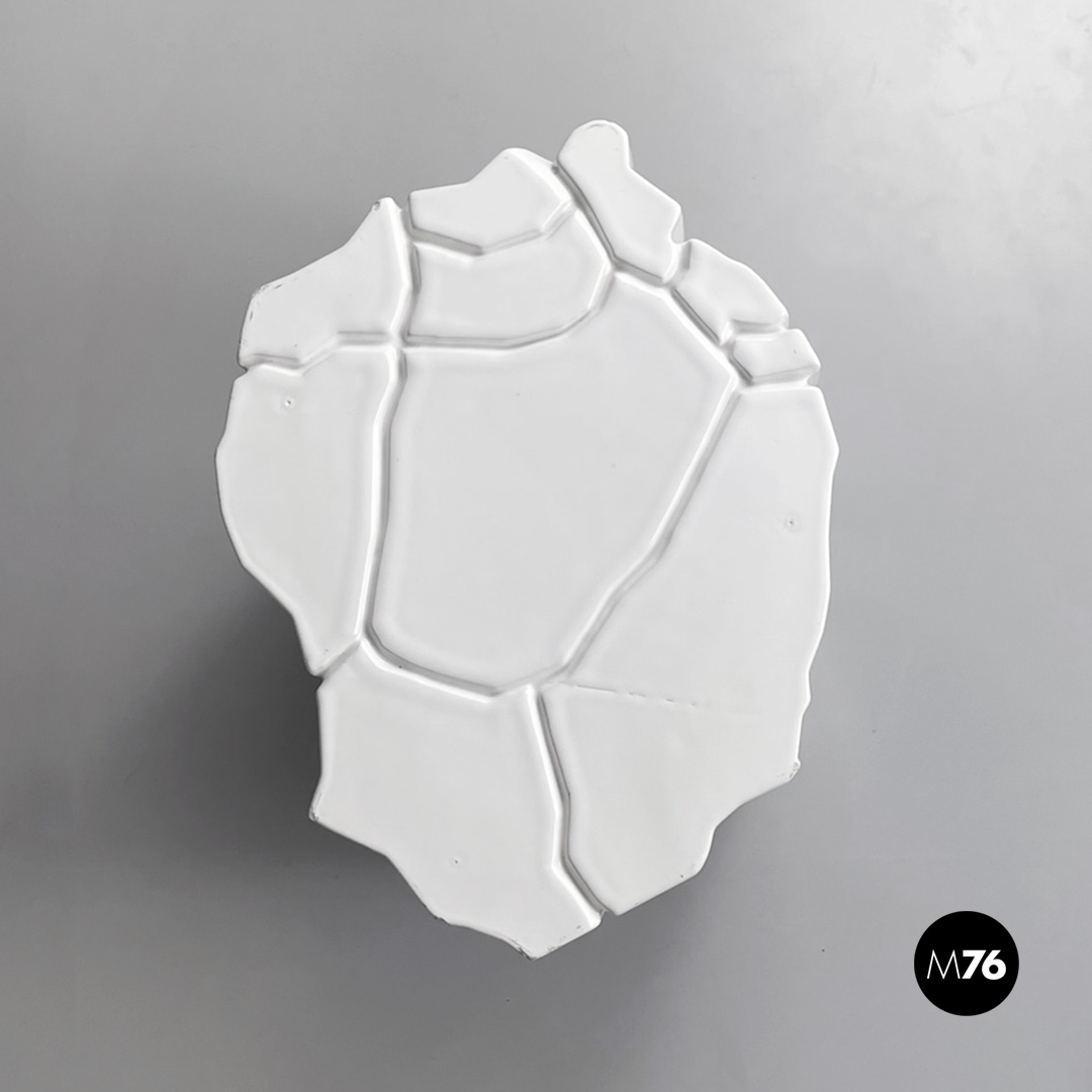 Tavolo da caffè geometrico in ceramica con finitura in vernice bianca lucida. Il piano presenta una decorazione geometrica in basso rilievo che prosegue sui lati rendendoli irregolari. Adatto ad uso esterno come in giardino.