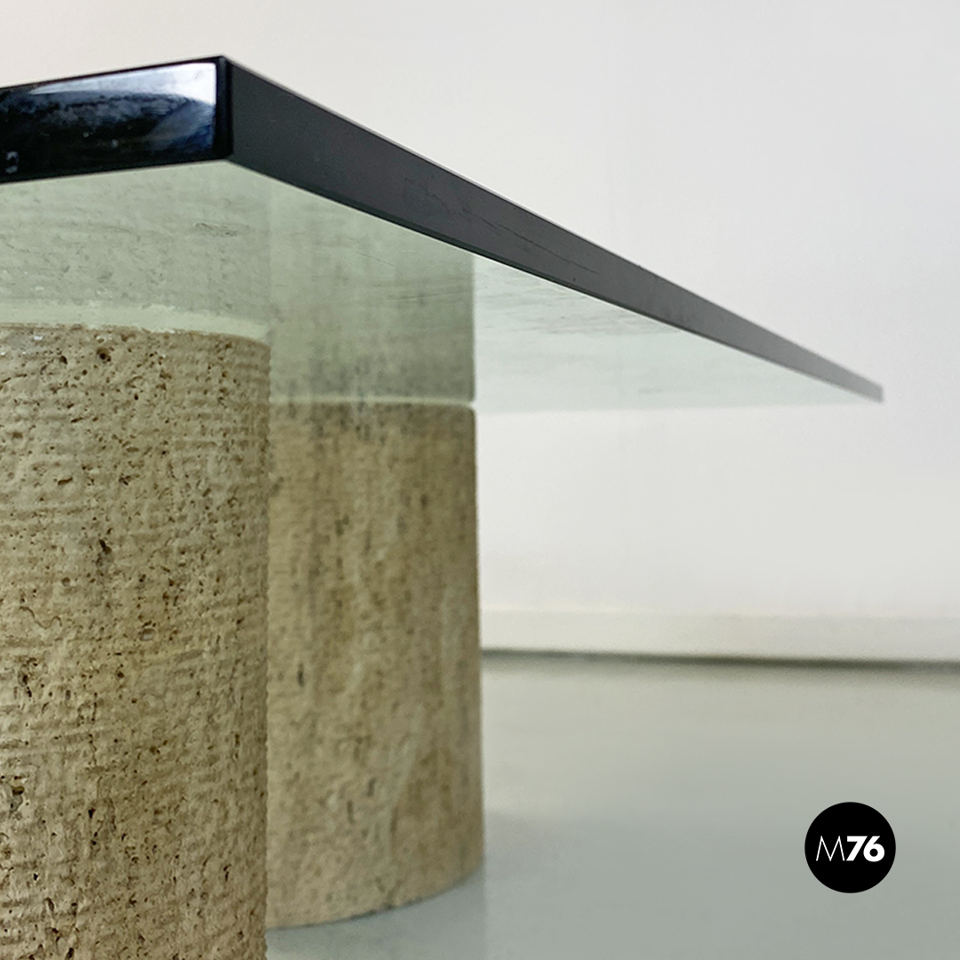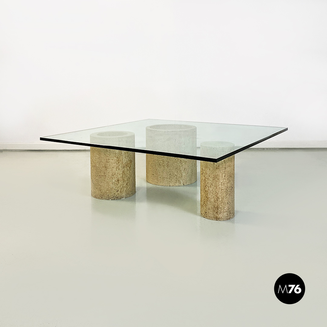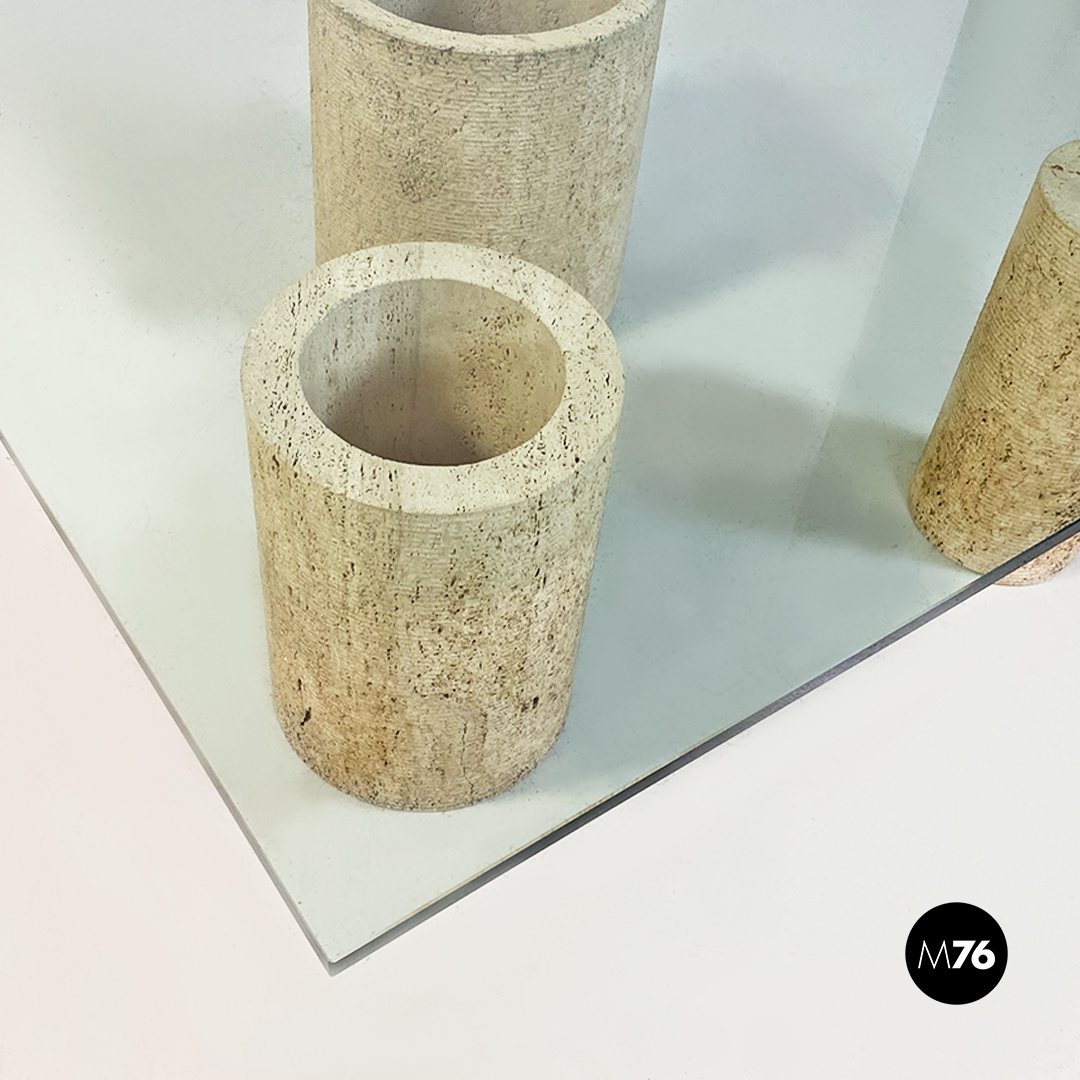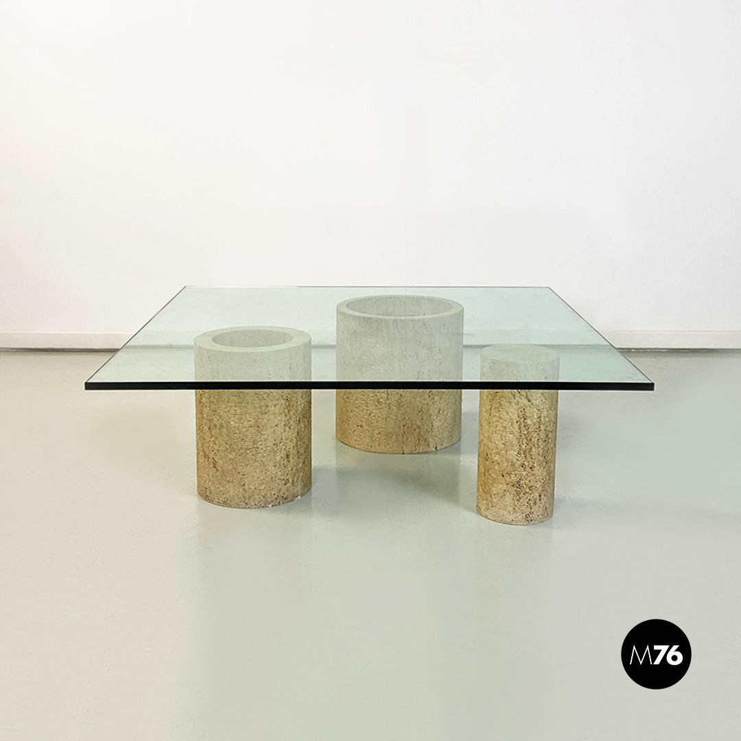 Tavolo da caffè modello Di Uno Tre in vetro e travertino composto da tre sculture cilindriche in travertino di cui due vuote ed una piena di varie dimensioni e piano in vetro verde acquamarina di forma quadrata.