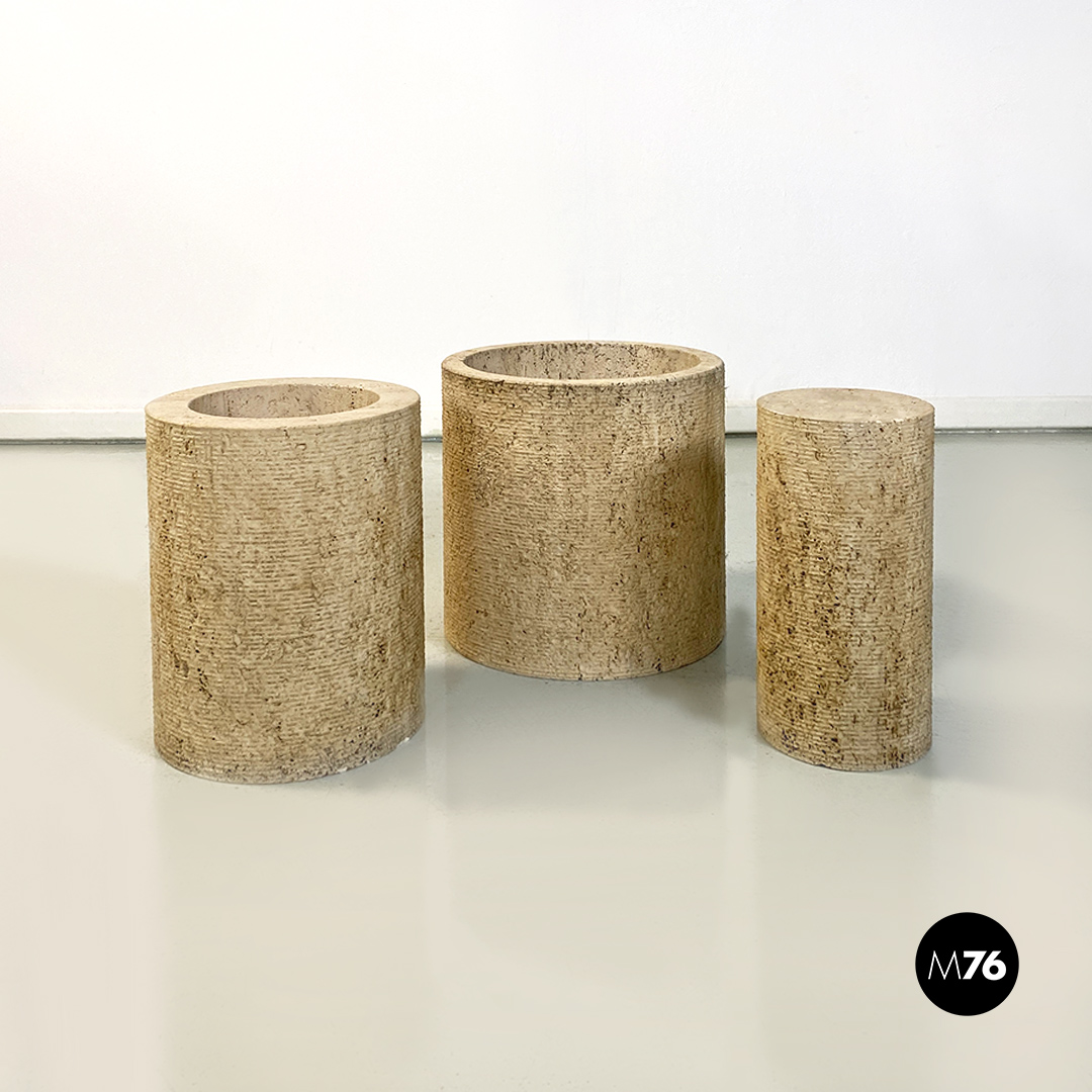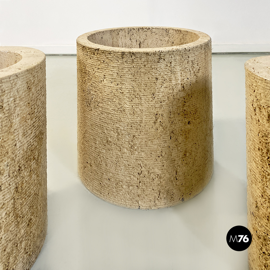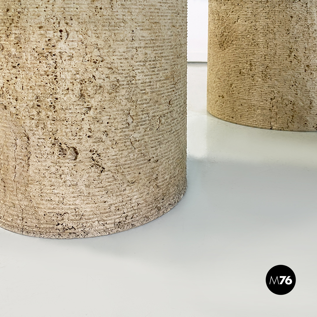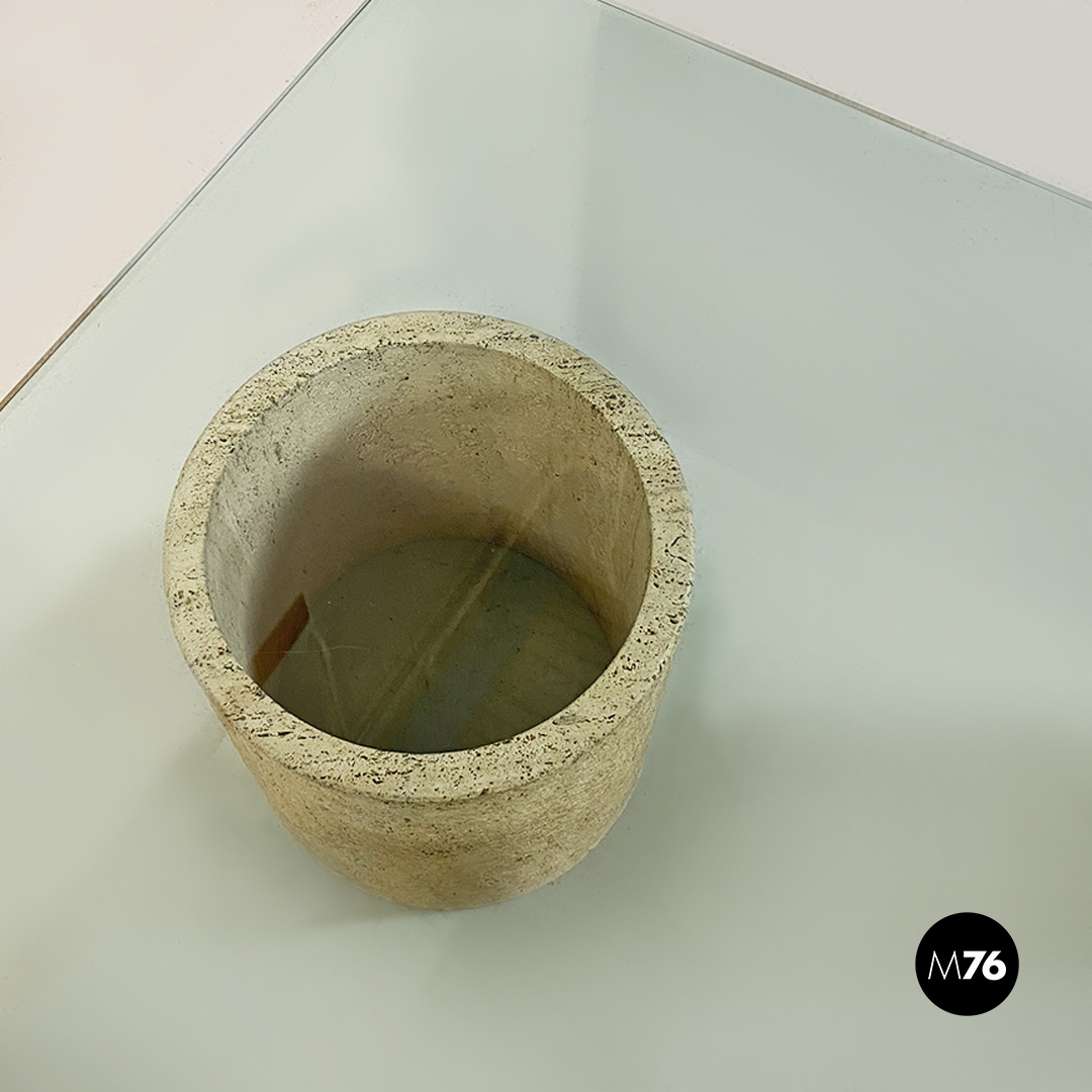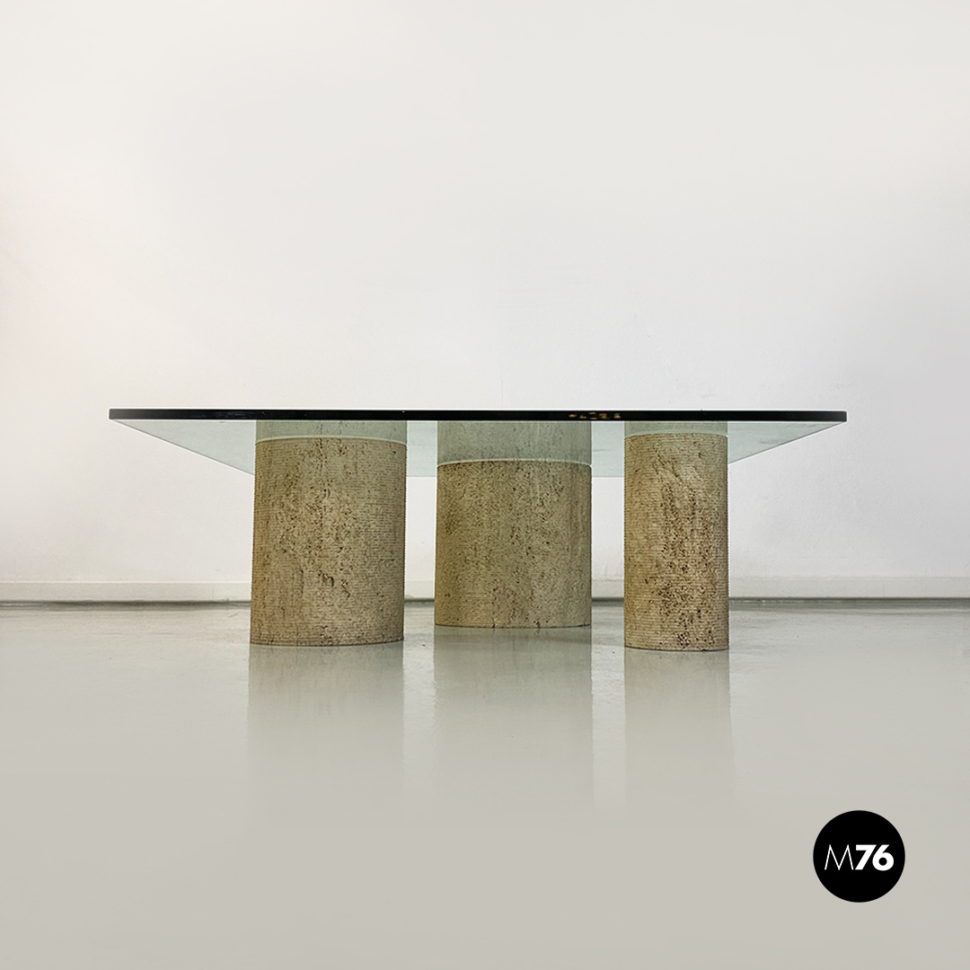 Tavolo da caffè modello Di Uno Tre in vetro e travertino composto da tre sculture cilindriche in travertino di cui due vuote ed una piena di varie dimensioni e piano in vetro verde acquamarina di forma quadrata.