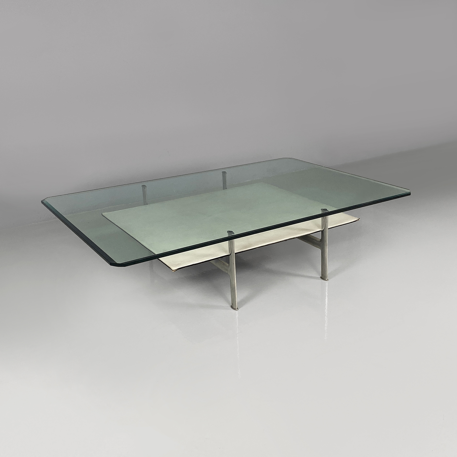 Tavolo da caffè modello Diesis, a due piani, uno in vetro trasparente molato e l’altro rivestito in cuoio bianco e con zampe in acciaio.